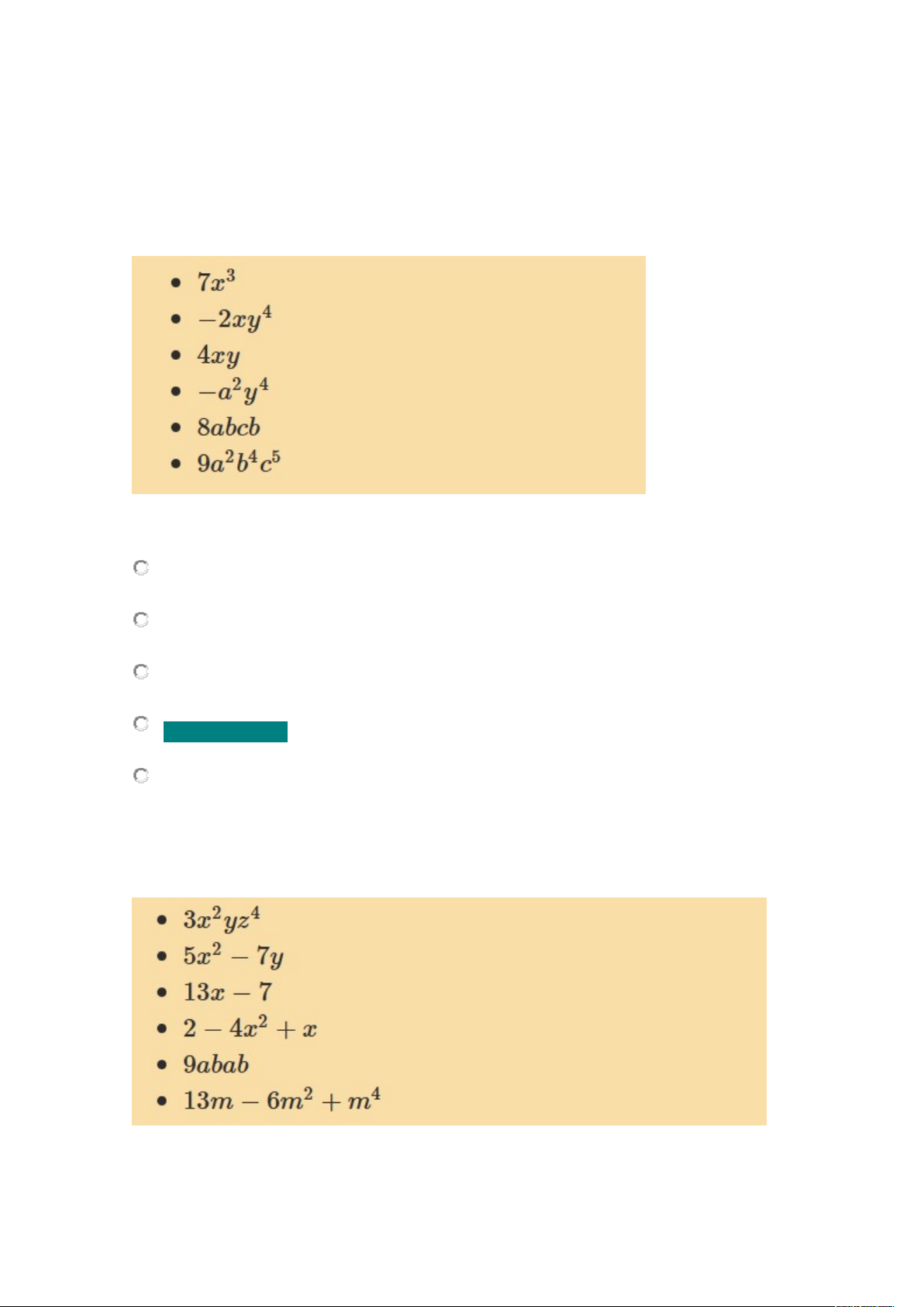 Expressões Algébricas – Avaliação 1. Veja os seguintes monômios: Os graus de cada monômio são, respectivamente: 1; 5; 1; 6; 3; 11 1; 4; 1; 4; 3; 5 3; 4; 2; 4; 4; 5 3; 4; 2; 6; 4; 11 Nenhuma das alternativas acima. 2. Veja as seguintes expressões algébricas Classificando-as como monômio, binômio ou trinômio, obtermos respectivamente: trinômio; trinômio; monômio; binômio; binômio; monômio trinômio; binômio; monômio; trinômio; binômio; trinômio monômio; trinômio; binômio; trinômio; monômio; trinômio monômio; trinômio; binômio; binômio; monômio; monômio Nenhuma das respostas acima 3. Identifique a forma completa de ordenar o polinômio segundo as potências decrescentes de x ALTERNATIVA CORRETA Nenhuma das alternativas acima. 4. Veja os seguintes termos semelhantes: Reduzindo os termos semelhantes quando possível, obtemos: ALTERNATIVA CORRETA 5. Veja as seguintes operações: Resolvendo as operações de monômios, obtemos: Nenhuma das alternativas acima. image3.png image4.wmf image5.png image6.png image7.png image8.png image9.png image10.png image11.png image12.png image13.png image14.png image15.png image16.png image17.png image18.png image19.png image20.png image1.png image2.wmf