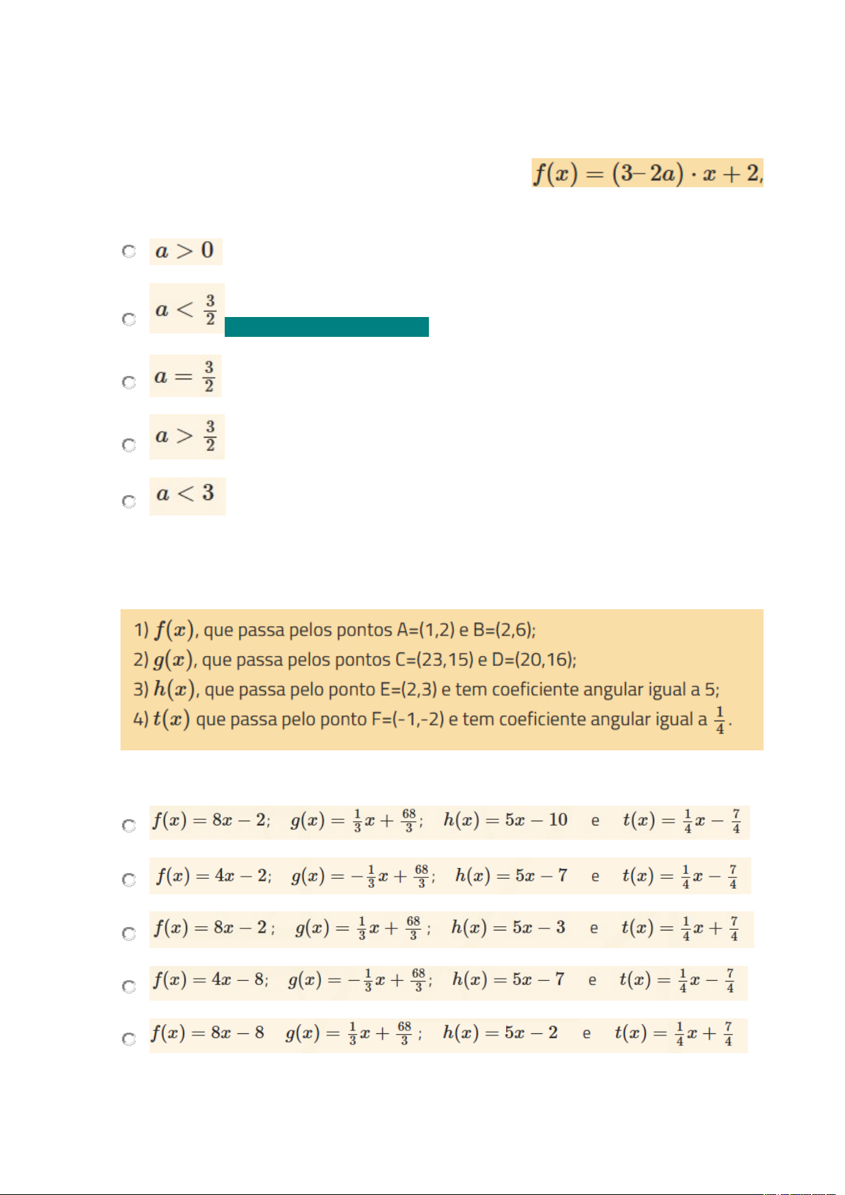 Função Linear – Avaliação (UFPI) A função real de variável real, definida por é crescente quando: ALTERNATIVA CORRETA 2. Determine, para cada item, a função que tenha as características descritas: Marque a alternativa que descreve a lei de cada uma das funções, respectivamente: 3. O gráfico da função f(x)=ax+b passa pelos pontos (2,3) e (-2,1). Os valores de a e b e outro ponto que a reta passa são, respectivamente: 4 .(ENEM 2017) Em um mês, uma loja de eletrônicos começa a obter lucro já na primeira semana. O gráfico representa o lucro (L) dessa loja desde o início do mês até o dia 20. Mas esse comportamento se estende até o último dia, o dia 30. A representação algébrica do lucro (L) em função tempo (t) é: L(t) = 20t + 3000 L(t) = 20t + 4000 L(t) = 200t L(t) = 20t -1000 L(t) = 200t + 3000 5. Uma empresa farmacêutica fez um estudo da eficácia (em porcentagem) de um medicamento durante 12 h de tratamento em um paciente. O medicamento foi administrado em duas doses, com espaçamento de 6 h entre elas. Assim que foi administrada a primeira dose, a eficácia do remédio cresceu linearmente durante 1 h, até atingir a máxima eficácia (100%), e permaneceu em máxima eficácia durante 2 h. Após essas 2 h em que a eficácia foi máxima, ela passou a diminuir linearmente, atingindo 20% de eficácia ao completar as 6 h iniciais de análise. Nesse momento, foi administrada a segunda dose, que passou a aumentar linearmente, atingindo a máxima eficácia após 0,5 h e permanecendo em 100% por 3,5 h. Nas horas restantes da análise, a eficácia decresceu linearmente, atingindo ao final do tratamento 50% de eficácia. Considerando as grandezas tempo (em hora), no eixo das abscissas; e eficácia do medicamento (em porcentagem), no eixo das ordenadas, qual é o gráfico que representa tal estudo? image5.png image6.png image7.png image8.png image9.png image10.png image11.png image12.png image13.png image14.png image15.png image16.png image17.png image18.png image19.png image1.png image20.png image21.png image22.png image2.wmf image23.png image24.png image3.png image4.png