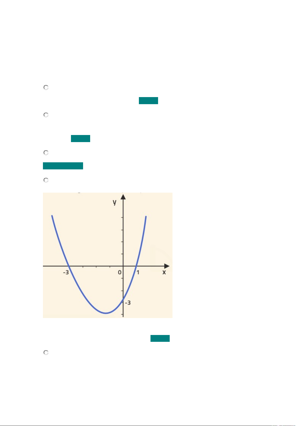 Função Quadrática – Avaliação 1. Julgue as afirmações sobre as funções a seguir como verdadeiras ou falsas. A concavidade a de um função quadrática interfere diretamente na posição em que o gráfico desta tocará o eixo y. FALSA O coeficiente b indica inclinação da reta tangente, ou seja, a inclinação que a parábola toma após transpassar o ponto onde que corte o eixo y – o ponto formado por (0, b). FALSA O coeficiente c indica o ponto em que a parábola transpassa o eixo y. VERDADEIRO Através do gráfico da função representada pode-se inferir que o valor da concavidade a é negativo, á que o gráfico atinge os quadrantes onde o x e y são negativos. FALSA Através do gráfico da função representada pode-se inferir que o valor de b é positivo, já que corresponde a inclinação da reta tangente ao ponto que transpassa o eixo y, no cado (0, 3) – que no caso é uma reta crescente. VERDADEIRA Através do gráfico da função representada no gráfico Pode-se inferir que o valor do coeficiente c da parábola é negativo, já que ele corresponde ao ponto que toca o eixo x. No caso, temos que c vale -3. FALSA Através do gráfico da função representada no gráfico Pode-se inferir que o valor da concavidade a da parábola é positiva. FALSA Através do gráfico da função representada no gráfico Pode-se inferir que o coeficiente c da parábola é igual a 2. VERDADEIRA Através do gráfico da função representada no gráfico Pode-se inferir que o discriminante possui valor positivo, com duas raízes reais diferentes. VERDADEIRA 2. Dadas as funções quadráticas abaixo: Quanto às raízes reais destas funções podemos afirmar que: 3. Qual o valor de c para que a função tenha zero real duplo 3 4 0 4. Verifique se os pontos pertencem a parábola e assinale a alternativa correta: 5. Determine o valor de k para que a função admita valor mínimo e assinale alternativa correta: k deve ser maior que 2 e menos que -2. basta k deve ser maior que 2. basta k deve ser menor que -2 k deve estar entre 2 d -2. Não existe solução real para que essa função tenha valor mínimo real image3.png image4.png image5.png image6.png image7.png image8.png image9.png image10.png image11.png image12.png image13.png image14.png image15.png image16.png image17.png image1.wmf image18.png image19.png image20.png image21.png image22.png image23.png image2.png