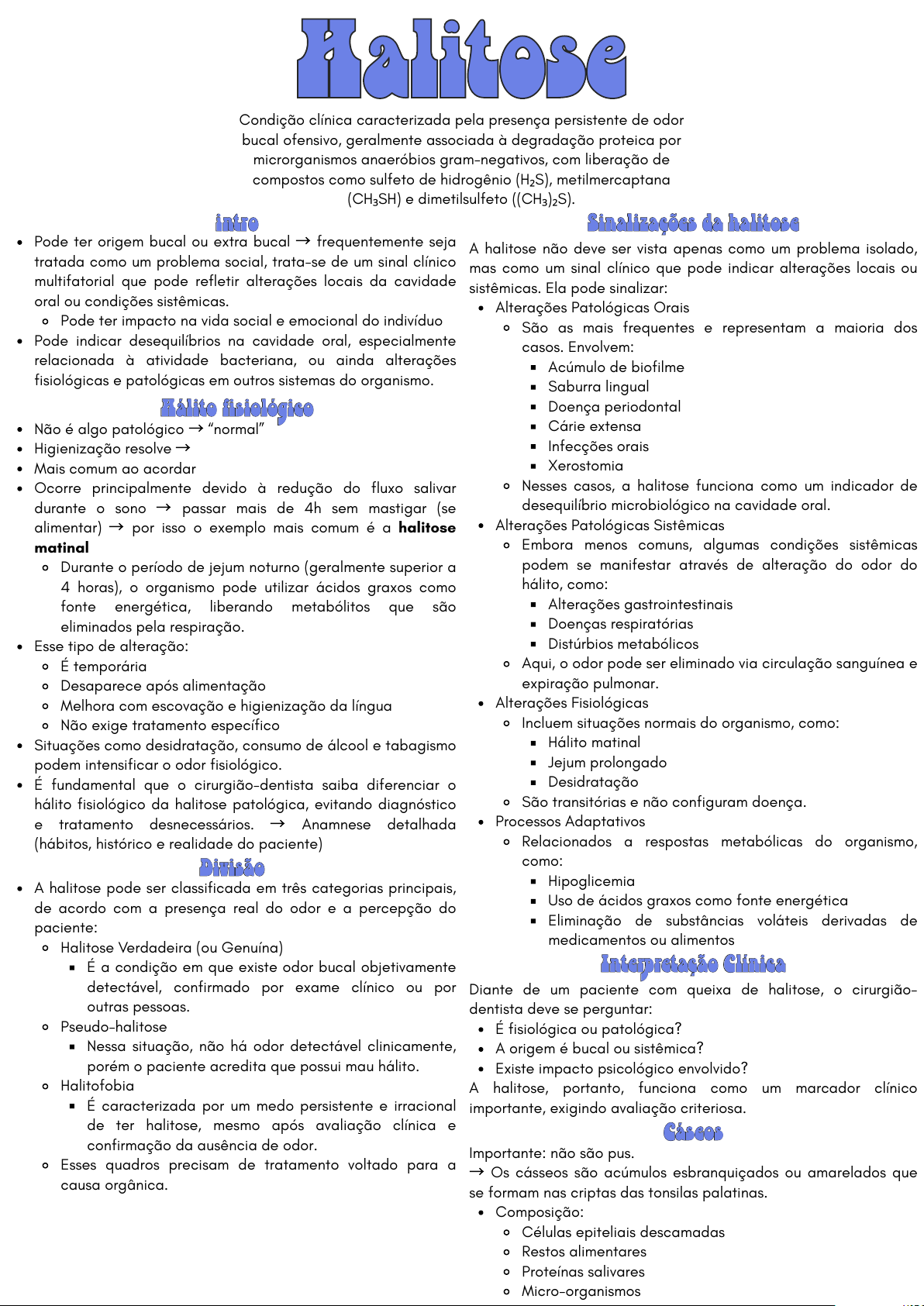 HalitoseHalitose Condição clínica caracterizada pela presença persistente de odor bucal ofensivo, geralmente associada à degradação proteica por microrganismos anaeróbios gram-negativos, com liberação de compostos como sulfeto de hidrogênio (H₂S), metilmercaptana (CH₃SH) e dimetilsulfeto ((CH₃)₂S). Pode ter origem bucal ou extra bucal → frequentemente seja tratada como um problema social, trata-se de um sinal clínico multifatorial que pode refletir alterações locais da cavidade oral ou condições sistêmicas. Pode ter impacto na vida social e emocional do indivíduo Pode indicar desequilíbrios na cavidade oral, especialmente relacionada à atividade bacteriana, ou ainda alterações fisiológicas e patológicas em outros sistemas do organismo. introintro Hálito fisiológicoHálito fisiológico Não é algo patológico → “normal” Higienização resolve → Mais comum ao acordar Ocorre principalmente devido à redução do fluxo salivar durante o sono → passar mais de 4h sem mastigar (se alimentar) → por isso o exemplo mais comum é a halitose matinal Durante o período de jejum noturno (geralmente superior a 4 horas), o organismo pode utilizar ácidos graxos como fonte energética, liberando metabólitos que são eliminados pela respiração. Esse tipo de alteração: É temporária Desaparece após alimentação Melhora com escovação e higienização da língua Não exige tratamento específico Situações como desidratação, consumo de álcool e tabagismo podem intensificar o odor fisiológico. É fundamental que o cirurgião-dentista saiba diferenciar o hálito fisiológico da halitose patológica, evitando diagnóstico e tratamento desnecessários. → Anamnese detalhada (hábitos, histórico e realidade do paciente) DivisãoDivisão A halitose pode ser classificada em três categorias principais, de acordo com a presença real do odor e a percepção do paciente: Halitose Verdadeira (ou Genuína) É a condição em que existe odor bucal objetivamente detectável, confirmado por exame clínico ou por outras pessoas. Pseudo-halitose Nessa situação, não há odor detectável clinicamente, porém o paciente acredita que possui mau hálito. Halitofobia É caracterizada por um medo persistente e irracional de ter halitose, mesmo após avaliação clínica e confirmação da ausência de odor. Esses quadros precisam de tratamento voltado para a causa orgânica. Sinalizações da halitoseSinalizações da halitose A halitose não deve ser vista apenas como um problema isolado, mas como um sinal clínico que pode indicar alterações locais ou sistêmicas. Ela pode sinalizar: Alterações Patológicas Orais São as mais frequentes e representam a maioria dos casos. Envolvem: Acúmulo de biofilme Saburra lingual Doença periodontal Cárie extensa Infecções orais Xerostomia Nesses casos, a halitose funciona como um indicador de desequilíbrio microbiológico na cavidade oral. Alterações Patológicas Sistêmicas Embora menos comuns, algumas condições sistêmicas podem se manifestar através de alteração do odor do hálito, como: Alterações gastrointestinais Doenças respiratórias Distúrbios metabólicos Aqui, o odor pode ser eliminado via circulação sanguínea e expiração pulmonar. Alterações Fisiológicas Incluem situações normais do organismo, como: Hálito matinal Jejum prolongado Desidratação São transitórias e não configuram doença. Processos Adaptativos Relacionados a respostas metabólicas do organismo, como: Hipoglicemia Uso de ácidos graxos como fonte energética Eliminação de substâncias voláteis derivadas de medicamentos ou alimentos Interpretação ClínicaInterpretação Clínica Diante de um paciente com queixa de halitose, o cirurgião- dentista deve se perguntar: É fisiológica ou patológica? A origem é bucal ou sistêmica? Existe impacto psicológico envolvido? A halitose, portanto, funciona como um marcador clínico importante, exigindo avaliação criteriosa. CáseosCáseos Importante: não são pus. → Os cásseos são acúmulos esbranquiçados ou amarelados que se formam nas criptas das tonsilas palatinas. Composição: Células epiteliais descamadas Restos alimentares Proteínas salivares Micro-organismos Com o tempo, esse material sofre degradação bacteriana, principalmente por bactérias anaeróbias, levando à produção de compostos sulfurados e outras substâncias voláteis responsáveis pelo odor forte e desagradável. Origem: Origem bucal – 90 a 95% dos casos Origem extra-bucal – 5 a 10% dos casos Conduta: O cirurgião-dentista deve identificar a presença de cásseos, mas o tratamento definitivo é de responsabilidade do otorrinolaringologista. Pode-se orientar o paciente quanto a gargarejos e higiene adequada, mas não é função do CD manipular profundamente as tonsilas. CausasCausas → Causas orais: Gengivites e periodontites Presença de bolsas periodontais Acúmulo de biofilme subgengival Maior atividade de bactérias anaeróbias gram-negativas A periodontite está especialmente associada à produção de metilmercaptana. Glossite A glossite (processo inflamatório da língua) pode contribuir para halitose porque: Pode aumentar a descamação epitelial Pode alterar a morfologia da superfície lingual Favorece retenção de resíduos Pode estar associada à infecção secundária Qualquer condição que altere o dorso da língua impacta diretamente na produção de compostos odoríferos. Candidíase oral Infecção fúngica que pode gerar alterações inflamatórias e aumento de substrato orgânico. Tumores da cavidade oral Tumores orais, especialmente os malignos, podem causar halitose quando apresentam: Ulceração da superfície Necrose tecidual Infecção secundária Acúmulo de detritos necróticos A degradação de tecido necrótico por bactérias anaeróbias leva à produção de compostos voláteis sulfurados e aminas (como putrescina e cadaverina), responsáveis pelo od