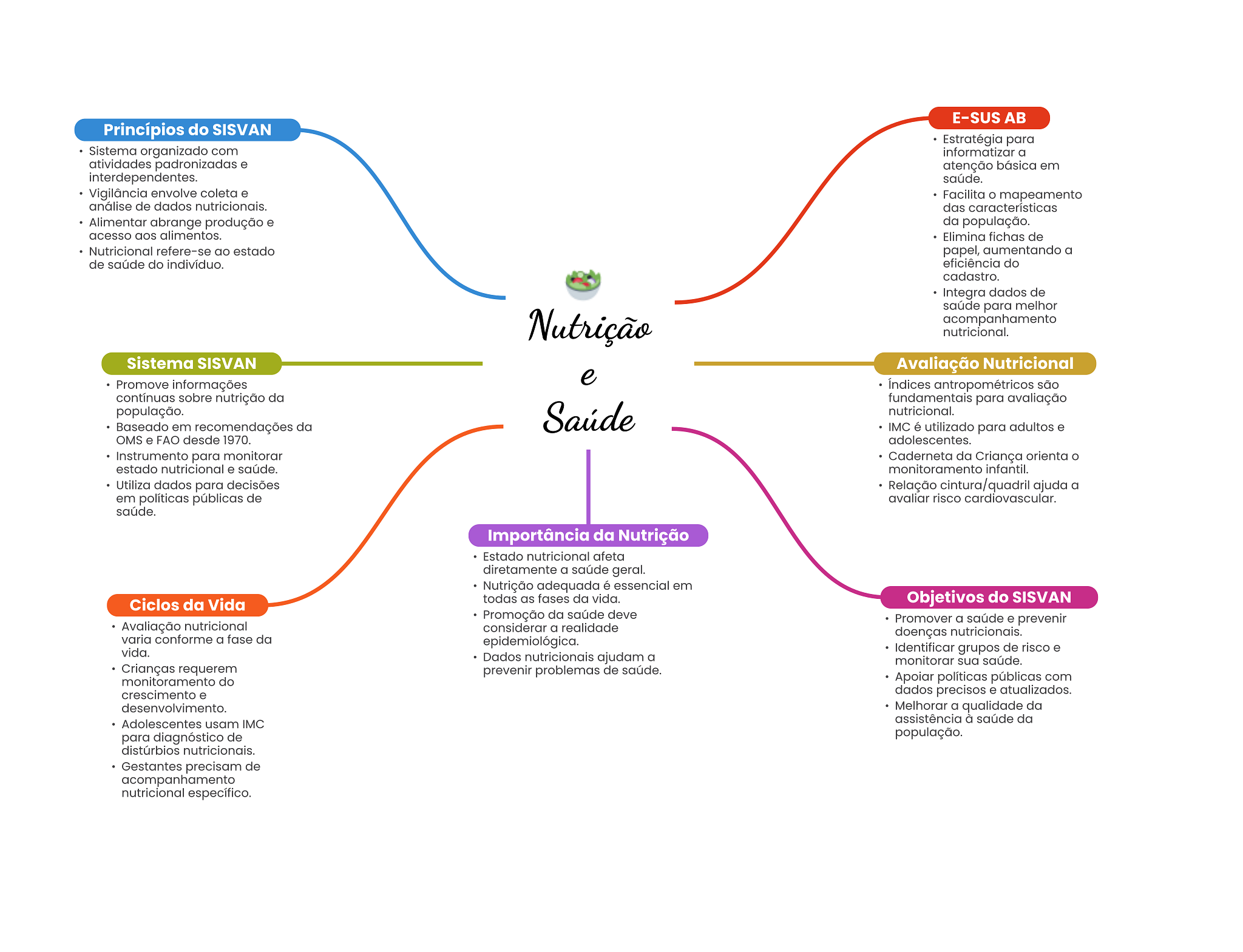 E-SUS AB Princípios do SISVAN Estratégia para Sistema organizado com informatizar a atividades padronizadas e atenção básica em interdependentes. saúde. Vigilância envolve coleta e Facilita mapeamento análise de dados nutricionais. das características Alimentar abrange produção e da população. acesso aos alimentos. Elimina fichas de Nutricional refere-se ao estado papel, aumentando a de saúde do indivíduo. eficiência do cadastro. Integra dados de saúde para melhor Nutrição acompanhamento nutricional. Sistema SISVAN Avaliação Nutricional e Promove informações Índices antropométricos são contínuas sobre nutrição da fundamentais para avaliação população. Baseado em recomendações da Saúde nutricional. IMC é utilizado para adultos e OMS e FAO desde 1970. adolescentes. Instrumento para monitorar Caderneta da Criança orienta estado nutricional e saúde. monitoramento infantil. Utiliza dados para decisões Relação cintura/quadril ajuda a em políticas públicas de avaliar risco cardiovascular. saúde. Importância da Nutrição Estado nutricional afeta diretamente a saúde geral. Nutrição adequada é essencial em Ciclos da Vida todas as fases da vida. Objetivos do SISVAN Promoção da saúde deve Promover a saúde e prevenir Avaliação nutricional considerar a realidade doenças nutricionais. varia conforme a fase da epidemiológica. vida. Identificar grupos de risco e Dados nutricionais ajudam a monitorar sua saúde. Crianças requerem prevenir problemas de saúde. monitoramento do Apoiar políticas públicas com crescimento e dados precisos e atualizados. desenvolvimento. Melhorar a qualidade da Adolescentes usam IMC assistência à saúde da para diagnóstico de população. distúrbios nutricionais. Gestantes precisam de acompanhamento nutricional específico.