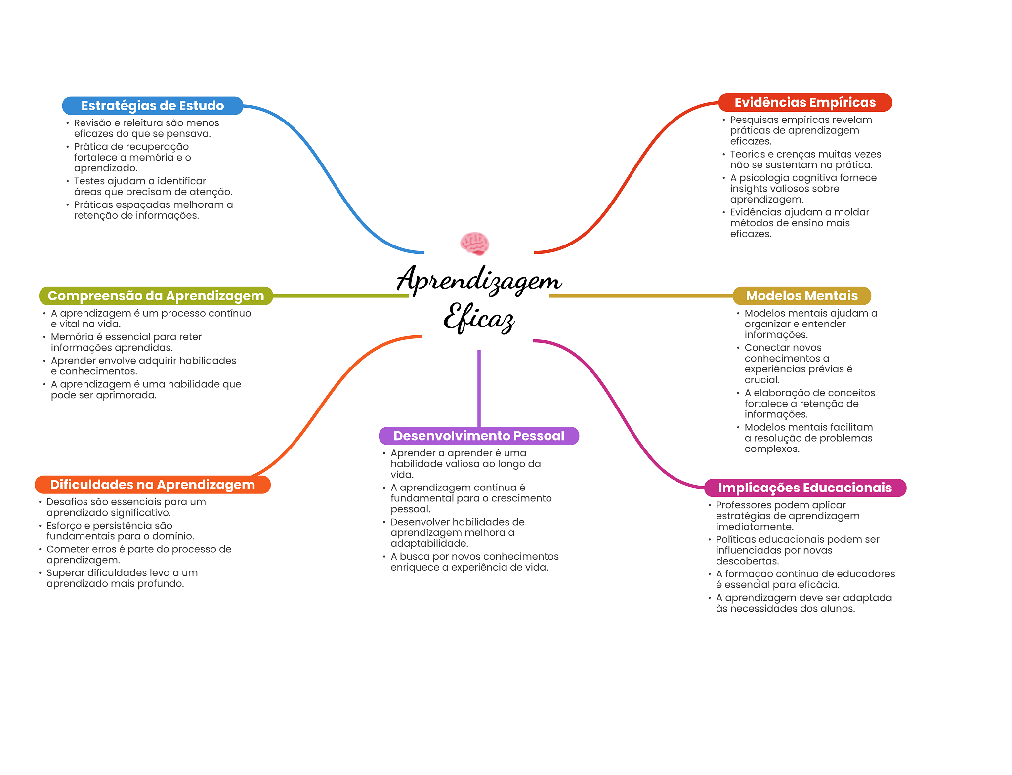 Estratégias de Estudo Evidências Empíricas Revisão e releitura são menos Pesquisas empíricas revelam eficazes do que se pensava. práticas de aprendizagem eficazes. Prática de recuperação fortalece a memória e Teorias e crenças muitas vezes aprendizado. não se sustentam na prática. Testes ajudam a identificar A psicologia cognitiva fornece áreas que precisam de atenção. insights valiosos sobre Práticas espaçadas melhoram a aprendizagem. retenção de informações. Evidências ajudam a moldar métodos de ensino mais eficazes. Aprendizagem Compreensão da Aprendizagem Modelos Mentais A aprendizagem é um processo contínuo Eficaz Modelos mentais ajudam a e vital na vida. organizar e entender Memória é essencial para reter informações. informações aprendidas. Conectar novos Aprender envolve adquirir habilidades conhecimentos a e conhecimentos. experiências prévias é A aprendizagem é uma habilidade que crucial. pode ser aprimorada. A elaboração de conceitos fortalece a retenção de informações. Modelos mentais facilitam Desenvolvimento Pessoal a resolução de problemas Aprender a aprender é uma complexos. habilidade valiosa ao longo da vida. Dificuldades na Aprendizagem A aprendizagem contínua é Implicações Educacionais Desafios são essenciais para um fundamental para crescimento aprendizado significativo. pessoal. Professores podem aplicar Esforço e persistência são Desenvolver habilidades de estratégias de aprendizagem imediatamente. fundamentais para domínio. aprendizagem melhora a adaptabilidade. Políticas educacionais podem ser Cometer erros é parte do processo de influenciadas por novas aprendizagem. A busca por novos conhecimentos descobertas. Superar dificuldades leva a um enriquece a experiência de vida. A formação contínua de educadores aprendizado mais profundo. é essencial para eficácia. A aprendizagem deve ser adaptada às necessidades dos alunos.
