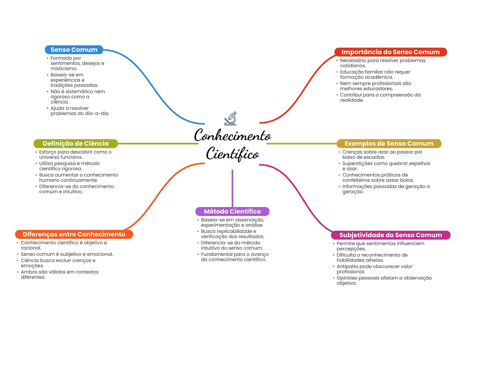 Senso Comum Importância do Senso Comum Formado por Necessário para resolver problemas sentimentos, desejos e cotidianos. misticismo. Baseia-se em Educação familiar não requer formação acadêmica. experiências e tradições passadas. Nem sempre profissionais são melhores educadores. Não é sistemático nem rigoroso como a Contribui para a compreensão da ciência. realidade. Ajuda a resolver problemas do dia-a-dia. Conhecimento Definição de Ciência Exemplos de Senso Comum Esforço para descobrir como O Científico Crenças sobre azar ao passar por Universo funciona. baixo de escadas. Utiliza pesquisa e método Superstições como quebrar espelhos científico rigoroso. e azar. Busca aumentar conhecimento Conhecimentos práticos de humano continuamente. confeiteiros sobre assar bolos. Diferencia-se do conhecimento Informações passadas de geração a comum e intuitivo. geração. Método Científico Baseia-se em observação, experimentação e análise. Diferenças entre Conhecimento Busca replicabilidade e verificação dos resultados. Subjetividade do Senso Comum Conhecimento científico é objetivo e Diferencia-se do método Permite que sentimentos influenciem racional. intuitivo do senso comum. percepções. Senso comum é subjetivo e emocional. Fundamental para avanço Dificulta O reconhecimento de Ciência busca excluir crenças e do conhecimento científico. habilidades alheias. emoções. Antipatia pode obscurecer valor Ambos são válidos em contextos profissional. diferentes. Opiniões pessoais afetam a observação objetiva.