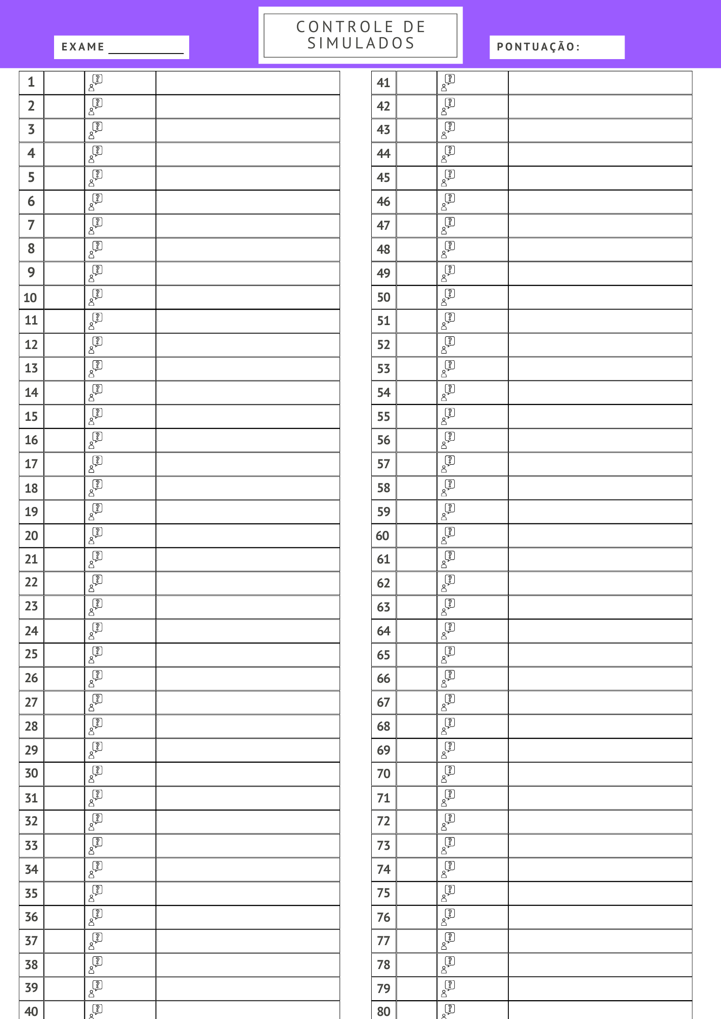 CONTROLE DE EXAME SIMULADOS PONTUAÇÃO: 1 41 ? 2 ? 42 ? Do Do 3 ? 43 ? Do 4 ? 44 Do 5 45 Do 6 ? 46 ? Do Do 7 47 ? Do Do 8 ? 48 ? Do 9 ? 49 Do 8 10 50 ? Do 11 ? 51 ? Do 12 ? 52 ? Do 13 ? 8 53 8 14 54 ? 8 15 ? 55 ? Do 8 16 ? 56 ? 17 ? 57 ? 8 18 58 ? 8 19 59 ? 20 ? 60 ? 8 21 ? 61 ? Do Do 22 ? Do 62 ? 23 ? 63 ? 24 64 ? 25 ? 65 ? Do Do 26 66 ? Do Do 27 ? 67 ? Do Do 28 68 Do 29 69 ? Do 30 ? 70 ? Do Do 31 Do 71 ? 32 ? 72 ? Do Do 33 ? 73 ? Do Do 34 ? 74 Do Do 35 75 ? 8 36 ? 76 Do Do 37 77 ? Do Do 38 78 Do 39 79 Do 8 40 ? 80 ?