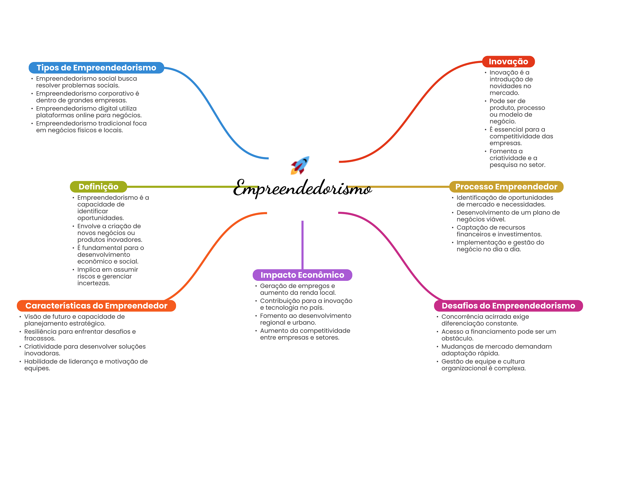Inovação Tipos de Empreendedorismo Inovação é a Empreendedorismo social busca introdução de resolver problemas sociais. novidades no Empreendedorismo corporativo é mercado. dentro de grandes empresas. Pode ser de Empreendedorismo digital utiliza produto, processo plataformas online para negócios. ou modelo de Empreendedorismo tradicional foca negócio. em negócios físicos e locais. É essencial para a competitividade das empresas. Fomenta a criatividade e a pesquisa no setor. Definição Empreendedorismo Processo Empreendedor Empreendedorismo é a Identificação de oportunidades capacidade de de mercado e necessidades. identificar Desenvolvimento de um plano de oportunidades. negócios viável. Envolve a criação de Captação de recursos novos negócios ou financeiros e investimentos. produtos inovadores. Implementação e gestão do É fundamental para O negócio no dia a dia. desenvolvimento econômico e social. Implica em assumir riscos e gerenciar Impacto Econômico incertezas. Geração de empregos e aumento da renda local. Contribuição para a inovação Características do Empreendedor e tecnologia no país. Desafios do Empreendedorismo Visão de futuro e capacidade de Fomento ao desenvolvimento Concorrência acirrada exige planejamento estratégico. regional e urbano. diferenciação constante. Resiliência para enfrentar desafios e Aumento da competitividade Acesso a financiamento pode ser um fracassos. entre empresas e setores. obstáculo. Criatividade para desenvolver soluções Mudanças de mercado demandam inovadoras. adaptação rápida. Habilidade de liderança e motivação de Gestão de equipe e cultura equipes. organizacional é complexa.