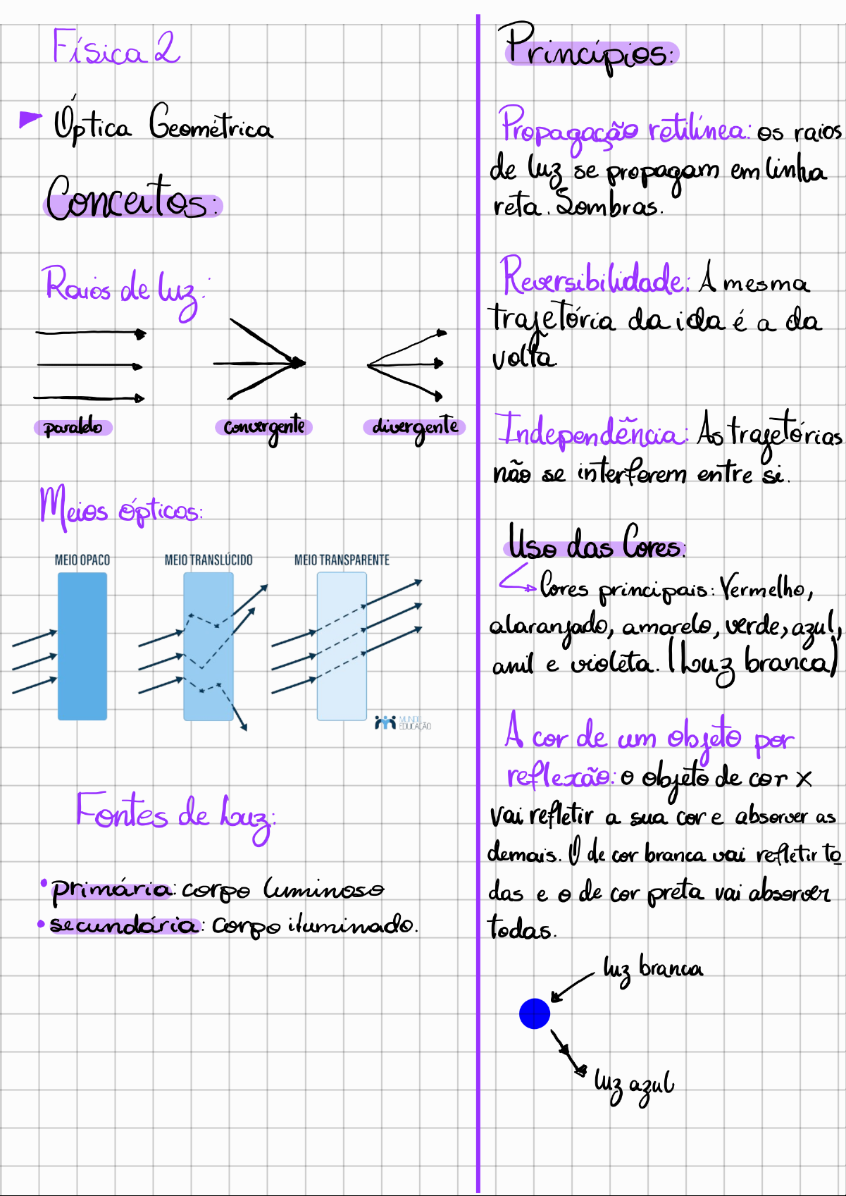 Física 2 Principios: Uptica Geométrica Propagação retilinea: os raios Concertos: de se propagam em linha reta. Sombras. Raios de luz. A mesma da ida é a da volta convergente divergente As não se interferem entre Meios Use das Cores: MEIO OPACO MEIO TRANSLUCIDO MEIO TRANSPARENTE Cores principais: Vermelho, alaranjado, amarelo, verde, azul, anil e branca) MUNDO EDUCAÇÃO A cor de um objeto per reflexão: objeto de cor X Fontes de Vai refletir a sua cor e absorver as demais. de cor branca vai refletir to corpo luminoso das e de cor preta vai absorver iluminado. todas. luz branca luz azulAplicações Câmara escura: D i d i D d Calailo de Sombra: Sol H prédio oste H S 11 h 5 h 15 3 $ sReflexão da Louz RI: incidente; Ri RR RR: Raio refletido; n Reta normal (perpendicular); i r i de incidencia; de reflexão; S r S: refletora. Espelhos planos. P atenção! a imagem é sempre Simetrica do objeto em relação ao espelho. "Espelhy imagem ele forma imagens virtual imagens revertidas. Associação de espelhos planos n= = 360 1 de angulo imagens