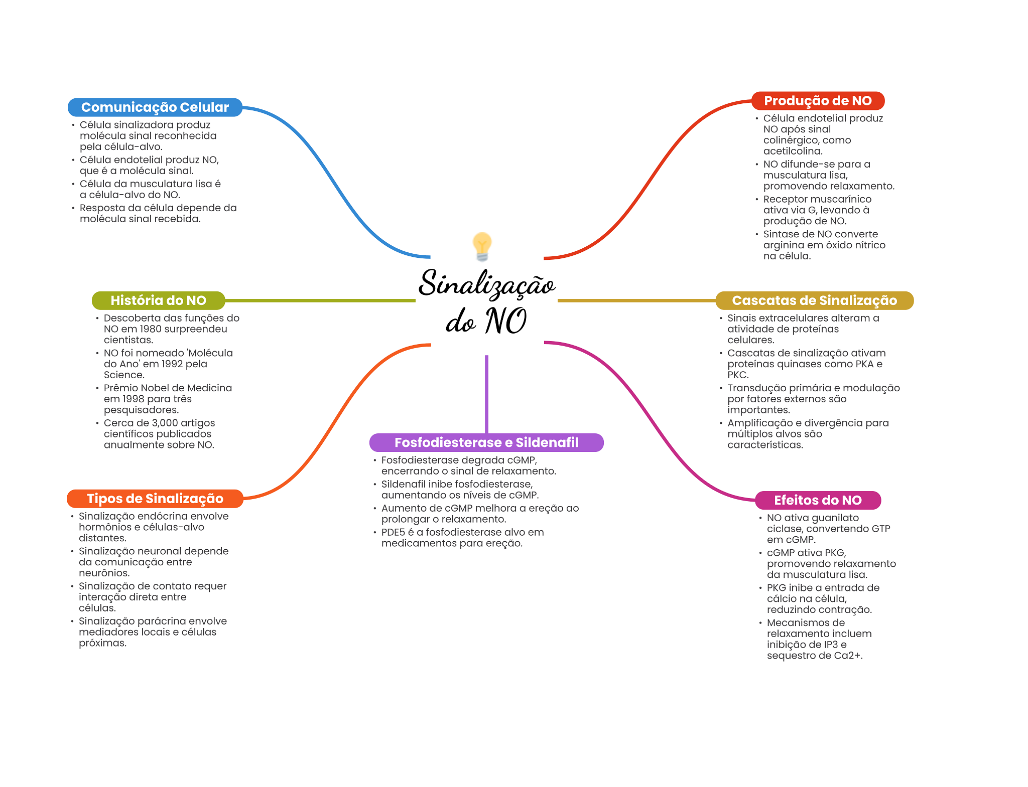 Comunicação Celular Produção de NO Célula endotelial produz Célula sinalizadora produz NO após sinal molécula sinal reconhecida colinérgico, como pela célula-alvo. acetilcolina. Célula endotelial produz NO, NO difunde-se para a que é a molécula sinal. musculatura lisa, Célula da musculatura lisa é promovendo relaxamento. a célula-alvo do NO. Receptor muscarínico Resposta da célula depende da ativa via G, levando à molécula sinal recebida. produção de NO. Sintase de NO converte arginina em óxido nítrico na célula. Sinalização História do NO Cascatas de Sinalização Descoberta das funções do do NO Sinais extracelulares alteram a NO em 1980 surpreendeu atividade de proteínas cientistas. celulares. NO foi nomeado Cascatas de sinalização ativam do Ano' em 1992 pela proteínas quinases como e Science. PKC. Prêmio Nobel de Medicina Transdução primária e modulação em 1998 para três por fatores externos são pesquisadores. importantes. Cerca de 3,000 artigos Amplificação e divergência para científicos publicados múltiplos alvos são anualmente sobre NO. Fosfodiesterase e Sildenafil características. Fosfodiesterase degrada cGMP, encerrando sinal de relaxamento. Sildenafil inibe fosfodiesterase, Tipos de Sinalização aumentando níveis de cGMP. Efeitos do NO Aumento de cGMP melhora a ereção ao Sinalização endócrina envolve prolongar relaxamento. NO ativa guanilato hormônios e células-alvo PDE5 é a fosfodiesterase alvo em ciclase, convertendo GTP distantes. medicamentos para ereção. em cGMP. Sinalização neuronal depende cGMP ativa PKG, da comunicação entre promovendo relaxamento neurônios. da musculatura lisa. Sinalização de contato requer PKG inibe a entrada de interação direta entre cálcio na célula, células. reduzindo contração. Sinalização parácrina envolve Mecanismos de mediadores locais e células relaxamento incluem próximas. inibição de IP3 e sequestro de Ca2+.