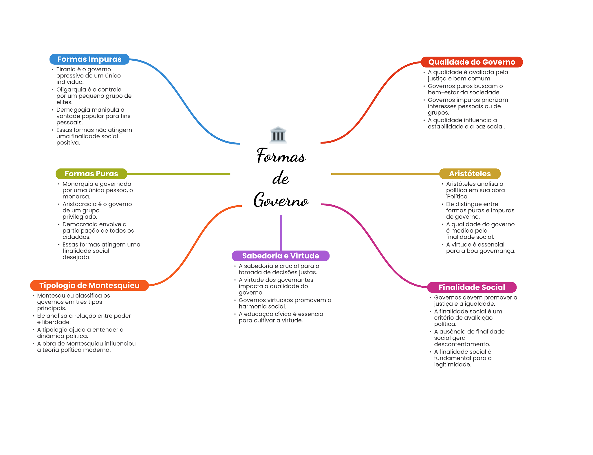 Formas Impuras Qualidade do Governo Tirania é governo opressivo de um único A qualidade é avaliada pela indivíduo. justiça e bem comum. Oligarquia é controle Governos puros buscam bem-estar da sociedade. por um pequeno grupo de elites. Governos impuros priorizam interesses pessoais ou de Demagogia manipula a vontade popular para fins grupos. pessoais. A qualidade influencia a estabilidade e a paz social. Essas formas não atingem uma finalidade social positiva. Formas Formas Puras de Aristóteles Monarquia é governada Aristóteles analisa a por uma única pessoa, política em sua obra monarca. Governo Aristocracia é O governo Ele distingue entre de um grupo formas puras e impuras privilegiado. de governo. Democracia envolve a A qualidade do governo participação de todos é medida pela cidadãos. finalidade social. Essas formas atingem uma A virtude é essencial finalidade social para a boa governança. desejada. Sabedoria e Virtude A sabedoria é crucial para a tomada de decisões justas. A virtude dos governantes Tipologia de Montesquieu impacta a qualidade do Finalidade Social Montesquieu classifica governo. governos em três tipos Governos virtuosos promovem a Governos devem promover a harmonia social. justiça e a igualdade. principais. A finalidade social é um Ele analisa a relação entre poder A educação cívica é essencial para cultivar a virtude. critério de avaliação e liberdade. política. A tipologia ajuda a entender a A ausência de finalidade dinâmica política. social gera A obra de Montesquieu influenciou descontentamento. a teoria política moderna. A finalidade social é fundamental para a legitimidade.