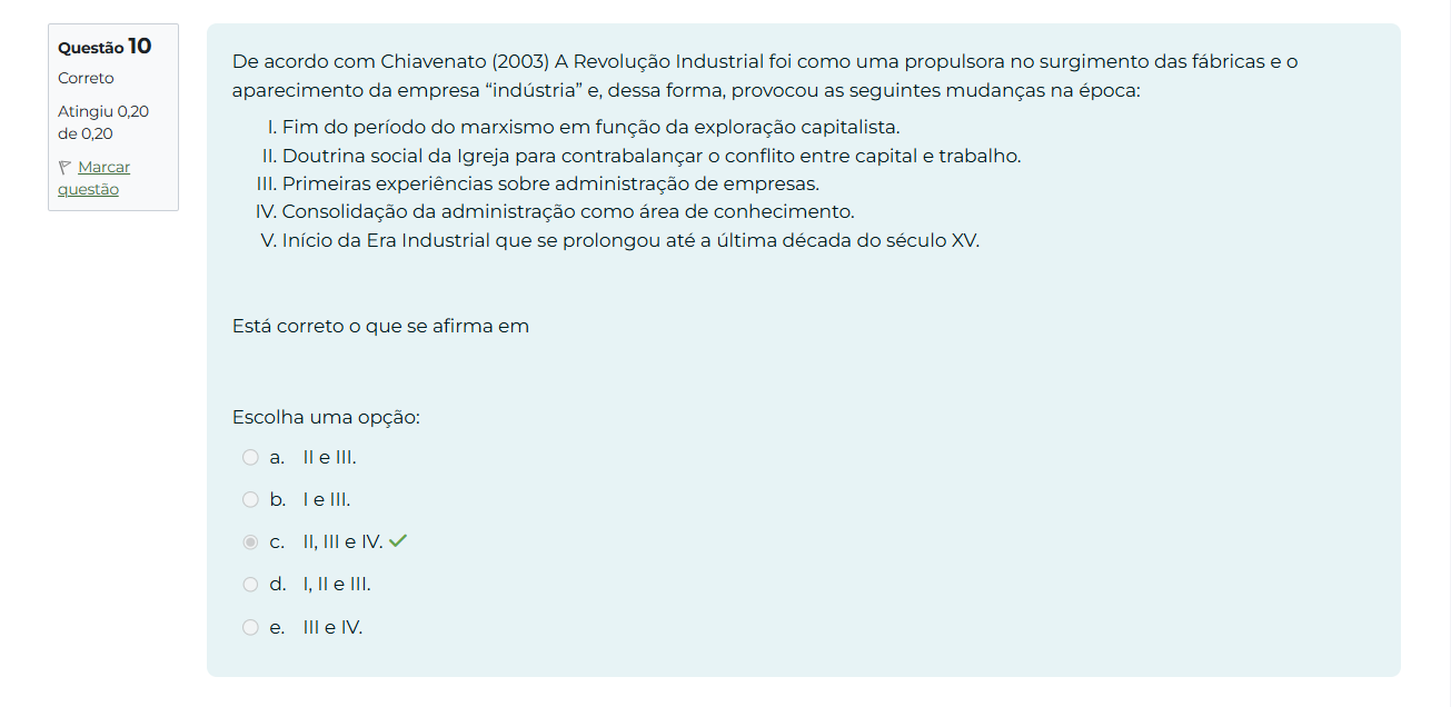 10 De acordo com Chiavenato (2003) A Revolução Industrial foi como uma propulsora no surgimento das fábricas e O aparecimento da empresa "indústria" e, dessa forma, provocou as seguintes mudanças na época: giu 0,20 Fim do período do marxismo em função da exploração capitalista. II. Doutrina social da Igreja para contrabalançar O conflito entre capital e trabalho. III. Primeiras experiências sobre administração de empresas. IV. Consolidação da administração como área de conhecimento. V. Início da Era Industrial que se prolongou até a última década do século XV. Está correto O que se afirma em Escolha uma opção: a. II e III. b. III. C. II, III e IV. d. I, II e III. e. III e IV.
