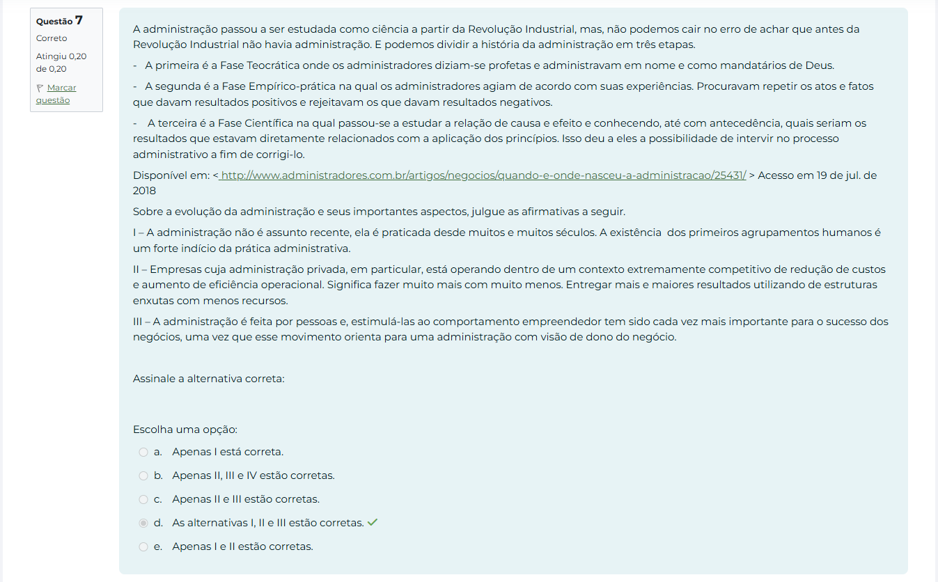 Questão 7 A administração passou a ser estudada como ciência a partir da Revolução Industrial, mas, não podemos cair no erro de achar que antes da Correto Revolução Industrial não havia administração. E podemos dividir a história da administração em três etapas. Atingiu 0,20 de 0,20 A primeira é a Fase Teocrática onde administradores diziam-se profetas e administravam em nome e como mandatários de Deus. Marcar A segunda é a Fase Empírico-prática na qual administradores agiam de acordo com suas experiências. Procuravam repetir atos e fatos questão que davam resultados positivos e rejeitavam que davam resultados negativos. A terceira é a Fase Científica na qual passou-se a estudar a relação de causa e efeito e conhecendo, até com antecedência, quais seriam resultados que estavam diretamente relacionados com a aplicação dos princípios. Isso deu a eles a possibilidade de intervir no processo administrativo a fim de corrigi-lo. Disponível em: