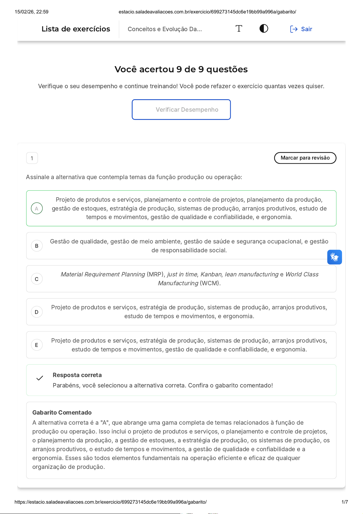 Você acertou 9 de 9 questões Verifique o seu desempenho e continue treinando! Você pode refazer o exercício quantas vezes quiser. Verificar Desempenho A B C D E 1 Marcar para revisão Assinale a alternativa que contempla temas da função produção ou operação: Projeto de produtos e serviços, planejamento e controle de projetos, planejamento da produção, gestão de estoques, estratégia de produção, sistemas de produção, arranjos produtivos, estudo de tempos e movimentos, gestão de qualidade e confiabilidade, e ergonomia. Gestão de qualidade, gestão de meio ambiente, gestão de saúde e segurança ocupacional, e gestão de responsabilidade social. Material Requirement Planning (MRP), just in time, Kanban, lean manufacturing e World Class Manufacturing (WCM). Projeto de produtos e serviços, estratégia de produção, sistemas de produção, arranjos produtivos, estudo de tempos e movimentos, e ergonomia. Projeto de produtos e serviços, estratégia de produção, sistemas de produção, arranjos produtivos, estudo de tempos e movimentos, gestão de qualidade e confiabilidade, e ergonomia. Resposta correta Parabéns, você selecionou a alternativa correta. Confira o gabarito comentado! Gabarito Comentado A alternativa correta é a "A", que abrange uma gama completa de temas relacionados à função de produção ou operação. Isso inclui o projeto de produtos e serviços, o planejamento e controle de projetos, o planejamento da produção, a gestão de estoques, a estratégia de produção, os sistemas de produção, os arranjos produtivos, o estudo de tempos e movimentos, a gestão de qualidade e confiabilidade e a ergonomia. Esses são todos elementos fundamentais na operação eficiente e eficaz de qualquer organização de produção. Lista de exercícios Conceitos e Evolução Da… Sair 15/02/26, 22:59 estacio.saladeavaliacoes.com.br/exercicio/699273145dc6e19bb99a996a/gabarito/ https://estacio.saladeavaliacoes.com.br/exercicio/699273145dc6e19bb99a996a/gabarito/ 1/7 A B C D E A B C 2 Marcar para revisão A Teorias da administração clássica, das relações humanas e neoclássica diferem em diversos aspectos. Em relação às funções administrativas, entretanto, elas estão alinhadas. São funções do processo administrativo: Planejamento, organização, direção e controle. Programação, comando, coordenação e orçamento. Planejamento, orçamento, liderança e comando. Previsão, direção, coordenação e controle. Investigação, comando, administração de pessoal e informação. Resposta correta Parabéns, você selecionou a alternativa correta. Confira o gabarito comentado! Gabarito Comentado Independente das variações apresentadas, fica evidente por mero exercício de comparação que, de modo geral, pode ser considerado um consenso entre os autores citados que os processos administrativos contemplam as funções básicas planejamento, organização, direção e controle. As variações apresentadas pelos autores, como, por exemplo, investigação, previsão, informação, administração/designação de pessoal, orçamento e liderança, embora mereçam destaque em função de sua relevância, podem ser incorporadas nas quatro funções centrais consagradas. 3 Marcar para revisão No nível operacional de uma organização existem os objetivos de desempenho básicos que funcionam a todas as atividades produtivas. Nesse contexto, ao que se refere o objetivo confiabilidade? Fazer sem erros. Ao tempo que os clientes esperam pelo produto/serviço. Realizar as atividades em tempo para os consumidores. 15/02/26, 22:59 estacio.saladeavaliacoes.com.br/exercicio/699273145dc6e19bb99a996a/gabarito/ https://estacio.saladeavaliacoes.com.br/exercicio/699273145dc6e19bb99a996a/gabarito/ 2/7 D E A B C D E Capacidade de mudar a operação. Ao custo da operação. Resposta correta Parabéns, você selecionou a alternativa correta. Confira o gabarito comentado! Gabarito Comentado Confiabilidade: O objetivo confiabilidade consiste em realizar as atividades em tempo para os consumidores receberem seus bens ou serviços prometidos. A confiabilidade de uma operação pode ser percebida pelo consumidor/cliente após o produto ou serviço ter sido entregue. Em um primeiro momento, ao comprar um bem, material ou produto, ou ao contratar um serviço pela primeira vez, o consumidor/cliente não terá qualquer referência do passado quanto à confiabilidade. Já com o passar do tempo, esse atributo pode ser mais importante do que qualquer outro. Os objetivos qualidade e rapidez poderão ser colocados em segundo plano na comparação com a confiabilidade. 4 Marcar para revisão Assinale a alternativa que contém as quatro funções administrativas clássicas consagradas na disciplina de Administração da Produção e Operações: Planejamento, execução, verificação e atuação. Desenvolvimento, medição, atuação, implementação e controle. Planejamento, organização, direção e controle. Planejamento, compras, estoque, fabricação, estocagem e expedição. Marketing, vendas, operações, compras, jurídico e finanças. Resposta correta Parabéns, você selecionou a alternativa correta. Confira o gabarito comentado! Gabarito Comentado As quatro funções administrativas clássicas consagradas na disciplina de Administração da Produção e Operações são: Planejamento, organização, direção e controle. O planejamento envolve a definição de 15/02/26, 22:59 estacio.saladeavaliacoes.com.br/exercicio/699273145dc6e19bb99a996a/gabarito/ https://estacio.saladeavaliacoes.com.br/exercicio/699273145dc6e19bb99a996a/gabarito/ 3/7 A B C D E metas e a escolha de meios para alcançá-las. A organização se refere à estruturação dos recursos e tarefas. A direção envolve a liderança e a motivação dos membros da organização. Por fim, o controle é o processo de monitoramento e correção das ações da organização para garantir que as metas sejam alcançadas. Portan