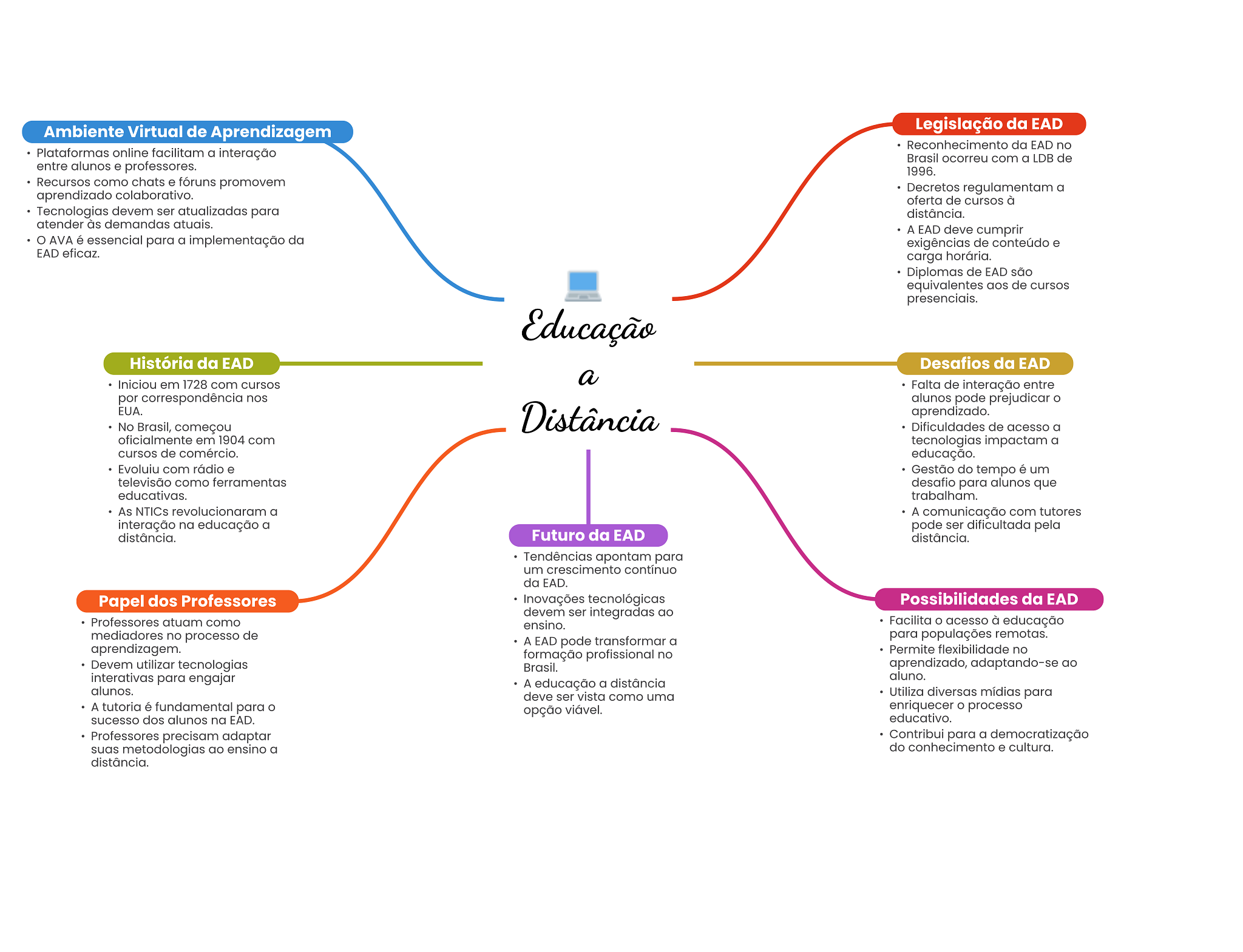 Ambiente Virtual de Aprendizagem Legislação da EAD Reconhecimento da EAD no Plataformas online facilitam a interação Brasil ocorreu com a LDB de entre alunos e professores. 1996. Recursos como chats e fóruns promovem Decretos regulamentam a aprendizado colaborativo. oferta de cursos à Tecnologias devem ser atualizadas para distância. atender às demandas atuais. A EAD deve cumprir AVA é essencial para a implementação da exigências de conteúdo e EAD eficaz. carga horária. Diplomas de EAD são equivalentes aos de cursos presenciais. Educação História da EAD Desafios da EAD Iniciou em 1728 com cursos a Falta de interação entre por correspondência nos alunos pode prejudicar EUA. Distância aprendizado. No Brasil, começou Dificuldades de acesso a oficialmente em 1904 com tecnologias impactam a cursos de comércio. educação. Evoluiu com rádio e Gestão do tempo é um televisão como ferramentas desafio para alunos que educativas. trabalham. As NTICs revolucionaram a A comunicação com tutores interação na educação a pode ser dificultada pela distância. Futuro da EAD distância. Tendências apontam para um crescimento contínuo da EAD. Papel dos Professores Inovações tecnológicas Possibilidades da EAD devem ser integradas ao Professores atuam como ensino. Facilita acesso à educação mediadores no processo de para populações remotas. A EAD pode transformar a aprendizagem. formação profissional no Permite flexibilidade no Devem utilizar tecnologias Brasil. aprendizado, adaptando-se ao interativas para engajar aluno. alunos. A educação a distância deve ser vista como uma Utiliza diversas mídias para A tutoria é fundamental para opção viável. enriquecer processo sucesso dos alunos na EAD. educativo. Professores precisam adaptar Contribui para a democratização suas metodologias ao ensino a do conhecimento e cultura. distância.