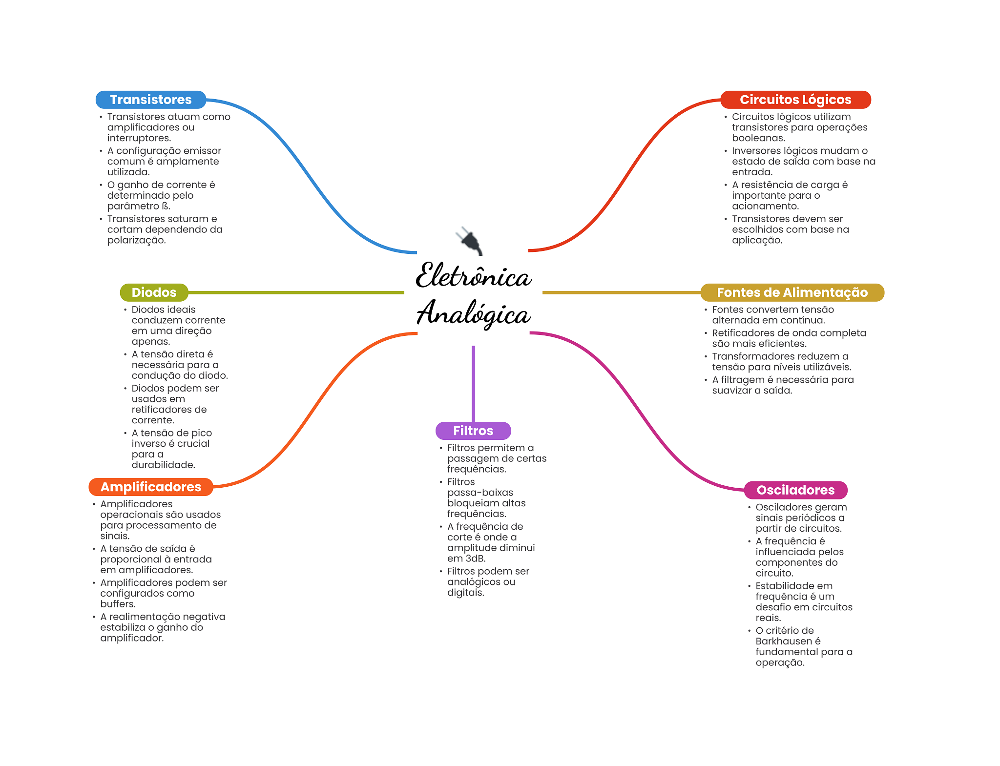 Transistores Circuitos Lógicos Transistores atuam como Circuitos lógicos utilizam amplificadores ou transistores para operações interruptores. booleanas. A configuração emissor Inversores lógicos mudam comum é amplamente estado de saída com base na utilizada. entrada. ganho de corrente é A resistência de carga é determinado pelo importante para O parâmetro acionamento. Transistores saturam e Transistores devem ser cortam dependendo da escolhidos com base na polarização. aplicação. Eletrônica Diodos Fontes de Alimentação Diodos ideais Analógica Fontes convertem tensão conduzem corrente alternada em contínua. em uma direção Retificadores de onda completa apenas. são mais eficientes. A tensão direta é Transformadores reduzem a necessária para a tensão para níveis utilizáveis. condução do diodo. A filtragem é necessária para Diodos podem ser suavizar a saída. usados em retificadores de corrente. A tensão de pico Filtros inverso é crucial Filtros permitem a para a passagem de certas durabilidade. frequências. Filtros Amplificadores passa-baixas Osciladores Amplificadores bloqueiam altas Osciladores geram operacionais são usados frequências. sinais periódicos a para processamento de A frequência de partir de circuitos. sinais. corte é onde a A frequência é A tensão de saída é amplitude diminui influenciada pelos proporcional à entrada em 3dB. componentes do em amplificadores. Filtros podem ser circuito. Amplificadores podem ser analógicos ou Estabilidade em configurados como digitais. frequência é um buffers. desafio em circuitos A realimentação negativa reais. estabiliza o ganho do critério de amplificador. Barkhausen é fundamental para a operação.