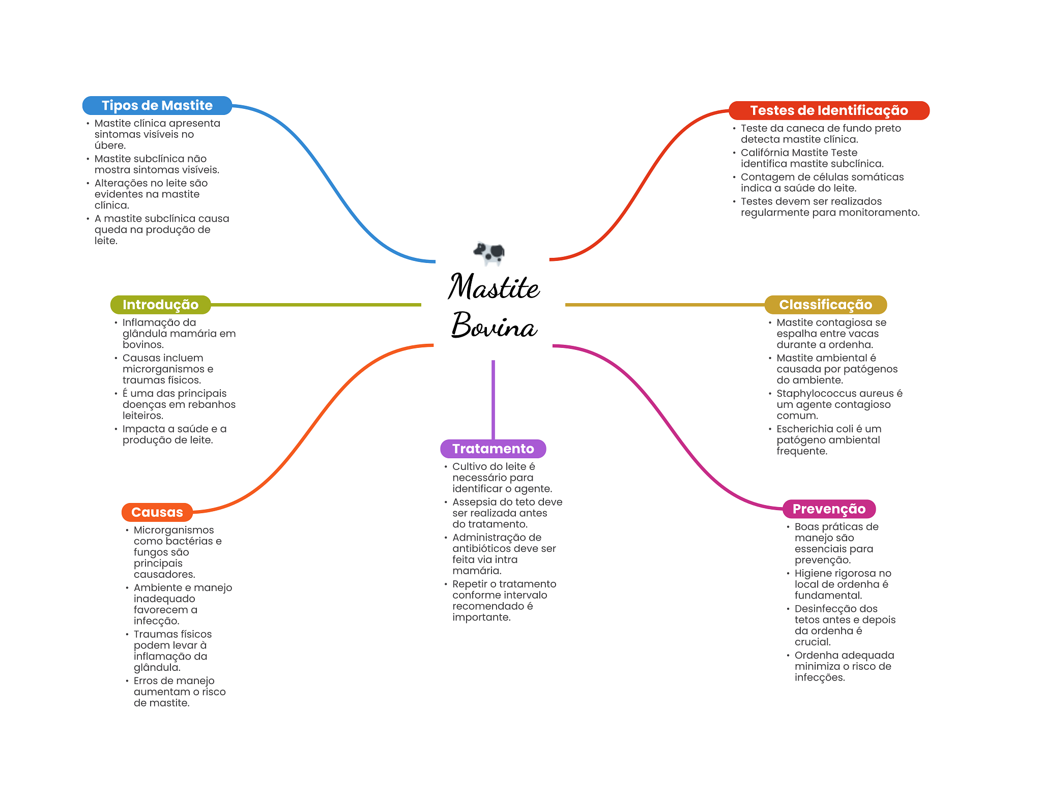 Tipos de Mastite Testes de Identificação Mastite clínica apresenta sintomas visíveis no Teste da caneca de fundo preto detecta mastite clínica. úbere. Califórnia Mastite Teste Mastite subclínica não identifica mastite subclínica. mostra sintomas visíveis. Contagem de células somáticas Alterações no leite são indica a saúde do leite. evidentes na mastite clínica. Testes devem ser realizados A mastite subclínica causa regularmente para monitoramento. queda na produção de leite. Mastite Introdução Classificação Inflamação da Bovina Mastite contagiosa se glândula mamária em espalha entre vacas bovinos. durante a ordenha. Causas incluem Mastite ambiental é microrganismos e causada por patógenos traumas físicos. do ambiente. É uma das principais Staphylococcus aureus é doenças em rebanhos um agente contagioso leiteiros. comum. Impacta a saúde e a Escherichia coli é um produção de leite. patógeno ambiental Tratamento frequente. Cultivo do leite é necessário para identificar agente. Assepsia do teto deve Causas ser realizada antes Prevenção do tratamento. Microrganismos Boas práticas de como bactérias e Administração de manejo são fungos são antibióticos deve ser essenciais para principais feita via intra prevenção. causadores. mamária. Higiene rigorosa no Ambiente e manejo Repetir O tratamento local de ordenha é inadequado conforme intervalo fundamental. favorecem a recomendado é Desinfecção dos infecção. importante. tetos antes e depois Traumas físicos da ordenha é podem levar à crucial. inflamação da Ordenha adequada glândula. minimiza risco de Erros de manejo infecções. aumentam risco de mastite.