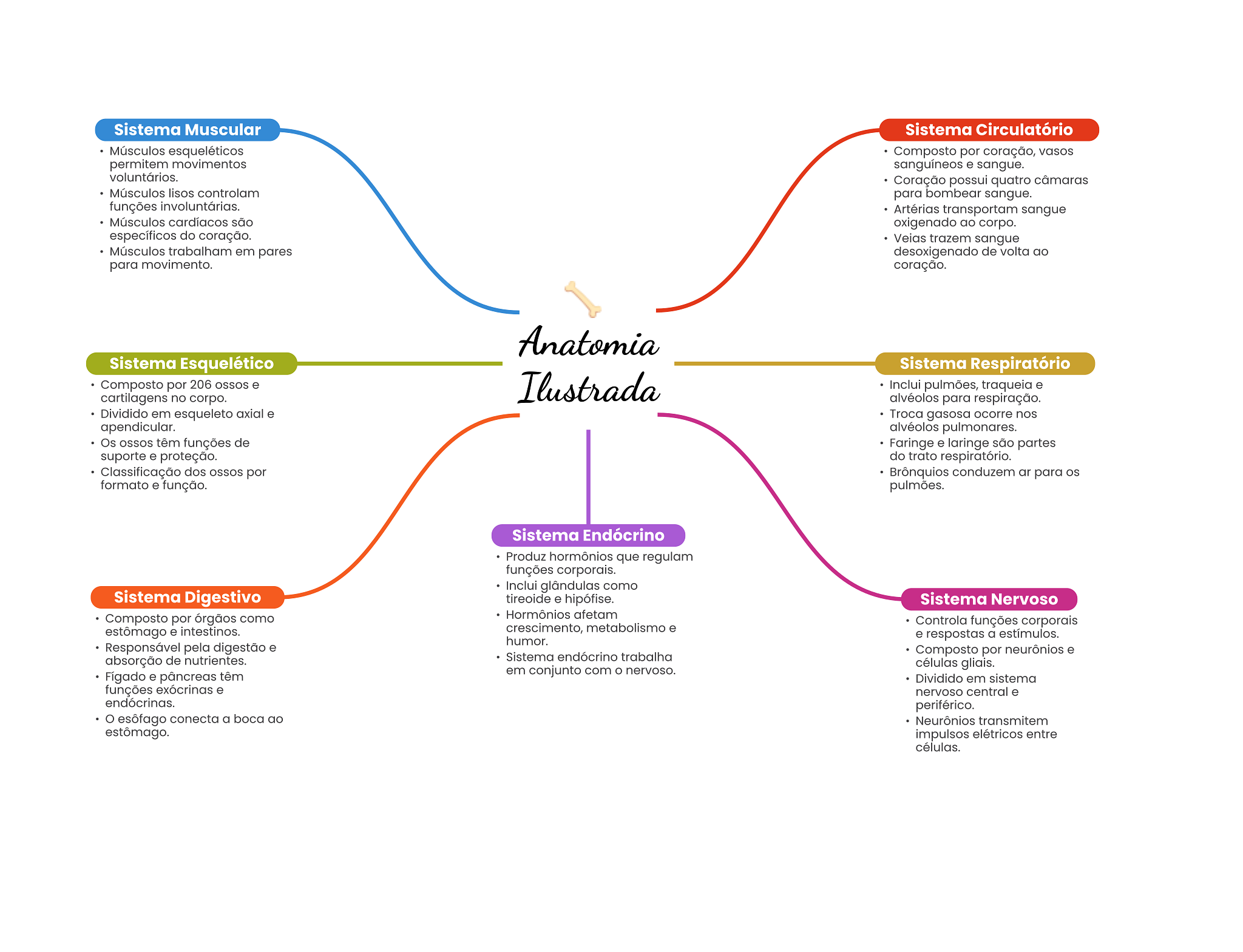 Sistema Muscular Sistema Circulatório Músculos esqueléticos Composto por coração, vasos permitem movimentos sanguíneos e sangue. voluntários. Coração possui quatro câmaras Músculos lisos controlam para bombear sangue. funções involuntárias. Artérias transportam sangue Músculos cardíacos são oxigenado ao corpo. específicos do coração. Veias trazem sangue Músculos trabalham em pares desoxigenado de volta ao para movimento. coração. Anatomia Sistema Esquelético Sistema Respiratório Composto por 206 e cartilagens no corpo. Ilustrada Inclui pulmões, traqueia e alvéolos para respiração. Dividido em esqueleto axial e Troca gasosa ocorre nos apendicular. alvéolos pulmonares. Os OSSOS têm funções de Faringe e laringe são partes suporte e proteção. do trato respiratório. Classificação dos OSSOS por Brônquios conduzem ar para formato e função. pulmões. Sistema Endócrino Produz hormônios que regulam funções corporais. Inclui glândulas como Sistema Digestivo tireoide e hipófise. Sistema Nervoso Composto por órgãos como Hormônios afetam Controla funções corporais estômago e intestinos. crescimento, metabolismo e e respostas a estímulos. humor. Responsável pela digestão e absorção de nutrientes. Sistema endócrino trabalha Composto por neurônios e células gliais. Fígado e pâncreas têm em conjunto com O nervoso. Dividido em sistema funções exócrinas e nervoso central e endócrinas. periférico. esôfago conecta a boca ao Neurônios transmitem estômago. impulsos elétricos entre células.