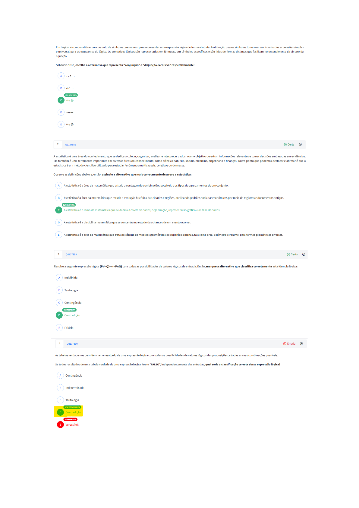 Em Lógica, é comum utilizar um conjunto de símbolos que servem para representar uma expressão lógica de forma abstrata. A utilização desses símbolos torna 0 entendimento das expressões simples e universal para os estudantes de lógica. Os conectivos lógicos são representados em fórmulas, por símbolos específicos e são lidos de formas distintas que facilitam no entendimento da sintaxe da equação. Sabendo disso, escolha a alternativa que representa "conjunção" e "disjunção exclusiva" respectivamente: A SUA RESPOSTA D E 2 Q3137886 Certa A estatística é uma área do conhecimento que se dedica a coletar, organizar, analisar e interpretar dados, com objetivo de informações relevantes e tomar decisões embasadas em evidências. Ela também é uma ferramenta importante em diversas áreas do conhecimento, como ciências naturais, sociais, medicina, engenharia e finanças. Outro ponto que podemos destacar e afirmar é que a estatística é um método científico utilizado para estudar fenômenos multicausais, coletivos ou de massa. Observe as definições abaixo e, então, assinale a alternativa que mais corretamente descreve a estatística: A A estatística é área da matemática que estuda a contagem de combinações possíveis e os tipos de agrupamentos de um conjunto. Estatística é a área da matemática que estuda a evolução histórica das cidades e regiões, analisando padrões sociais e econômicos por meio de registros e documentos antigos. SUA RESPOSTA A estatística é ramo da matemática que se dedica à coleta de dados, organização, representação gráfica e análise de dados. D A estatística é disciplina matemática que se concentra no estudo das chances de um evento ocorrer. E A estatística é área da matemática que trata do cálculo de medidas geométricas de superfícies planas, tais como área, perímetro e volume, para formas geométricas diversas. 3 Q3137888 Certa Resolve a seguinte expressão lógica com todas as possibilidades de valores lógicos de entrada. Então, marque a alternativa que classifica corretamente esta fórmula lógica: A Indefinida Tautologia Contingência SUA RESPOSTA D Contradição E Falácia 4 Q3137890 Errada As tabelas verdade nos permitem ver resultado de uma expressão lógica com todas as possibilidades de valores lógicos das proposições, e todas as suas combinações possíveis. Se todos resultados de uma tabela verdade de uma expressão lógica forem "FALSO", independentemente das entradas, qual seria a classificação correta dessa expressão lógica? A Contingência B Indeterminada Tautologia D Contradição SUA RESPOSTA E Verossímil5 Q3137893 Certa Qual definição abaixo melhor se encaixa na descrição de uma contradição? SUA RESPOSTA A Uma proposição cujo valor lógico é sempre falso. B Uma proposição cujo valor lógico é indeterminado. Uma proposição cujo valor lógico é sempre verdade. D Uma proposição cujo valor lógico é mutável. E Uma proposição cujo valor lógico é composto. 6 Q3137894 Certa Os símbolos de lógica proposicional nos permitem compreender rapidamente abstrações complexas de equações lógicas. Qual operador lógico símbolo abaixo representa? A Disjunção exclusiva Bicondicional SUA RESPOSTA Condicional D Conjunção E Negação Em lógica proposicional, utilizamos um sistema de símbolos capaz de abstrair operadores e condicionais em sentenças lógicas matemáticas. Sabendo disso, escolha símbolo do operador que corretamente serve no exemplo abaixo: P Faz frio Q Faz calor "Faz frio ou faz calor" A ^ SUA RESPOSTA D V E 8 Q3137897 Certa Probabilidade é uma área da matemática que estuda a chance ou a possibilidade de que um evento ocorra. Desta forma, ao jogar simultaneamente um dado e uma moeda, qual a probabilidade de os resultados serem coroa na moeda e um número não primo no dado? A 15% SUA RESPOSTA 25% 10% D 20% E 30%9 Q3137898 Certa Podemos descrever e definir uma tautologia como uma proposição que é verdadeira independentemente dos valores lógicos das proposições que a compõem. Outra forma de compreender isso é dizer que a tautologia é uma proposição que sempre será verdadeira, não importa quais sejam as condições que a envolvem. Como podemos definir corretamente a expressão lógica "P + -P"? A Contingência SUA RESPOSTA Tautologia Contradição D Indeterminada E Determinística 10 Q3137899 Errada Tautologias, contradições e contingências são formas de classificar proposições e equações lógicas. Esse tipo de classificação para a proposição ou equação lógica é baseado em: RESPOSTA CORRETA A Valor lógico dos resultados possíveis. Complexidade da equação. Nível de abstração da expressão lógica. D Valor lógico de entrada das proposições. E Conjunto de regras de formação.