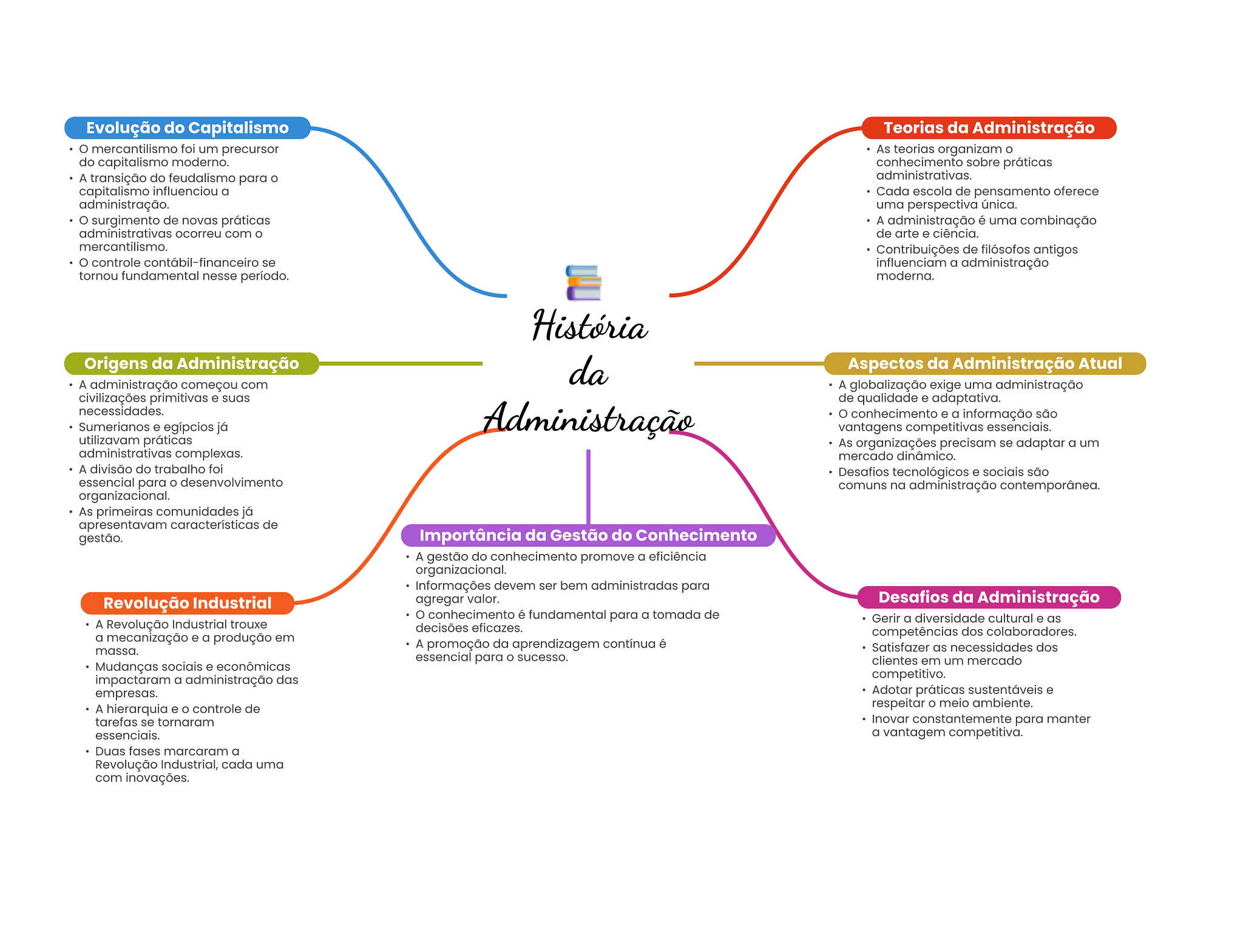 Evolução do Capitalismo Teorias da Administração mercantilismo foi um precursor As teorias organizam do capitalismo moderno. conhecimento sobre práticas A transição do feudalismo para administrativas. capitalismo influenciou a Cada escola de pensamento oferece administração. uma perspectiva única. surgimento de novas práticas A administração é uma combinação administrativas ocorreu com de arte e ciência. mercantilismo. Contribuições de filósofos antigos controle contábil-financeiro se influenciam a administração tornou fundamental nesse período. moderna. História Origens da Administração da Aspectos da Administração Atual A administração começou com A globalização exige uma administração civilizações primitivas e suas de qualidade e adaptativa. necessidades. Sumerianos e egípcios já Administração conhecimento e a informação são vantagens competitivas essenciais. utilizavam práticas As organizações precisam se adaptar a um administrativas complexas. mercado dinâmico. A divisão do trabalho foi Desafios tecnológicos e sociais são essencial para desenvolvimento comuns na administração contemporânea. organizacional. As primeiras comunidades já apresentavam características de gestão. Importância da Gestão do Conhecimento A gestão do conhecimento promove a eficiência organizacional. Informações devem ser bem administradas para Revolução Industrial agregar valor. Desafios da Administração conhecimento é fundamental para a tomada de Gerir a diversidade cultural e as A Revolução Industrial trouxe decisões eficazes. a mecanização e a produção em competências dos colaboradores. A promoção da aprendizagem contínua é massa. Satisfazer as necessidades dos essencial para sucesso. clientes em um mercado Mudanças sociais e econômicas impactaram a administração das competitivo. empresas. Adotar práticas sustentáveis e A hierarquia e controle de respeitar O meio ambiente. tarefas se tornaram Inovar constantemente para manter essenciais. a vantagem competitiva. Duas fases marcaram a Revolução Industrial, cada uma com inovações.