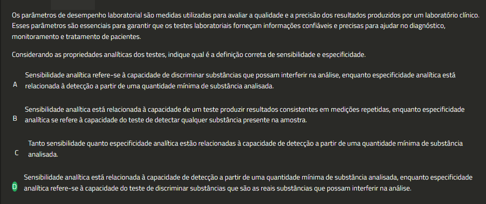 Os parâmetros de desempenho laboratorial são medidas utilizadas para avaliar a qualidade e a precisão dos resultados produzidos por um laboratório clínico. Esses parâmetros são essenciais para garantir que testes laboratoriais forneçam informações confiáveis e precisas para ajudar no diagnóstico, monitoramento e tratamento de pacientes. Considerando as propriedades dos testes, indique qual é a definição correta de sensibilidade e especificidade. Sensibilidade refere-se à capacidade de discriminar substâncias que possam interferir na analise, enquanto especificidade analítica está A relacionada à detecção a partir de uma quantidade mínima de substância analisada. Sensibilidade analítica está relacionada à capacidade de um teste produzir resultados consistentes em medições repetidas, enquanto especificidade B analítica se refere à capacidade do teste de detectar qualquer substância presente na amostra. Tanto sensibilidade quanto especificidade estão relacionadas à capacidade de detecção a partir de uma quantidade mínima de substância C analisada. Sensibilidade analítica está relacionada à capacidade de detecção a partir de uma quantidade mínima de substância analisada, enquanto especificidade analítica refere-se à capacidade do teste de discriminar substâncias que são as reais substâncias que possam interferir na