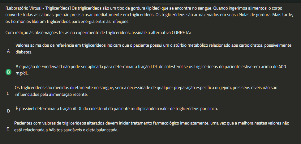 [Laboratório Virtual Triglicerídeos] Os triglicerídeos são um tipo de gordura (lipídeo) que se encontra no sangue. Quando ingerimos alimentos, 0 corpo converte todas as calorias que não precisa usar imediatamente em triglicerídeos. Os triglicerídeos são armazenados em suas células de gordura. Mais tarde, hormônios liberam triglicerídeos para energia entre as refeições. Com relação às observações feitas no experimento de triglicerídeos, assinale a alternativa CORRETA: Valores acima dos de referência em triglicerídeos indicam que 0 paciente possui um distúrbio metabólico relacionado aos carboidratos, possivelmente A diabetes. A equação de Friedewald não pode ser aplicada para determinar a fração LDL do colesterol se do paciente estiverem acima de 400 B mg/dL. Os triglicerídeos são medidos diretamente no sangue, sem a necessidade de qualquer preparação específica ou jejum, pois seus não são influenciados pela alimentação recente. D É possível determinar a fração VLDL do colesterol do paciente multiplicando 0 valor de triglicerídeos por cinco. Pacientes com valores de triglicerídeos alterados devem iniciar tratamento farmacológico imediatamente, uma vez que a melhora nestes valores não E está relacionada a hábitos saudáveis e dieta balanceada.
