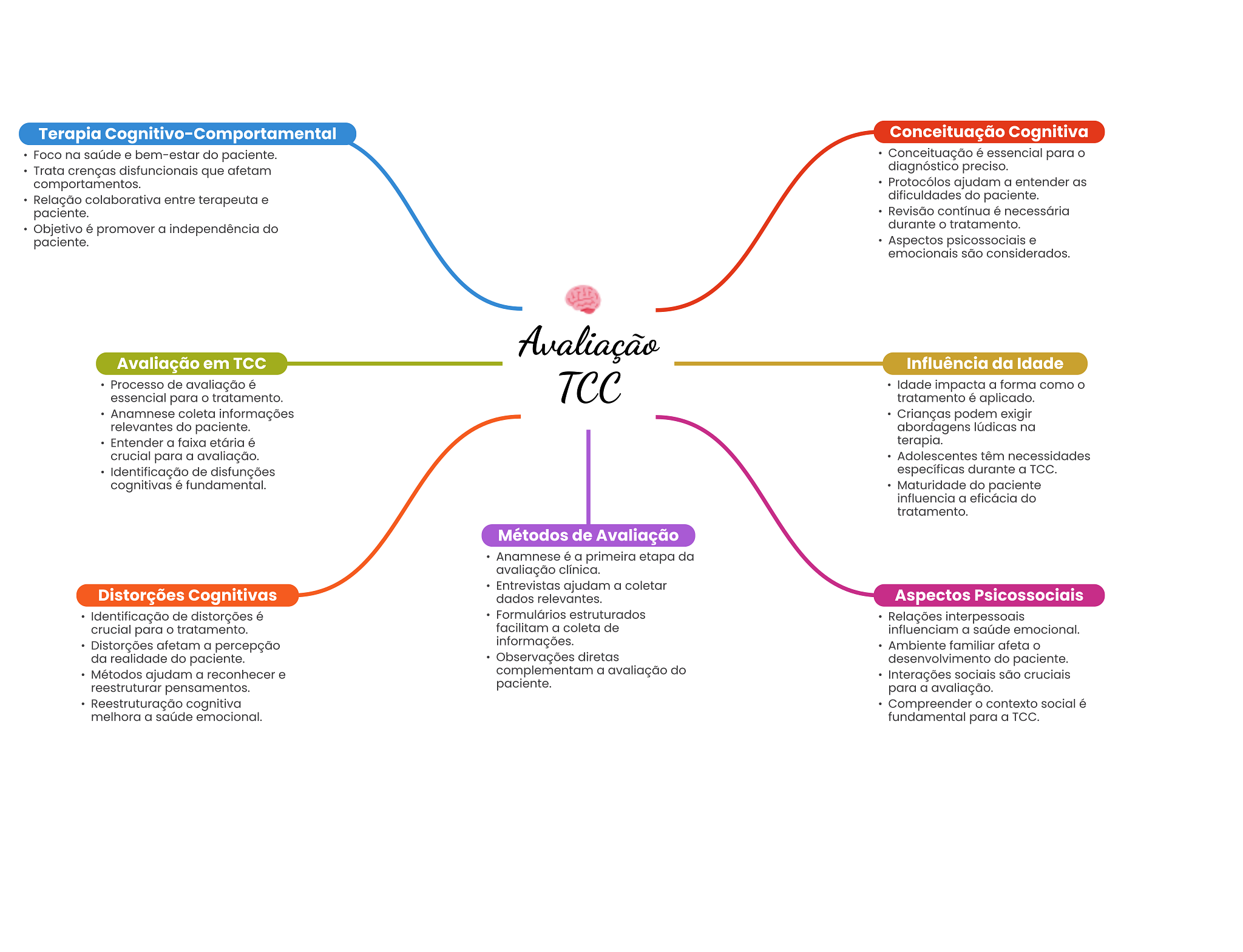 Terapia Cognitivo-Comportamental Conceituação Cognitiva Foco na saúde e bem-estar do paciente. Conceituação é essencial para Trata crenças disfuncionais que afetam diagnóstico preciso. comportamentos. Protocólos ajudam a entender as Relação colaborativa entre terapeuta e dificuldades do paciente. paciente. Revisão contínua é necessária Objetivo é promover a independência do durante tratamento. paciente. Aspectos psicossociais e emocionais são considerados. Avaliação Avaliação em TCC Influência da Idade Processo de avaliação é essencial para tratamento. TCC Idade impacta a forma como O tratamento é aplicado. Anamnese coleta informações Crianças podem exigir relevantes do paciente. abordagens lúdicas na Entender a faixa etária é terapia. crucial para a avaliação. Adolescentes têm necessidades Identificação de disfunções específicas durante a TCC. cognitivas é fundamental. Maturidade do paciente influencia a eficácia do tratamento. Métodos de Avaliação Anamnese é a primeira etapa da avaliação clínica. Entrevistas ajudam a coletar Distorções Cognitivas dados relevantes. Aspectos Psicossociais Identificação de distorções é Formulários estruturados Relações interpessoais crucial para tratamento. facilitam a coleta de influenciam a saúde emocional. Distorções afetam a percepção informações. Ambiente familiar afeta da realidade do paciente. Observações diretas desenvolvimento do paciente. Métodos ajudam a reconhecer e complementam a avaliação do Interações sociais são cruciais reestruturar pensamentos. paciente. para a avaliação. Reestruturação cognitiva Compreender contexto social é melhora a saúde emocional. fundamental para a TCC.