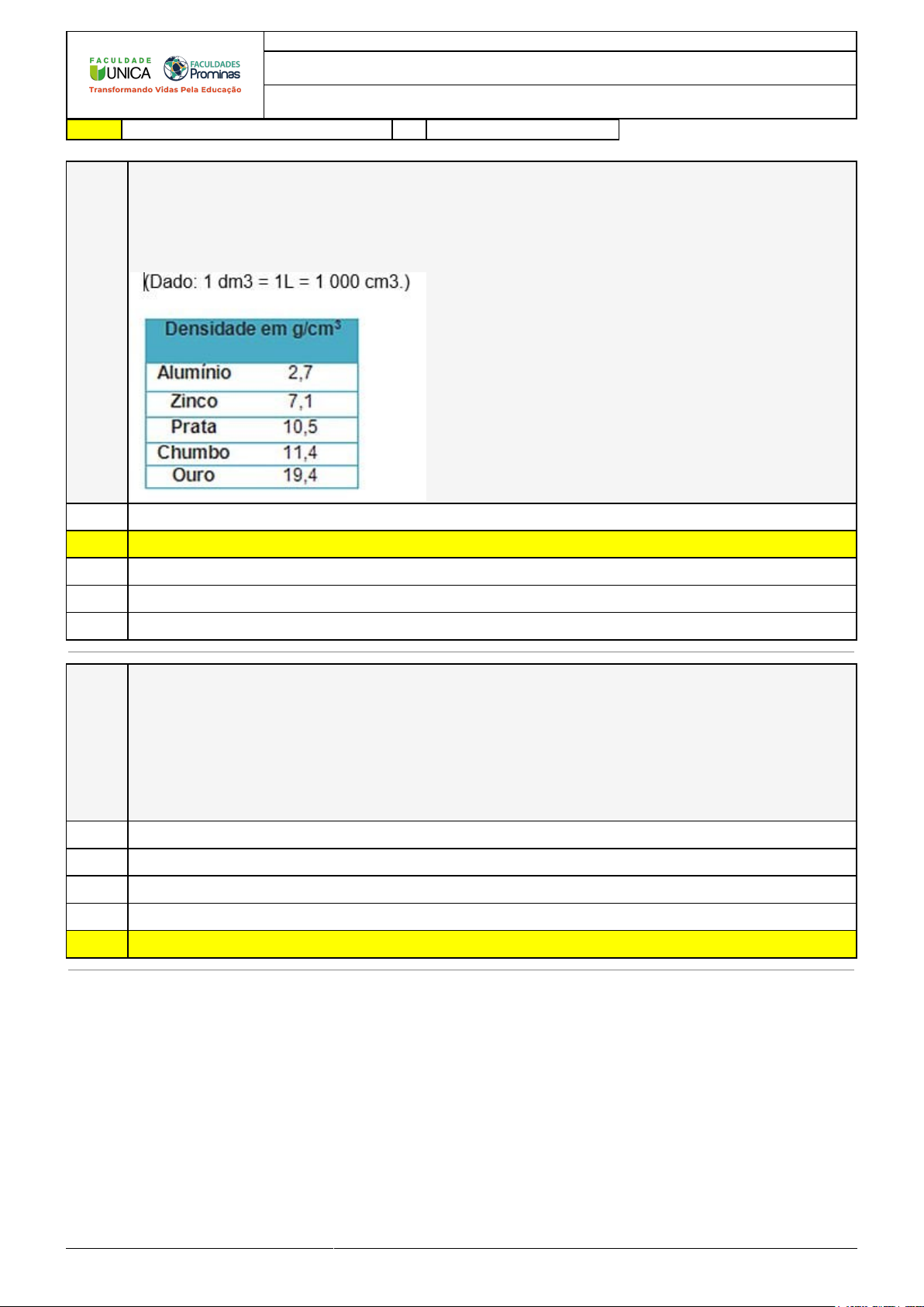 19/09/2023 21:08:32 1/3 REVISÃO DE SIMULADO Nome: MARCOS VINICIUS BOOSTEL DE OLIVEIRA Disciplina: Química Geral e Experimental Respostas corretas são marcadas em amarelo X Respostas marcardas por você. Questão 001 Em uma cena de um filme, um indivíduo corre carregando uma maleta tipo 007(volume de 20 dm3) cheia de barras de um certo metal. Considerando que um adulto de peso médio (70 kg) pode deslocar com uma certa velocidade, no máximo, o equivalente ao seu próprio peso, indique qual o metal, contido na maleta, observando os dados da tabela a seguir. A) Zinco. B) Alumínio. C) Chumbo. X D) Ouro. E) Prata. Questão 002 Considere as seguintes propriedades de 3 substâncias: Substância A: quando colocada dentro de um recipiente move-se sempre para o fundo; Substância B: quando colocada dentro de um recipiente espalha-se por todo o espaço disponível; Substância C: quando colocada dentro de um recipiente, move-se sempre para o fundo, espalhando-se e cobrindo-o. Os estados físicos das substâncias A, B e C são, respectivamente: A) gasoso, sólido e líquido. B) líquido, sólido e gasoso. X C) sólido, líquido e gasoso. D) gasoso, líquido e sólido. E) sólido, gasoso e líquido. 19/09/2023 21:08:32 2/3 Questão 003 O gráfico abaixo apresenta a variação de temperatura observada ao se aquecer uma substância A, a partir de 25 ºC, em função do tempo. X A) A faixa de temperatura em que a substância permanece líquida é 25 – 182 ºC. B) A substância A não é uma substância pura. C) A faixa de temperatura em que a substância permanece sólida é 25 – 41 ºC. D) Em 25 ºC, a substância é um líquido. E) A temperatura de ebulição da substância A é 41 ºC. Questão 004 Propriedades físicas como densidade, ponto de fusão e ponto de ebulição são importantes para identificar e diferenciar quando um sistema é composto de uma substância pura ou por uma mistura. Analise os gráficos a seguir, que representam mudanças de estado físico. Em relação às mudanças de estado físico, é CORRETO afirmar: A) O gráfico A representa a mudança de estado físico de uma mistura eutética. B) O gráfico B representa a mudança de estado físico de uma mistura azeotrópica. C) O segmento T1–T1’ no gráfico B caracteriza uma substância pura. D) O gráfico A representa a mudança de estado físico de uma mistura trifásica. X E) O gráfico B representa a mudança de estado físico de uma mistura que apresenta ponto de ebulição não definido. 19/09/2023 21:08:32 3/3 Questão 005 Duas amostras de naftalina, uma de 20,0 g (amostra A) e outra de 40,0 g (amostra B), foram colocadas em tubos de ensaio separados, para serem submetidas à fusão. Ambas as amostras foram aquecidas por uma mesma fonte de calor. No decorrer do aquecimento de cada uma delas, as temperaturas foram anotadas de 30 em 30 segundos. Um estudante, considerando tal procedimento, fez as seguintes previsões: I. A fusão da amostra A deve ocorrer a temperatura mais baixa do que a da amostra B. II. A temperatura de fusão da amostra B deve ser o dobro da temperatura de fusão da amostra A. III. A amostra A alcançará a temperatura de fusão num tempo menor que a amostra B. IV. Ambas as amostras devem entrar em fusão à mesma temperatura. É CORRETO o que se afirma apenas em: A) II e III. X B) III e IV. C) I. D) III. E) II.