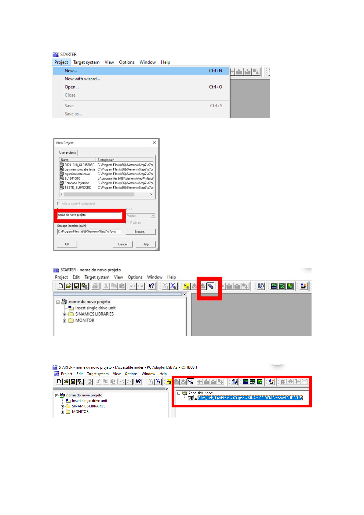 Inicio de um novo projeto Nomeando o novo projeto Acessando os nós de rede Nó encontrado Colocar ONLINE Selecionar o Nó que deseja ficar online e aceitar Carregando o programa salvo no drive para o computadorC Parametrizar os dados do motor Selecionar o modelo do drive conforme etiqueta e MLFB(r50070) Entrar com dados do motor p50076(0): Proporção entre a corrente da armadura do drive e a corrente do motor a ser controlado. p50076(1): Proporção entre a corrente da armadura do drive e a corrente do motor a ser controlado. p50078(0): Tensão de alimentação da armadura (tensão da rede); p50078(1): Tensão de alimentação do campo (tensão da rede); p50100: Corrente da armadura do motor; p50101: Tensão da armadura do motor; p50102: Corrente do campo do motor; p50103: Mínima Corrente do campo do motor (alterado quando parametrizar o enfraquecimento de campo, caso contrário =p50101); p50114: Tempo de temperatura constante do motor; Tipo de Feedback (encoder ou tacogerador) Alimentação do campo Nesse campo podemos informar em que momento o campo vai ser atuado Painel de controle image7.png image8.png image9.png image10.png image11.png image12.png image13.png image1.png image2.png image3.png image4.png image5.png image6.png