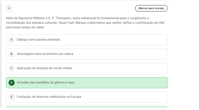 4 Marcar para revisão de Raymond Williams e E.P. Thompson, outro intelectual foi fundamental para 0 surgimento e consolidação dos estudos culturais: Stuart Hall. Marque a alternativa que melhor defina a contribuição de Hall para esse campo do saber A com autores orientais B Abordagem mais da cultura C Aplicação de estudos de novas midias D Inclusão das questões de gênero e raça E Fundação de diversas instituições na Europa
