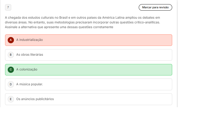 7 Marcar para revisão A chegada dos estudos culturais no Brasil e em outros paises da America Latina ampliou os debates em diversas areas. No entanto, suas metodologias precisaram incorporar outras questões Assinale a alternativa que apresente uma dessas corretamente A A industrialização B As obras C A colonização D A popular. E Os