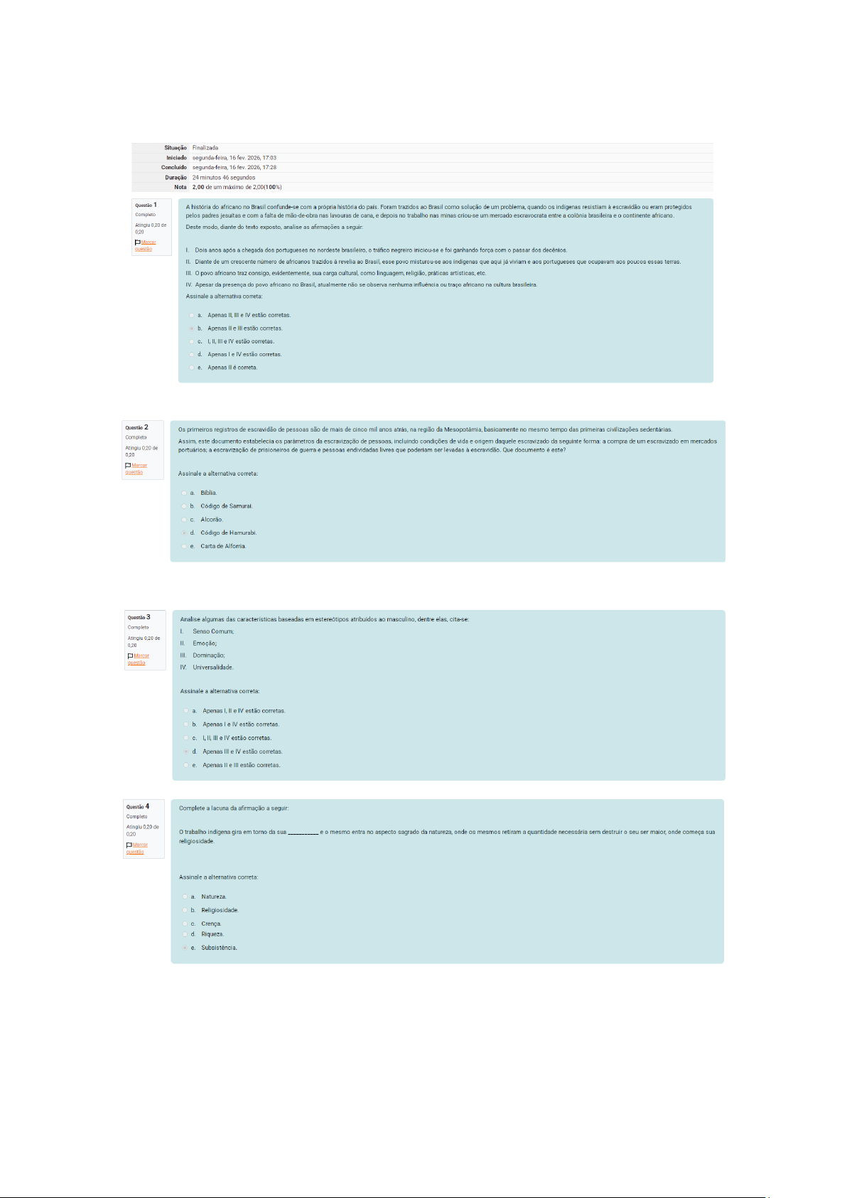 Situação Finalizada Iniciado segunda-feira, 16 fev. 2026, 17:03 Concluído segunda-feira, 16 fev. 2026, 17:28 Duração 24 minutos 46 segundos Nota 2,00 de um máximo de 2,00(100%) Questão A história do africano no Brasil confunde-se com própria história do país. Foram trazidos ao Brasil como solução de um problema, quando indígenas resistiam escravidão ou eram protegidos Completo pelos padres jesuítas e com a falta de mão-de-obra nas lavouras de cana, depois no trabalho nas minas criou-se um mercado escravocrata entre colônia brasileira continente Atingiu 0,20 de Deste modo, diante do texto exposto, analise as afirmações seguir: 0,20 Marcar guestão Dois anos após chegada dos portugueses no nordeste brasileiro, tráfico negreiro iniciou-se foi ganhando força com passar dos decênios. Diante de um crescente número de africanos trazidos à revelia ao Brasil, esse povo misturou-s aos que aqui já viviam aos portugueses que ocupavam aos poucos essas terras. III. povo africano traz consigo, evidentemente, sua carga cultural, como linguagem, religião, práticas artísticas, etc. IV. Apesar da presença do povo africano no Brasil, atualmente não se observa nenhuma influência ou traço africano na cultura Assinale alternativa correta: Apenas II, III IV estão b. Apenas III estão III IV estão d. Apenas IV estão Apenas Questão 2 Os primeiros registros de escravidão de pessoas são de mais de cinco mil anos atrás, na região da Mesopotâmia, basicamente no mesmo tempo das primeiras civilizações sedentárias. Completo Assim, este documento estabelecia parâmetros da escravização de pessoas, incluindo condições de vida origem daquele escravizado da seguinte forma: compra de um escravizado em mercados Atingiu 0,20 de portuários; a escravização de prisioneiros de guerra pessoas endividadas livres que poderiam ser levadas à Que documento é este? 0,20 Marcar guestão Assinale alternativa correta: b. Código de Alcorão. d. Código de Hamurabi. Carta de Alforria Questão 3 Analise algumas das características baseadas em estereótipos atribuídos ao masculino, dentre elas, cita-se: Completo Senso Comum; Atingiu 0,20 de 0,20 Emoção; Marcar III. Dominação; guestão IV. Assinale alternativa correta: Apenas IV estão corretas. b. Apenas IV estão corretas. III IV estão d. Apenas III IV estão Apenas III estão corretas. Questão 4 Complete lacuna da afirmação seguir: Completo Atingiu 0,20 de trabalho indígena gira em torno da sua e mesmo entra no aspecto sagrado da natureza, onde mesmos retiram a quantidade necessária sem destruir seu ser maior, onde começa sua religiosidade. Marcar guestão Assinale alternativa a. b. Religiosidade. d. Riqueza.Questão 5 Como se denomina processo onde homem acompanhava sua esposa durante todo período do resguardo dentro da "Oca" (casa) ajudando auxiliando nos cuidados do recém-nascido? Completo Atingiu 0,20 de 0,20 Assinale alternativa correta: Marcar guestão b. Empreitada Coivara d. Couvade Cruzada Questão 6 movimento abolicionista foi essencial para exercer pressão para exigir pressão exigir fim da escravidão no A coroa não podia se indispor com as principais oligarquias promovendo a Completo escravidão Atingiu 0,20 de Deste modo, julgue as afirmativas a seguir com "V" para verdadeiro e "F" para falso: Marcar guestão movimento abolicionista, sabendo da falta de popularidade das repressões, aumentava sua pressão ao Governo. A coroa não podia se indispor com as principais oligarquias promovendo a escravidão. Essas, por sua vez, não tinham interesse na manutenção do escravismo e dominavam políticos marcada pelo voto censitário. ( Algumas figuras abolicionistas são bem conhecidas, como poeta Castro Alves, maestrina Chiquinha Gonzaga diplomata Joaquim Nabuco, dentre outros. De grande importância para época foram abolicionistas negros, que eram usados de exemplo, na prática de como as políticas do país não beneficiavam. Assinale alternativa correta: d. V.F.V.V. Questão 7 0 conceito busca dar conta de uma nova ordem social, isto se antes essa ordem exigia que todos fossem heterossexuais, hoje ordem sexual exige que todos, heterossexuais, homossexuais, e Completo outros organizem suas vidas conforme modelo "supostamente coerente" da heterossexualidade. Atingiu 0,20 de Sendo assim, analise as afirmativas abaixo: 0,20 Marcar Enquanto na heterossexualidade compulsória todos sujeitos devem ser heterossexuais para serem considerados normais, na heteronormatividade todos sujeitos devem organizar suas vidas conforme modelo seja heterossexual ou não. Se na heterossexualidade compulsória todos sujeitos que não são heterossexuais são considerados doentes precisam ser explicados, estudados problematizados, na heteronormatividade esses sujeitos tornam-se coerentes desde que se identifiquem com heterossexualidade como modelo, isto é, mantenham linearidade de gênero: homens devem se comportar como machos, másculos. III. Um homem pode ser homossexual, inclusive fora do armário, mas não pode se identificar com feminino, nem uma mulher lésbica pode se identificar com masculino. IV. Enquanto heterossexualidade compulsória se sustenta na crença de que heterossexualidade é um padrão da natureza, a heteronormatividade se sustenta na ideia que ter um pênis significa ser másculo, isto no gênero como parte da natureza. Em ambas a naturalidade aparece como Assinale alternativa correta: a Apenas III IV estão b. Apenas IV estão corretas. Apenas III estão d. Apenas IV estão II, III IV estão Questão 8 A expressão "Heterossexualidade compulsória" foi criada pela estadunidense Adrienne Rich (2010), e diz respeito à imposição de um modelo e conteúdo de relacionamento, entre homens e mulheres, Completo como definidor de relações sociais que são marcadas pela diferença naturalizada dos Atingiu 0,20 de Deste modo, analise as afirmativas seguir: 0,20 Marcar guestão A heterossexualidade compulsória funcion