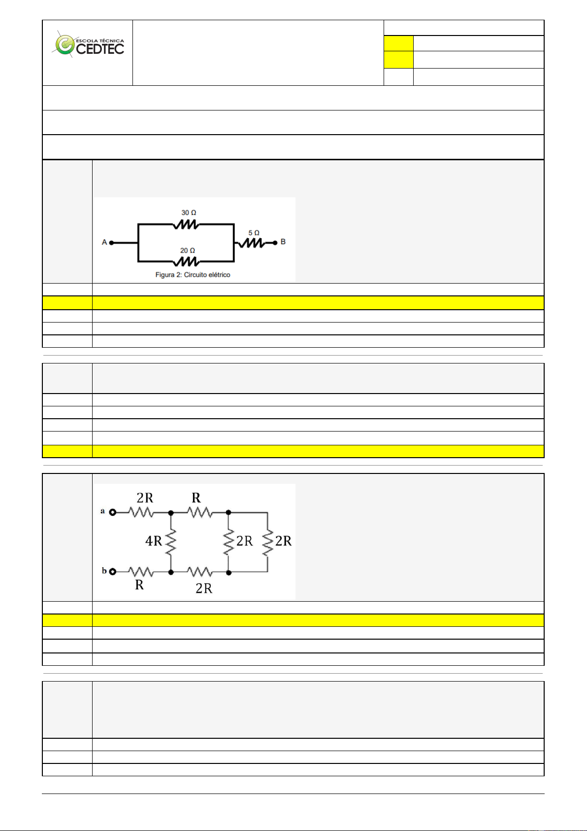 Pincel Atômico - 16/02/2026 10:37:49 1/2 MAYCON GOMES DE PAULA DIAS Exercício Caminho do Conhecimento - Etapa 10 (25540) Atividade finalizada em 18/10/2025 14:53:16 (5273521 / 1) LEGENDA Resposta correta na questão # Resposta correta - Questão Anulada X Resposta selecionada pelo Aluno Disciplina: ELETRICIDADE [1617481] - Avaliação com 4 questões, com o peso total de 4,33 pontos [capítulos - 115] Turma: Curso Técnico: Eletrotécnica - Grupo: ABRIL/25 PRES - ELEGUA.ABR25.NOT [167686] Aluno(a): 91510257 - MAYCON GOMES DE PAULA DIAS - Respondeu 2 questões corretas, obtendo um total de 2,17 pontos como nota [114_175166] Questão 001 Na análise de circuitos elétricos é conveniente representar um trecho com muitos resistores por um único resistor cuja resistência equivale à do conjunto. A resistência final dessa associação é comumente denominada resistência equivalente (Req). A Figura 2 apresenta um circuito elétrico aleatório. Assinale a alternativa que representa corretamente o valor da resistência equivalente entre os pontos A e B. 30 Ω (ohms) X 17 Ω (ohms) 12 Ω (ohms) 55 Ω (ohms) 35 Ω (ohms) [114_175164] Questão 002 Podemos dizer que uma ponte de Wheatstone encontra-se em equilíbrio quando. As resistências dos três resistores conhecidos são iguais. Há diferença de potencial entre os terminais dos resistores. A corrente que flui no galvanômetro é da ordem de mA. X Os produtos cruzados de suas resistências são iguais. Não há diferença de potencial entre os ramos que contêm os resistores. [440_175172] Questão 003 Assinale a alternativa que apresenta o valor CORRETO da resistência elétrica equivalente entre os pontos a e b do circuito dado: 6R Ω 5R Ω 2R Ω X 3R Ω 4R Ω [114_175165] Questão 004 Analise as afirmações a seguir, referentes a um circuito contendo três resistores de resistências diferentes, associados em paralelo e submetidos a uma certa diferença de potencial, verificando se são verdadeiras ou falsas. I – A resistência do resistor equivalente é menor do que a menor das resistências dos resistores do conjunto; II – A corrente elétrica é menor no resistor de maior resistência; III – A potência elétrica dissipada é maior no resistor de maior resistência; A sequência CORRETA é: V, V, V F, V, F F, F, V Pincel Atômico - 16/02/2026 10:37:49 2/2 V, F, F X V, V, F