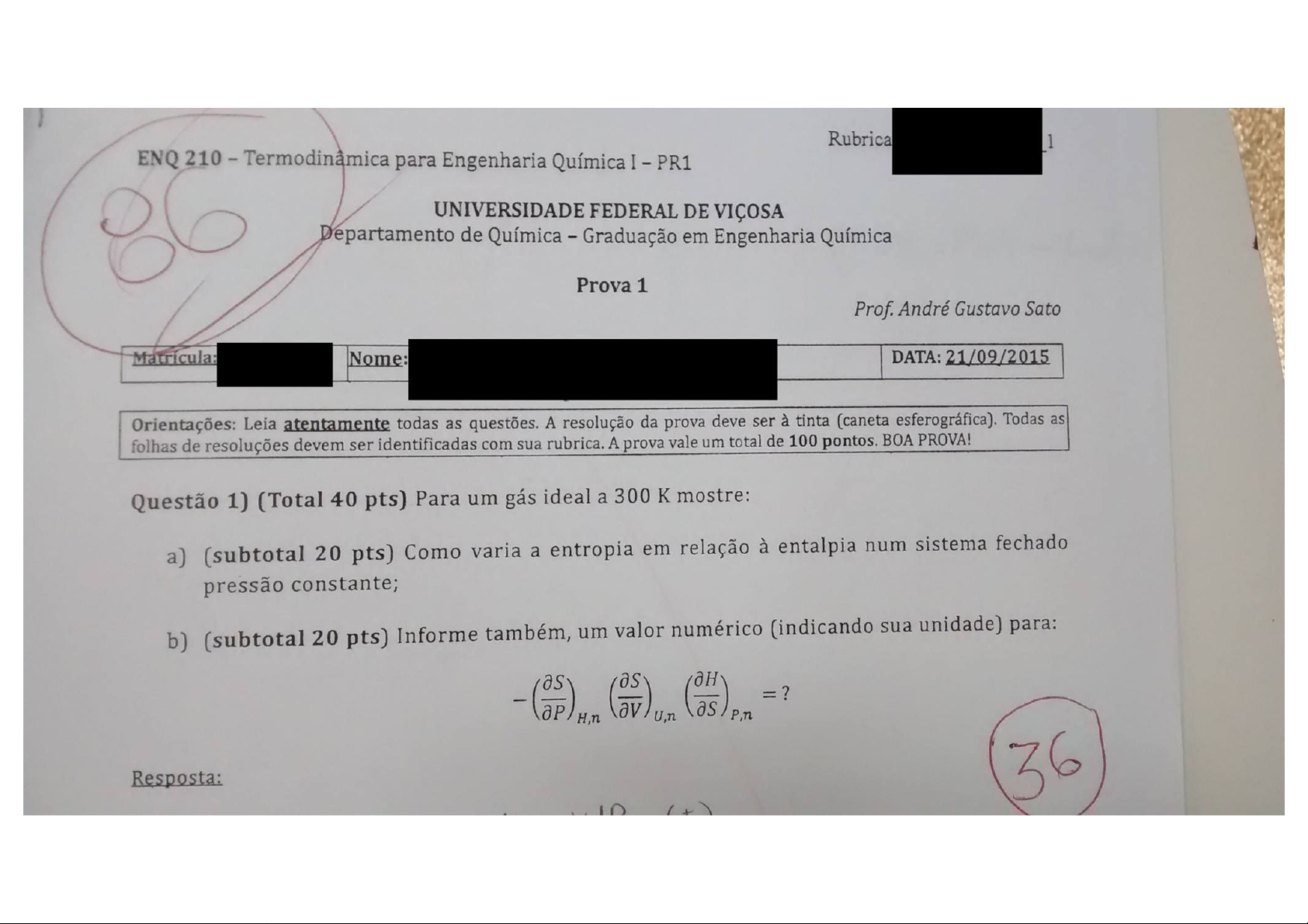 Rubrica 1 ENQ 210 - Termodinâmica para Engenharia Química I - - PR1 UNIVERSIDADE FEDERAL DE VIÇOSA Departamento de Química - Graduação em Engenharia Química Prova 1 Prof. André Gustavo Sato Matrícula: Nome: DATA: 21/09/2015 Orientações: Leia atentamente todas as questões. A resolução da prova deve ser à tinta (caneta esferográfica). Todas as folhas de resoluções devem ser identificadas com sua rubrica. A prova vale um total de 100 pontos. BOA PROVA! Questão 1) (Total 40 pts) Para um gás ideal a 300 K mostre: a) (subtotal 20 pts) Como varia a entropia em relação à entalpia num sistema fechado pressão constante; b) (subtotal 20 pts) Informe também, um valor numérico (indicando sua unidade) para: =? Resposta: 36Rubrica 3 ENQ 210 - Termodinâmica para Engenharia Química I PR1 Questão 2) (Total 30 pts) Para cloreto de metila a 100 °C, 0 segundo e 0 terceiro coeficiente do tipo virial são: B = -242,5 cm³ mol⁻¹ = 25200 cm⁶ mol⁻² Calcule a variação de entropia, em [J/mol K], do sistema vizinhança e do universo na compressão isotérmica, mecanicamente reversível, de 1 mol de cloreto de metila de 1 bar até 20 bar, a 100 °C. Tome como base para seus cálculos a equação de estado do tipo virial truncado no terceiro termo: Faça pelo menos 3 iterações ! Resposta: PV B + C = RT 20Rubrica 5 ENQ 210 - Termodinâmica para Engenharia Química I - PR1 Questão 3) (Total 30 pts) Um mol de gás propano expande-se de 0,001 m³ até 0,040 m³ quando em contato com um banho de aquecimento a 100°C. A expansão não é reversível. 0 calor extraído do banho é de 10,4 kJ. Utilize a equação de van der Waals para calcular traba- lho na expansão. Expresse sua resposta em Joule. Dados: A constante de van der Waals para o pròpano : a = 0,96 cal L. bar J R = 1,987 = 0,08314 = 8,314 mol K mol mol Resposta: P RT a 30 (v-b) P