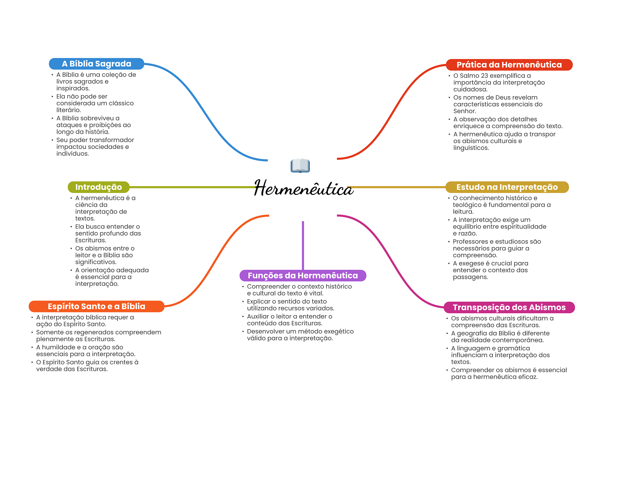A Bíblia Sagrada Prática da Hermenêutica A Bíblia é uma coleção de Salmo 23 exemplifica a livros sagrados e importância da interpretação inspirados. cuidadosa. Ela não pode ser Os nomes de Deus revelam considerada um clássico características essenciais do literário. Senhor. A Bíblia sobreviveu a A observação dos detalhes ataques e proibições ao enriquece a compreensão do texto. longo da história. A hermenêutica ajuda a transpor Seu poder transformador OS abismos culturais e impactou sociedades e linguísticos. indivíduos. Introdução Hermenêutica Estudo na Interpretação A hermenêutica é a O conhecimento histórico e ciência da teológico é fundamental para a interpretação de leitura. textos. A interpretação exige um Ela busca entender equilíbrio entre espiritualidade sentido profundo das e razão. Escrituras. Professores e estudiosos são Os abismos entre O necessários para guiar a leitor e a Bíblia são compreensão. significativos. A exegese é crucial para A orientação adequada entender O contexto das é essencial para a Funções da Hermenêutica passagens. interpretação. Compreender contexto histórico e cultural do texto é vital. Explicar sentido do texto Espírito Santo e a Bíblia utilizando recursos variados. Transposição dos Abismos A interpretação bíblica requer a Auxiliar leitor a entender Os abismos culturais dificultam a ação do Espírito Santo. conteúdo das Escrituras. compreensão das Escrituras. Somente regenerados compreendem Desenvolver um método exegético A geografia da Bíblia é diferente plenamente as Escrituras. válido para a interpretação. da realidade contemporânea. A humildade e a oração são A linguagem e gramática essenciais para a interpretação. influenciam a interpretação dos Espírito Santo guia crentes à textos. verdade das Escrituras. Compreender os abismos é essencial para a hermenêutica eficaz.