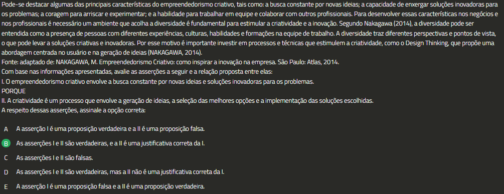 Pode-se destacar algumas das principais características do empreendedorismo criativo, tais como: a busca constante por novas ideias; a capacidade de enxergar soluções inovadoras para problemas; a coragem para arriscar e experimentar; e a habilidade para trabalhar em equipe e colaborar com outros profissionais. Para desenvolver essas características nos negócios e nos profissionais é necessário um ambiente que acolha a diversidade é fundamental para estimular a criatividade e a inovação. Segundo Nakagawa (2014), a diversidade pode ser entendida como a presença de pessoas com diferentes experiências, culturas, habilidades e formações na equipe de trabalho. A diversidade traz diferentes perspectivas e pontos de vista, que pode levar a soluções criativas e inovadoras. Por esse motivo é importante investir em processos e técnicas que estimulem a criatividade, como Design Thinking, que propõe uma abordagem centrada no usuário e na geração de ideias (NAKAGAWA, 2014). Fonte: adaptado de: NAKAGAWA, M. Empreendedorismo Criativo: como inspirar a inovação na empresa. São Paulo: Atlas, 2014. Com base nas informações apresentadas, avalie as asserções a seguir e a relação proposta entre elas: 0 empreendedorismo criativo envolve a busca constante por novas ideias e soluções inovadoras para problemas. PORQUE II. A criatividade é um processo que envolve a geração de ideias, a seleção das melhores opções e a implementação das soluções escolhidas. A respeito dessas asserções, assinale a opção correta: A A asserção é uma proposição verdadeira e a II é uma proposição falsa. As asserções le II são verdadeiras, e a II é uma justificativa correta da As asserções le II são falsas. D As asserções le são verdadeiras, mas a II não é uma justificativa correta da E A asserção é uma proposição falsa e a é uma proposição verdadeira.