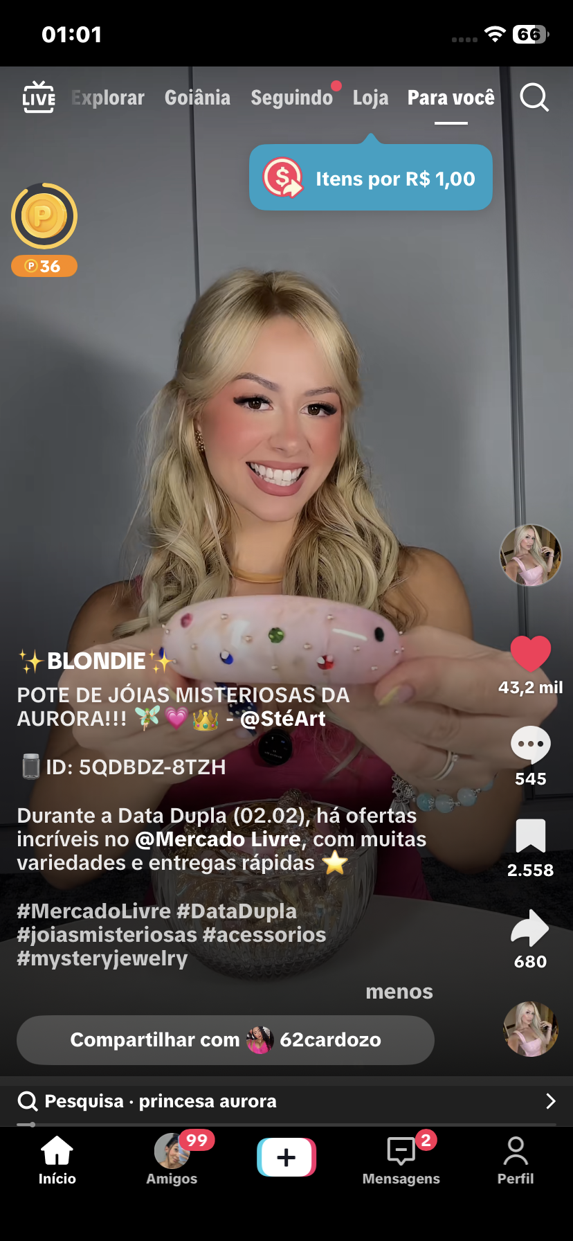 01:01 66 LIVE Explorar Goiânia Seguindo Loja Para você $ Itens por R$ 1,00 P P36 BLONDIE POTE DE JÓIAS MISTERIOSAS DA 43,2 mil AURORA!!! @StéArt ID: 5QDBDZ-8TZH 545 Durante a Data Dupla (02.02), há ofertas incríveis no @Mercado Livre, com muitas variedades e entregas rápidas 2.558 #MercadoLivre #DataDupla #joiasmisteriosas #acessorios #mysteryjewelry 680 menos Compartilhar com 62cardozo Pesquisa . princesa aurora 99 2 + Início Amigos Mensagens Perfil
