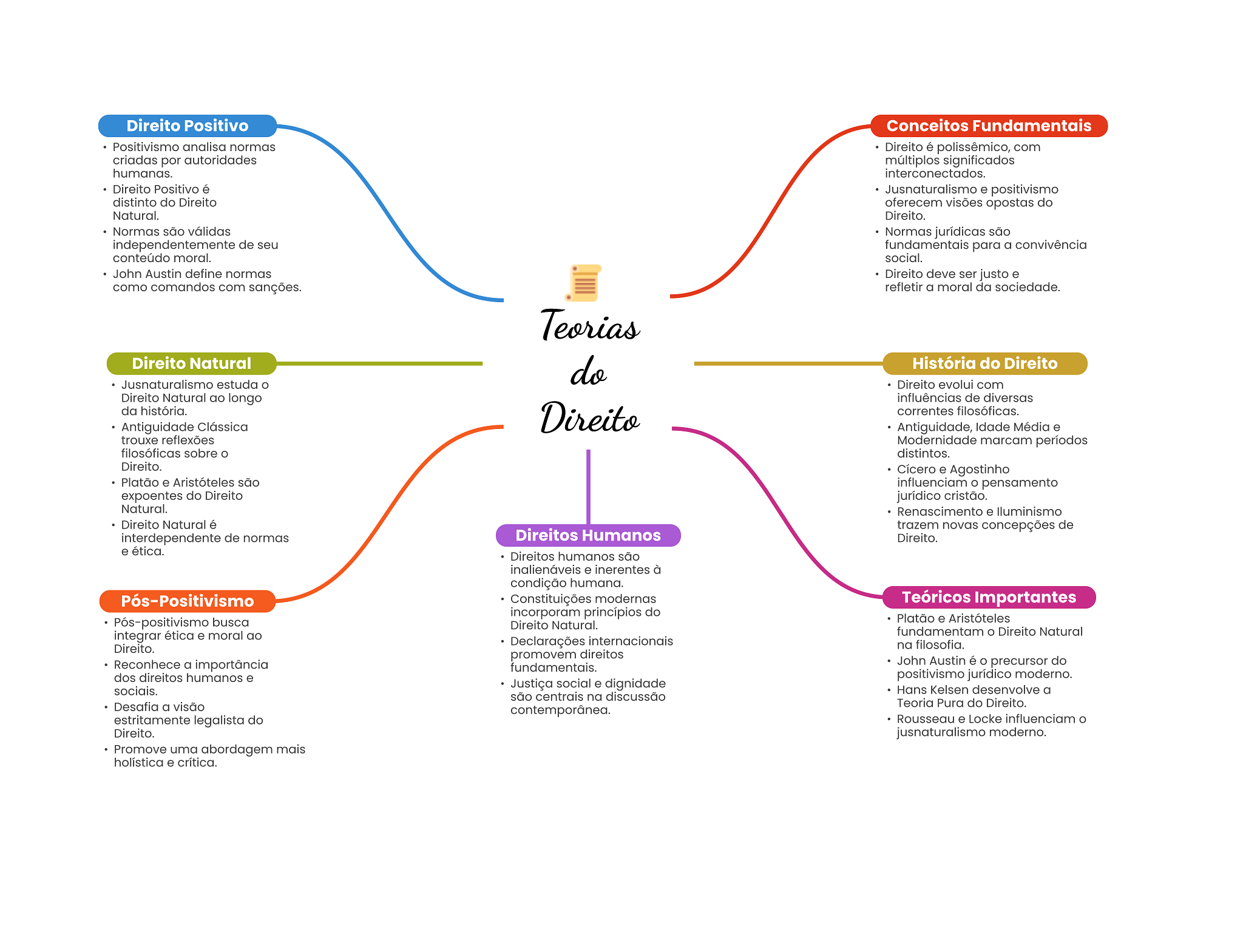 Direito Positivo Conceitos Fundamentais Positivismo analisa normas Direito é polissêmico, com criadas por autoridades múltiplos significados humanas. interconectados. Direito Positivo é Jusnaturalismo e positivismo distinto do Direito oferecem visões opostas do Natural. Direito. Normas são válidas Normas jurídicas são independentemente de seu fundamentais para a convivência conteúdo moral. social. John Austin define normas Direito deve ser justo e como comandos com sanções. refletir a moral da sociedade. Teorias Direito Natural do História do Direito Jusnaturalismo estuda Direito evolui com Direito Natural ao longo influências de diversas da história. Antiguidade Clássica Direito correntes filosóficas. Antiguidade, Idade Média e trouxe reflexões Modernidade marcam períodos filosóficas sobre distintos. Direito. Cícero e Agostinho Platão e Aristóteles são influenciam pensamento expoentes do Direito jurídico cristão. Natural. Renascimento e Direito Natural é trazem novas concepções de interdependente de normas Direitos Humanos Direito. e ética. Direitos humanos são inalienáveis e inerentes à condição humana. Pós-Positivismo Constituições modernas Teóricos Importantes incorporam princípios do Pós-positivismo busca Platão e Aristóteles Direito Natural. integrar ética e moral ao fundamentam Direito Natural Direito. Declarações internacionais na filosofia. promovem direitos Reconhece a importância fundamentais. John Austin é precursor do dos direitos humanos e positivismo jurídico moderno. Justiça social e dignidade sociais. Hans Kelsen desenvolve a são centrais na discussão Desafia a visão Teoria Pura do Direito. contemporânea. estritamente legalista do Rousseau e Locke influenciam Direito. jusnaturalismo moderno. Promove uma abordagem mais holística e crítica.