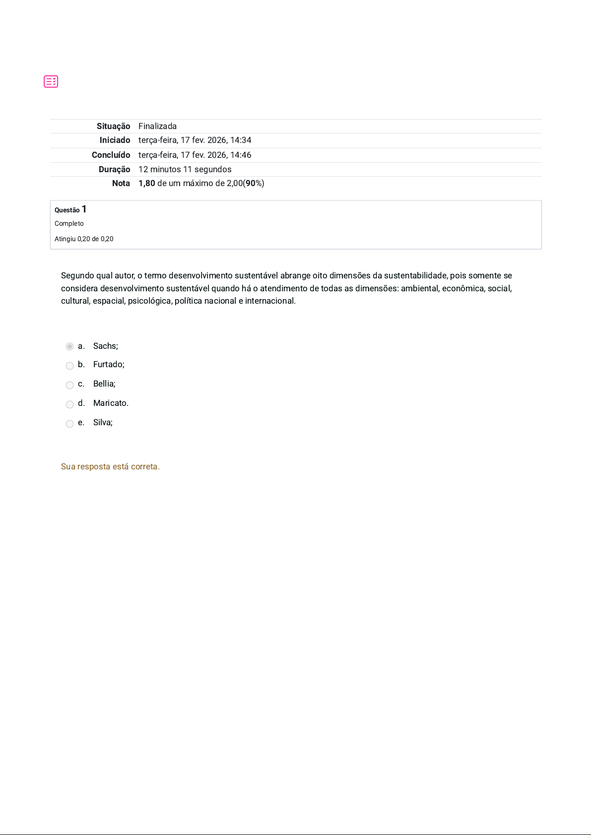Situação Finalizada Iniciado terça-feira, 17 fev. 2026, 14:34 Concluído terça-feira, 17 fev. 2026, 14:46 Duração 12 minutos 11 segundos Nota 1,80 de um máximo de 2,00(90%) Questão 1 Completo Atingiu 0,20 de 0,20 Segundo qual autor, o termo desenvolvimento sustentável abrange oito dimensões da sustentabilidade, pois somente se considera desenvolvimento sustentável quando há o atendimento de todas as dimensões: ambiental, econômica, social, cultural, espacial, psicológica, política nacional e internacional. a. Sachs; b. Furtado; c. Bellia; d. Maricato. e. Silva; Sua resposta está correta. Questão 2 Completo Atingiu 0,00 de 0,20 O investimento em infraestrutura é fundamental na otimização dos subsistemas urbanos e na priorização da saúde humana. A abordagem chave estaria na introdução de soluções baseadas na natureza dentro das cidades. Nesse sentido, existem alguns aspectos fundamentais para auxiliar nessa função. Assinale Verdadeiro (V) ou Falso (F): ( ) Utilizar uma abordagem integrada “azul-verde” na gestão dos recursos da água (incluindo águas negras, cinzas, e de tempestades) e o projeto das áreas verdes urbanas. ( ) Revalorizar e restaurar ecossistemas degradados, e buscar a contaminação do ar, água e solos. ( ) Proteger e aumentar a biodiversidade nas cidades. ( ) Melhorar as opções e a utilização de transportes sustentáveis, não incluindo a priorização de meios de transporte não- motorizados e de transporte público de massa. a. V - F - V - F; b. V - V - V - V; c. F - V - F - V; d. V - V - V - F. e. F - F - F - F; Sua resposta está incorreta. Questão 3 Completo Atingiu 0,20 de 0,20 Em 2014, a humanidade usou, em um ano, cerca de 50% a mais de recursos do que o planeta é capaz de regenerar. Isto tem implicações para as necessidades humanas básicas, tais como o acesso a alimentos e à água potável, e, finalmente, para a sobrevivência humana. As tentativas para transformar os padrões de consumo e de recursos, precisam reconhecer que esta não é apenas uma questão ambiental. Diante desse pressuposto, assinale a alternativa correta: I - Os níveis atuais médios de consumo europeus são três vezes maiores do que os asiáticos, e cinco vezes superiores à média africana. II - Os níveis atuais médios de consumo europeus são duas vezes maiores do que os asiáticos, e quatro vezes superiores à média africana. III - Os níveis atuais médios de consumo europeus são três vezes maiores do que os asiáticos, e quatro vezes superiores à média africana. IV - Os níveis atuais médios de consumo europeus são três vezes maiores do que os asiáticos, e duas vezes superiores à média africana. a. Nenhuma das alternativas esta correta. b. Apenas II está correta. c. Apenas IV está correta. d. Apenas I está correta. e. Apenas III está correta. Sua resposta está correta. Questão 4 Completo Atingiu 0,20 de 0,20 Questão 5 Completo Atingiu 0,20 de 0,20 Sobre os conceitos básicos da ecologia e a importância das inter-relações ecológicas, confira as afirmações a seguir: I - A ecologia é uma ciência, que considera as interações entre todos os participantes de ecossistemas, incluindo seres humanos e é de extrema importância para os mesmos. II - A ecologia é a ciência que estuda as relações entre os seres vivos e os meios onde vivem. A palavra deriva do grego oikos, que significa lugar onde se vive, ou seja, meio ambiente. III - Metzger, (2001, p. 105) situa a ecologia como uma ciência emergente e que define os aspectos do ambiente que têm influência direta na saúde humana. Assinale a alternativa correta: a. Apenas I e III estão corretas; b. Apenas I e II estão corretas; c. Apenas II está correta. d. Apenas II e III estão corretas; e. Todas as alternativas estão corretas; Sua resposta está correta. Sobre Sustentabilidade Empresarial, segundo Phillip Junior, Sampaio e Fernandes (2017), quais são os conceitos relacionados a este tópico. Assinale a alternativa correta: a. Avaliação do ciclo de vida, cadeia de suprimentos e logística inversa. b. Avaliação do ciclo de vida, cadeia de suprimentos amarelo, logística inversa. c. Avaliação do ciclo de vida, cadeia de suprimentos verde, logística reversa, produção + limpa e produção enxuta. d. Logística inversa e cadeia de suprimentos verde. e. Produção + limpa e produção enxuta e logística reversa. Sua resposta está correta. Questão 6 Completo Atingiu 0,20 de 0,20 Questão 7 Completo Atingiu 0,20 de 0,20 O conceito de Produção + Limpa corresponde a diminuir o impacto do processo produtivo por meio de ferramentas de gestão ambiental dos processos produtivos das organizações, que se preocupam com as saídas dos processos (resíduos, emissões, efluentes). Qual caráter tem este processo? Assinale a altenativa correta: a. Educacional; b. Competitivo; c. Ambiental; d. Preventivo; e. Empresarial. Sua resposta está correta. Para Leite e Viana (2001) a Pegada Ecológica é um indicador de sustentabilidade, uma metodologia de contabilidade ambiental utilizada para medir a pressão do impacto do homem sobre a Terra, permitindo calcular permite calcular a área de terreno produtivo em hectares globais, necessários para sustentar o estilo de vida das pessoas no mundo. Como são contabilizados vários aspectos econômicos e ambientais? Assinale Verdadeiro (V) ou Falso (F): ( ) Área arável usada para produzir alimentos para a população; ( ) Área usada em pastagens; ( ) Área usada para urbanização; ( ) Área verde que deve ser disponibilizada para a absorção do CO2 produzido pelas atividades; ( ) Área de florestas para fornecer recursos naturais, principalmente madeira. a. V - F - V - F - V b. V - V - V - V - V c. F - F - V - V - V d. F - V - F - F - F e. V - F - F - F - V Sua resposta está correta. Questão 8 Completo Atingiu 0,20 de 0,20 Questão 9 Completo Atingiu 0,20 de 0,20 A NBR ISO 14031 trata especificamente da Avaliação de