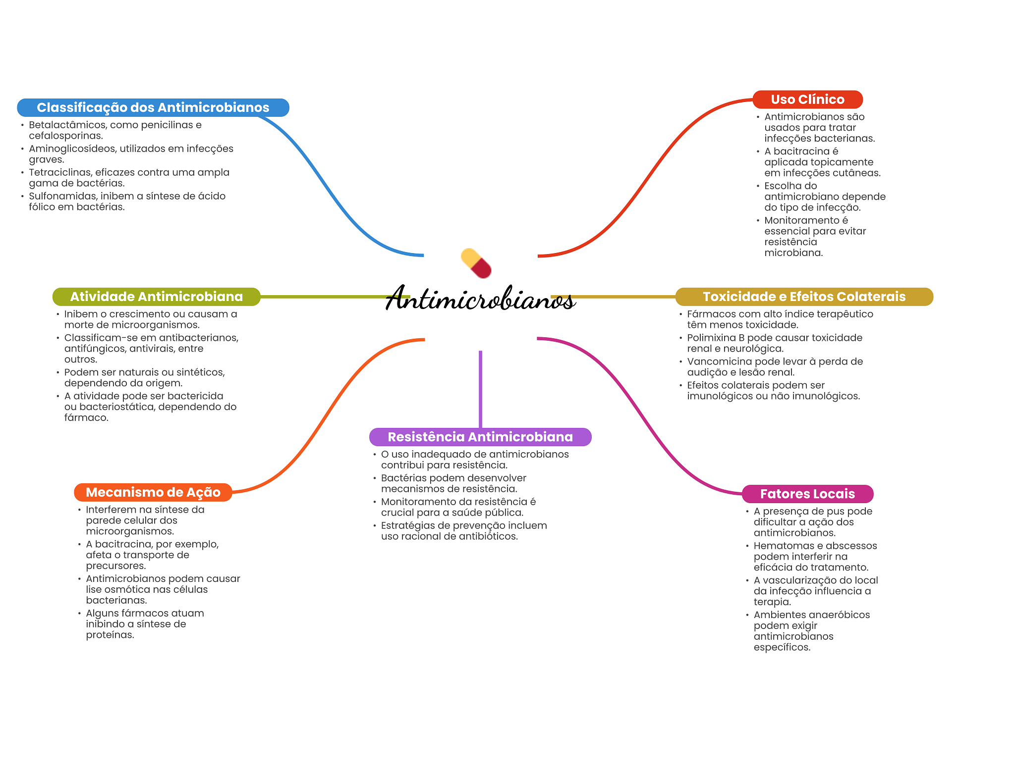 Uso Clínico Classificação dos Antimicrobianos Antimicrobianos são Betalactâmicos, como penicilinas e usados para tratar cefalosporinas. infecções bacterianas. Aminoglicosídeos, utilizados em infecções A bacitracina é graves. aplicada topicamente Tetraciclinas, eficazes contra uma ampla em infecções cutâneas. gama de bactérias. Escolha do Sulfonamidas, inibem a síntese de ácido antimicrobiano depende fólico em bactérias. do tipo de infecção. Monitoramento é essencial para evitar resistência microbiana. Atividade Antimicrobiana Antimicrobianos Toxicidade e Efeitos Colaterais Inibem crescimento ou causam a Fármacos com alto índice terapêutico morte de microorganismos. têm menos toxicidade. Classificam-se em antibacterianos, Polimixina B pode causar toxicidade antifúngicos, antivirais, entre renal e neurológica. outros. Vancomicina pode levar à perda de Podem ser naturais ou sintéticos, audição e lesão renal. dependendo da origem. Efeitos colaterais podem ser A atividade pode ser bactericida imunológicos ou não imunológicos. ou bacteriostática, dependendo do fármaco. Resistência Antimicrobiana uso inadequado de antimicrobianos contribui para resistência. Bactérias podem desenvolver Mecanismo de Ação mecanismos de resistência. Fatores Locais Monitoramento da resistência é Interferem na síntese da crucial para a saúde pública. A presença de pus pode parede celular dos microorganismos. Estratégias de prevenção incluem dificultar a ação dos uso racional de antibióticos. antimicrobianos. A bacitracina, por exemplo, Hematomas e abscessos afeta transporte de podem interferir na precursores. eficácia do tratamento. Antimicrobianos podem causar A vascularização do local lise osmótica nas células da infecção influencia a bacterianas. terapia. Alguns fármacos atuam Ambientes anaeróbicos inibindo a síntese de podem exigir proteínas. antimicrobianos específicos.