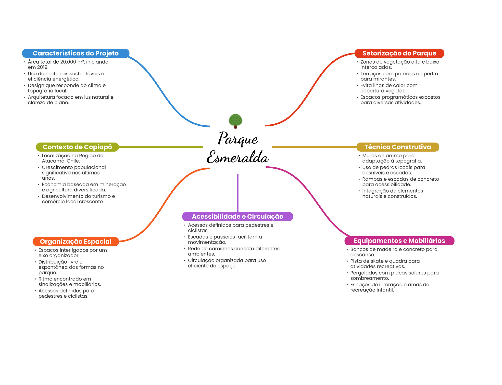Características do Projeto Setorização do Parque Área total de 20.000 m², iniciando Zonas de vegetação alta e baixa em 2019. intercaladas. Uso de materiais sustentáveis e Terraços com paredes de pedra eficiência energética. para mirantes. Design que responde ao clima e Evita ilhas de calor com topografia local. cobertura vegetal. Arquitetura focada em luz natural e Espaços programáticos expostos clareza de plano. para diversas atividades. Parque Contexto de Copiapó Técnica Construtiva Localização na Região de Atacama, Chile. Esmeralda Muros de arrimo para adaptação à topografia. Crescimento populacional Uso de pedras locais para significativo nos últimos desníveis e escadas. anos. Rampas e escadas de concreto Economia baseada em mineração para acessibilidade. e agricultura diversificada. Integração de elementos Desenvolvimento do turismo e naturais e construídos. comércio local crescente. Acessibilidade e Circulação Acessos definidos para pedestres e ciclistas. Escadas e passeios facilitam a Organização Espacial movimentação. Equipamentos e Mobiliários Espaços interligados por um Rede de caminhos conecta diferentes Bancos de madeira e concreto para eixo organizador. ambientes. descanso. Distribuição livre e Circulação organizada para uso Pista de skate e quadra para espontânea das formas no eficiente do espaço. atividades recreativas. parque. Pergolados com placas solares para Ritmo encontrado em sombreamento. sinalizações e mobiliários. Espaços de interação e áreas de Acessos definidos para recreação infantil. pedestres e ciclistas.