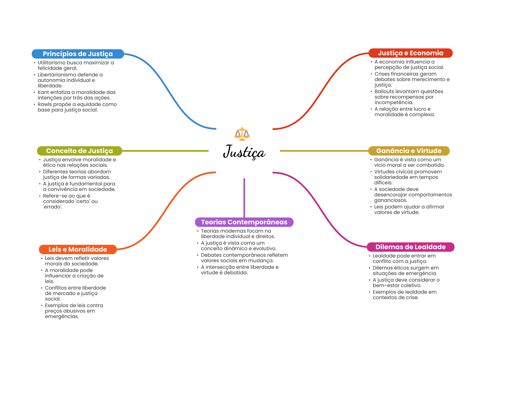Princípios de Justiça Justiça e Economia Utilitarismo busca maximizar a A economia influencia a felicidade geral. percepção de justiça social. Libertarianismo defende a Crises financeiras geram autonomia individual e debates sobre merecimento e liberdade. justiça. Kant enfatiza a moralidade das Bailouts levantam questões intenções por trás das ações. sobre recompensas por Rawls propõe a equidade como incompetência. base para justiça social. A relação entre lucro e moralidade é complexa. Conceito de Justiça Justiça Ganância e Virtude Justiça envolve moralidade e Ganância é vista como um ética nas relações sociais. vício moral a ser combatido. Diferentes teorias abordam Virtudes cívicas promovem justiça de formas variadas. solidariedade em tempos A justiça é fundamental para difíceis. a convivência em sociedade. A sociedade deve Refere-se ao que é desencorajar comportamentos considerado 'certo' ou gananciosos. 'errado'. Leis podem ajudar a afirmar valores de virtude. Teorias Contemporâneas Teorias modernas focam na liberdade individual e direitos. A justiça é vista como um Leis e Moralidade conceito dinâmico e evolutivo. Dilemas de Lealdade Debates contemporâneos refletem Leis devem refletir valores Lealdade pode entrar em morais da sociedade. valores sociais em mudança. conflito com a justiça. A intersecção entre liberdade e A moralidade pode Dilemas éticos surgem em virtude é debatida. influenciar a criação de situações de emergência. leis. A justiça deve considerar O Conflitos entre liberdade bem-estar coletivo. de mercado e justiça Exemplos de lealdade em social. contextos de crise. Exemplos de leis contra preços abusivos em emergências.