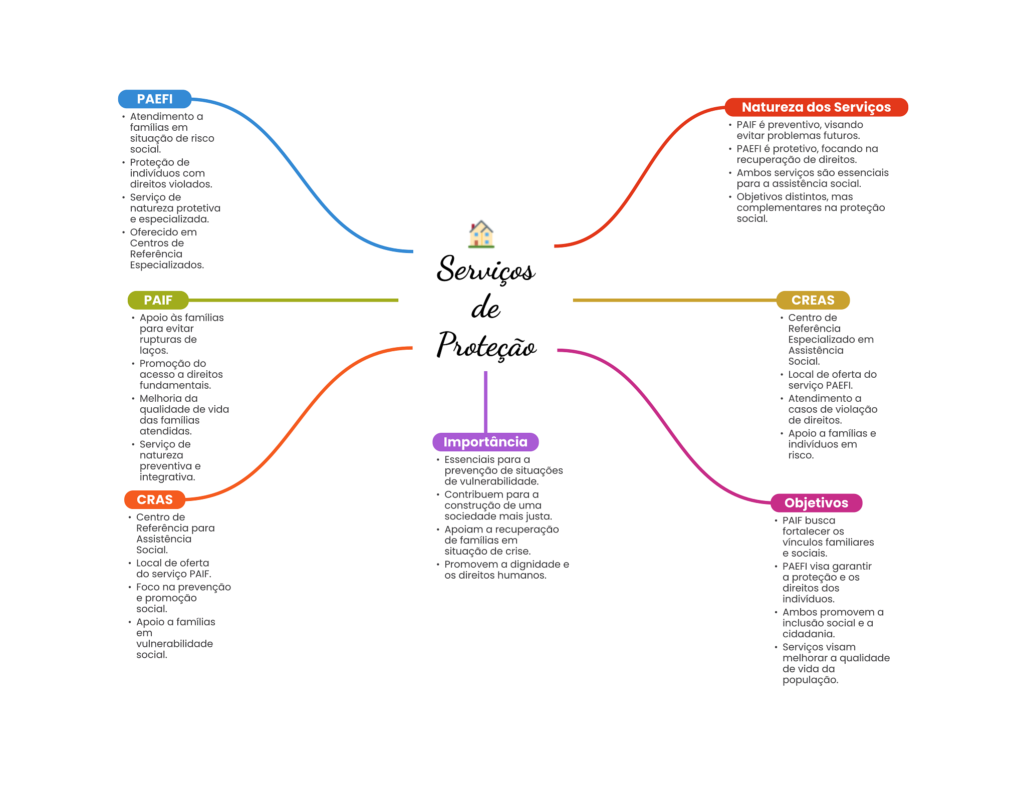 PAEFI Natureza dos Serviços Atendimento a famílias em PAIF é preventivo, visando situação de risco evitar problemas futuros. social. PAEFI é protetivo, focando na Proteção de recuperação de direitos. indivíduos com Ambos serviços são essenciais direitos violados. para a assistência social. Serviço de Objetivos distintos, mas natureza protetiva complementares na proteção e especializada. social. Oferecido em Centros de Referência Especializados. Serviços PAIF de CREAS Apoio às famílias Centro de para evitar Referência rupturas de Proteção Especializado em laços. Assistência Promoção do Social. acesso a direitos Local de oferta do fundamentais. serviço PAEFI. Melhoria da Atendimento a qualidade de vida casos de violação das famílias de direitos. atendidas. Apoio a famílias e Serviço de Importância indivíduos em natureza Essenciais para a risco. preventiva e prevenção de situações integrativa. de vulnerabilidade. CRAS Contribuem para a construção de uma Objetivos Centro de sociedade mais justa. PAIF busca Referência para Apoiam a recuperação fortalecer Assistência de famílias em vínculos familiares Social. situação de crise. e sociais. Local de oferta Promovem a dignidade e PAEFI visa garantir do serviço PAIF. direitos humanos. a proteção e Foco na prevenção direitos dos e promoção indivíduos. social. Ambos promovem a Apoio a famílias inclusão social e a em cidadania. vulnerabilidade Serviços visam social. melhorar a qualidade de vida da população.