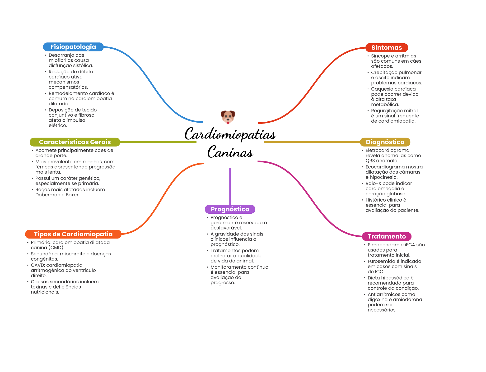 Fisiopatologia Sintomas Desarranjo das Síncope e arritmias miofibrilas causa são comuns em cães disfunção sistólica. afetados. Redução do débito Crepitação pulmonar cardíaco ativa e ascite indicam mecanismos problemas cardíacos. compensatórios. Caquexia cardíaca Remodelamento cardíaco é pode ocorrer devido comum na cardiomiopatia à alta taxa dilatada. metabólica. Deposição de tecido Regurgitação mitral conjuntivo e fibroso é um sinal frequente afeta impulso de cardiomiopatia. elétrico. Cardiomiopatias Características Gerais Diagnóstico Acomete principalmente cães de grande porte. Caninas Eletrocardiograma revela anomalias como Mais prevalente em machos, com QRS anômalo. fêmeas apresentando progressão Ecocardiograma mostra mais lenta. dilatação das câmaras Possui um caráter genético, e hipocinesia. especialmente se primária. Raio-X pode indicar Raças mais afetadas incluem cardiomegalia e Doberman e Boxer. coração globoso. Histórico clínico é essencial para Prognóstico avaliação do paciente. Prognóstico é geralmente reservado a desfavorável. Tipos de Cardiomiopatia A gravidade dos sinais Tratamento clínicos influencia O Primária: cardiomiopatia dilatada canina (CMD). prognóstico. Pimobendam e são Tratamentos podem usados para Secundária: miocardite e doenças melhorar a qualidade tratamento inicial. congênitas. de vida do animal. Furosemida é indicada CAVD: cardiomiopatia Monitoramento contínuo em casos com sinais arritmogênica do ventrículo é essencial para de ICC. direito. avaliação do Dieta hipossódica é Causas secundárias incluem progresso. recomendada para toxinas e deficiências controle da condição. nutricionais. Antiarrítmicos como digoxina e amiodarona podem ser necessários.