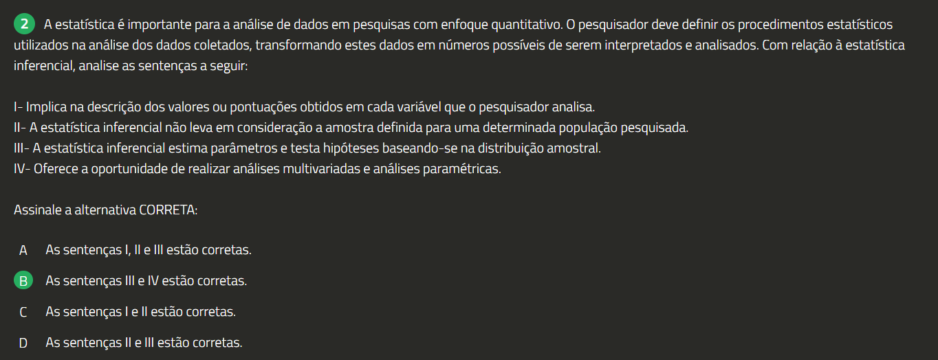 2 A estatística é importante para a análise de dados em pesquisas com enfoque quantitativo. 0 pesquisador deve definir OS procedimentos estatísticos utilizados na análise dos dados coletados, transformando estes dados em números possíveis de serem interpretados e analisados. Com relação à estatística inferencial, analise as sentenças a seguir: Implica na descrição dos valores ou pontuações obtidos em cada variável que 0 pesquisador analisa. II- A estatística inferencial não leva em consideração a amostra definida para uma determinada população pesquisada. III- A estatística inferencial estima parâmetros e testa hipóteses baseando-se na distribuição amostral. IV- Oferece a oportunidade de realizar análises multivariadas e análises paramétricas. Assinale a alternativa CORRETA: A As sentenças I, e III estão corretas. As sentenças III e IV estão corretas. As sentenças I e estão corretas. D As sentenças e III estão corretas.