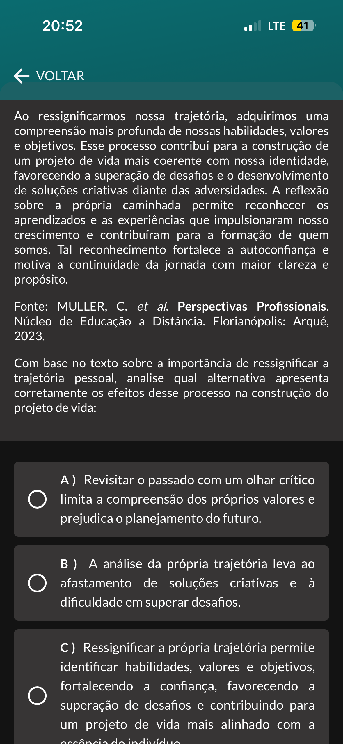 20:52 LTE 41 VOLTAR Ao ressignificarmos nossa trajetória, adquirimos uma compreensão mais profunda de nossas habilidades, valores e objetivos. Esse processo contribui para a construção de um projeto de vida mais coerente com nossa identidade, favorecendo a superação de desafios e desenvolvimento de soluções criativas diante das adversidades. A reflexão sobre a própria caminhada permite reconhecer os aprendizados e as experiências que impulsionaram nosso crescimento e contribuíram para a formação de quem somos. Tal reconhecimento fortalece a autoconfiança e motiva a continuidade da jornada com maior clareza e propósito. Fonte: MULLER, et al. Perspectivas Profissionais. Núcleo de Educação a Distância. Florianópolis: Arqué, 2023. Com base no texto sobre a importância de ressignificar a trajetória pessoal, analise qual alternativa apresenta corretamente os efeitos desse processo na construção do projeto de vida: A) Revisitar passado com um olhar crítico limita a compreensão dos próprios valores e prejudica planejamento do futuro. A análise da própria trajetória leva ao afastamento de soluções criativas e à dificuldade em superar desafios. C) Ressignificar a própria trajetória permite identificar habilidades, valores e objetivos, fortalecendo a confiança, favorecendo a superação de desafios e contribuindo para um projeto de vida mais alinhado com a do indivíduo