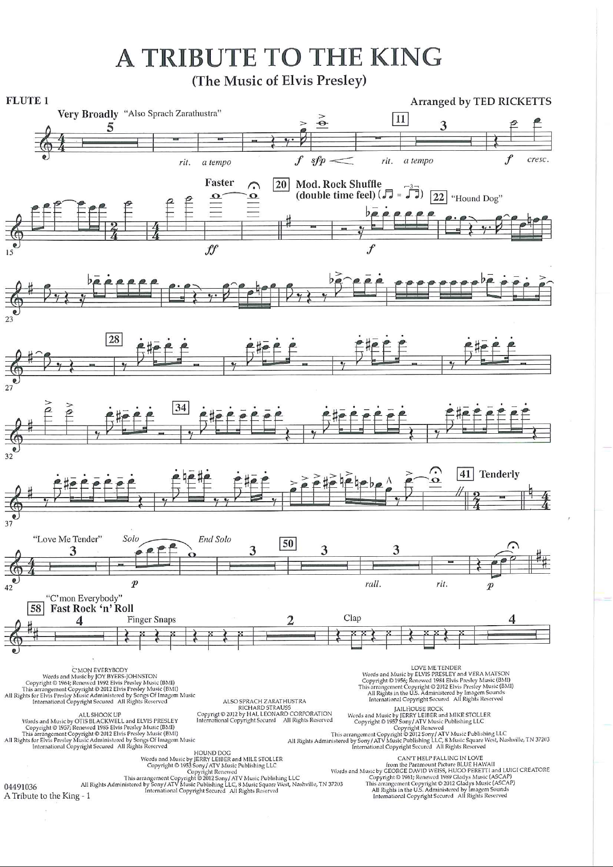 A TRIBUTE TO THE KING (The Music of Elvis Presley) FLUTE 1 Arranged by TED RICKETTS Very Broadly "Also Sprach Zarathustra" V 11 5 > 3 rit. a tempo sfp rit. a tempo cresc. Faster 20 Mod. Rock Shuffle (double time feel) 5 = 22 "Hound Dog" 15 23 28 27 V V 34 32 V 41 Tenderly 37 "Love Me Tender" Solo End Solo 50 3 3 3 3 P rall. 42 rit. "C'mon Everybody" 58 Fast Rock 'n' Roll 4 Finger Snaps 2 Clap 4 X X X C'MON EVERYBODY LOVE ME TENDER Words and Music by JOY BYERS-JOHNSTON Words and Music by ELVIS PRESLEY and VERA MATSON Copyright © 1964; Renewed 1992 Elvis Presley Music (BMI) Copyright © 1956; Renewed 1984 Elvis Presley Music (BMI) This arrangement Copyright © 2012 Elvis Presley Music (BMI) This arrangement Copyright © 2012 Elvis Presley Music (BMI) All Rights for Elvis Presley Music Administered by Songs Of Imagem Music All Rights in the U.S. Administered by Imagem Sounds International Copyright Secured All Rights Reserved ALSO SPRACH ZARATHUSTRA International Copyright Secured All Rights Reserved RICHARD STRAUSS JAILHOUSE ROCK ALL SHOOK UP Copyrigt © 2012 by HAL LEONARD CORPORATION Words and Music by JERRY LEIBER and MIKE STOLLER Words and Music by OTIS BLACKWELL and ELVIS PRESLEY International Copyright Secured All Rights Reserved Copyright © 1957 Sony/ATV Music Publishing LLC Copyright © 1957; Renewed 1985 Elvis Presley Music (BMI) Copyright Renewed This arrangement Copyright © 2012 Elvis Presley Music (BMI) This arrangement Copyright © 2012 Sony/ ATV Music Publishing LLC All Rights for Elvis Presley Music Administered by Songs Of Imagem Music All Rights Administered by Sony/ ATV Music Publishing LLC, 8 Music Square West, Nashville, TN 37203 International Copyright Secured All Rights Reserved International Copyright Secured All Rights Reserved HOUND DOG Words and Music by JERRY LEIBER and MILE STOLLER CAN'T HELP FALLING IN LOVE Copyright © 1953 ATV Music Publishing LLC from the Paramount Picture BLUE HAWAII Copyright Renewed Words and Music by GEORGE DAVID WEISS, HUCO PERETTI and LUIGI CREATORE This arrangement Copyright © 2012 Sony ATV Music Publishing LLC Copyright © 1961; Renewed 1989 Music (ASCAP) 04491036 All Rights Administered by Sony/ATV Music Publishing LLC, 8 Music Square West, Nashville, TN 37203 This arrangement Copyright © 2012 Gladys Music (ASCAP) International Copyright Secured All Rights Reserved All Rights in the U.S. Administered by Imagem Sounds A Tribute to the 1 International Copyright Secured All Rights ReservedFLUTE 1 72 ## 80 V V A V 3 77 88 ## "Jailhouse Rock" 96 Rockabilly (l'istesso tempo) = 3 3 93 104 ## 100 V ## 106 3 3 V V V ^ 112 V V A ^ A > V A V V V ## V ^ A V 120 V 3 # 129 "Can't Help Falling In Love" 145 135 Tenderly, con moto Ob. 1 7 mp 04491036 A Tribute to the 2FLUTE 1 151 Play 148 Ob. Solo mp 154 "All Shook Up" 159 165 Driving Rock 169 4 11 Play 181 180 mf 185 190 V V 198 2 195 206 V V V V 202 sfp V V V V V V V V V 214 V V 208 V A V V V - 215 rit. 04491036 A Tribute to the King 3