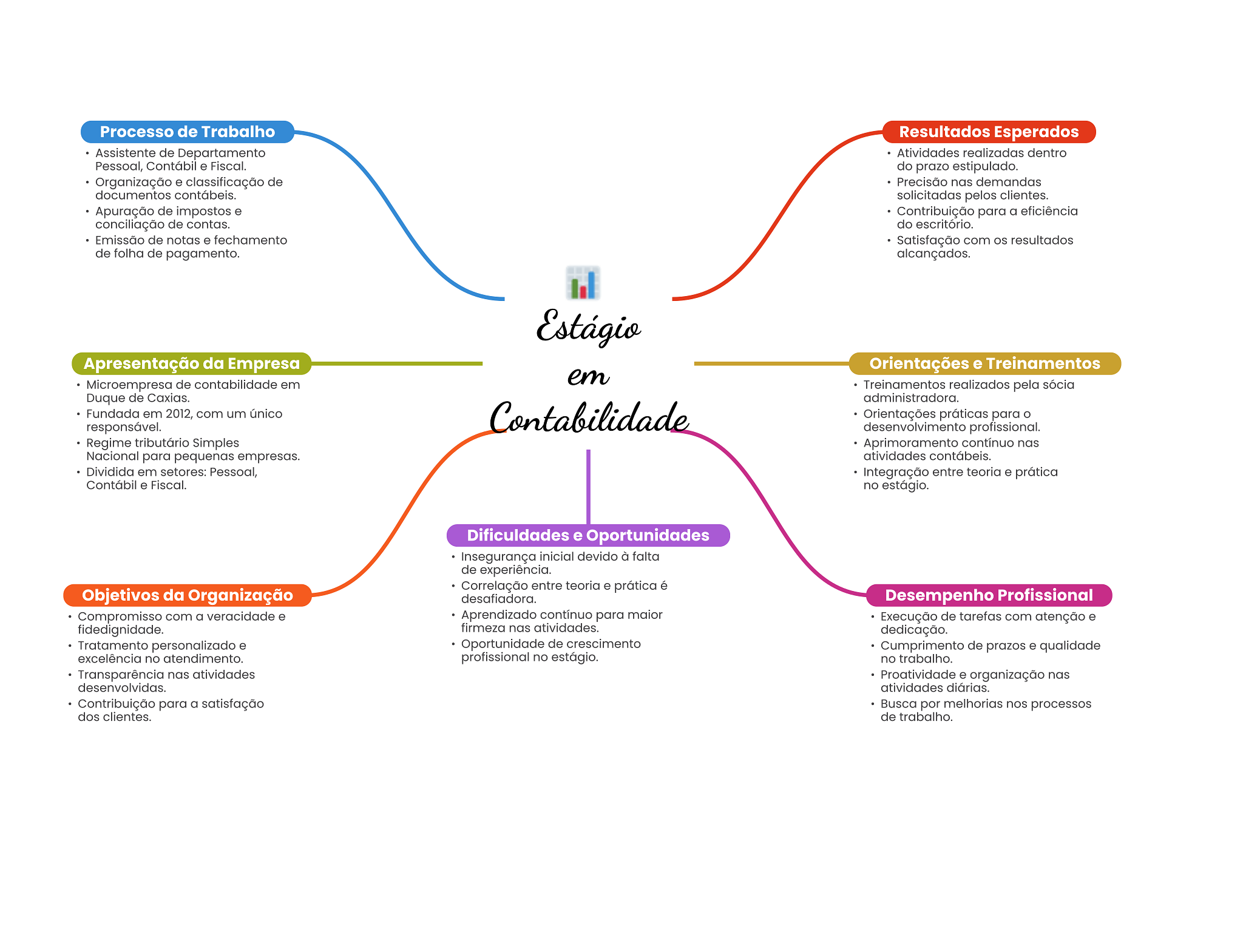 Processo de Trabalho Resultados Esperados Assistente de Departamento Atividades realizadas dentro Pessoal, Contábil e Fiscal. do prazo estipulado. Organização e classificação de Precisão nas demandas documentos contábeis. solicitadas pelos clientes. Apuração de impostos e Contribuição para a eficiência conciliação de contas. do escritório. Emissão de notas e fechamento Satisfação com resultados de folha de pagamento. alcançados. Estágio Apresentação da Empresa Orientações e Treinamentos em Microempresa de contabilidade em Treinamentos realizados pela sócia Duque de Caxias. administradora. Fundada em 2012, com um único responsável. Contabilidade Orientações práticas para desenvolvimento profissional. Regime tributário Simples Aprimoramento contínuo nas Nacional para pequenas empresas. atividades contábeis. Dividida em setores: Pessoal, Integração entre teoria e prática Contábil e Fiscal. no estágio. Dificuldades e Oportunidades Insegurança inicial devido à falta de experiência. Correlação entre teoria e prática é Objetivos da Organização desafiadora. Desempenho Profissional Compromisso com a veracidade e Aprendizado contínuo para maior Execução de tarefas com atenção e fidedignidade. firmeza nas atividades. dedicação. Tratamento personalizado e Oportunidade de crescimento Cumprimento de prazos e qualidade excelência no atendimento. profissional no estágio. no trabalho. Transparência nas atividades Proatividade e organização nas desenvolvidas. atividades diárias. Contribuição para a satisfação Busca por melhorias nos processos dos clientes. de trabalho.