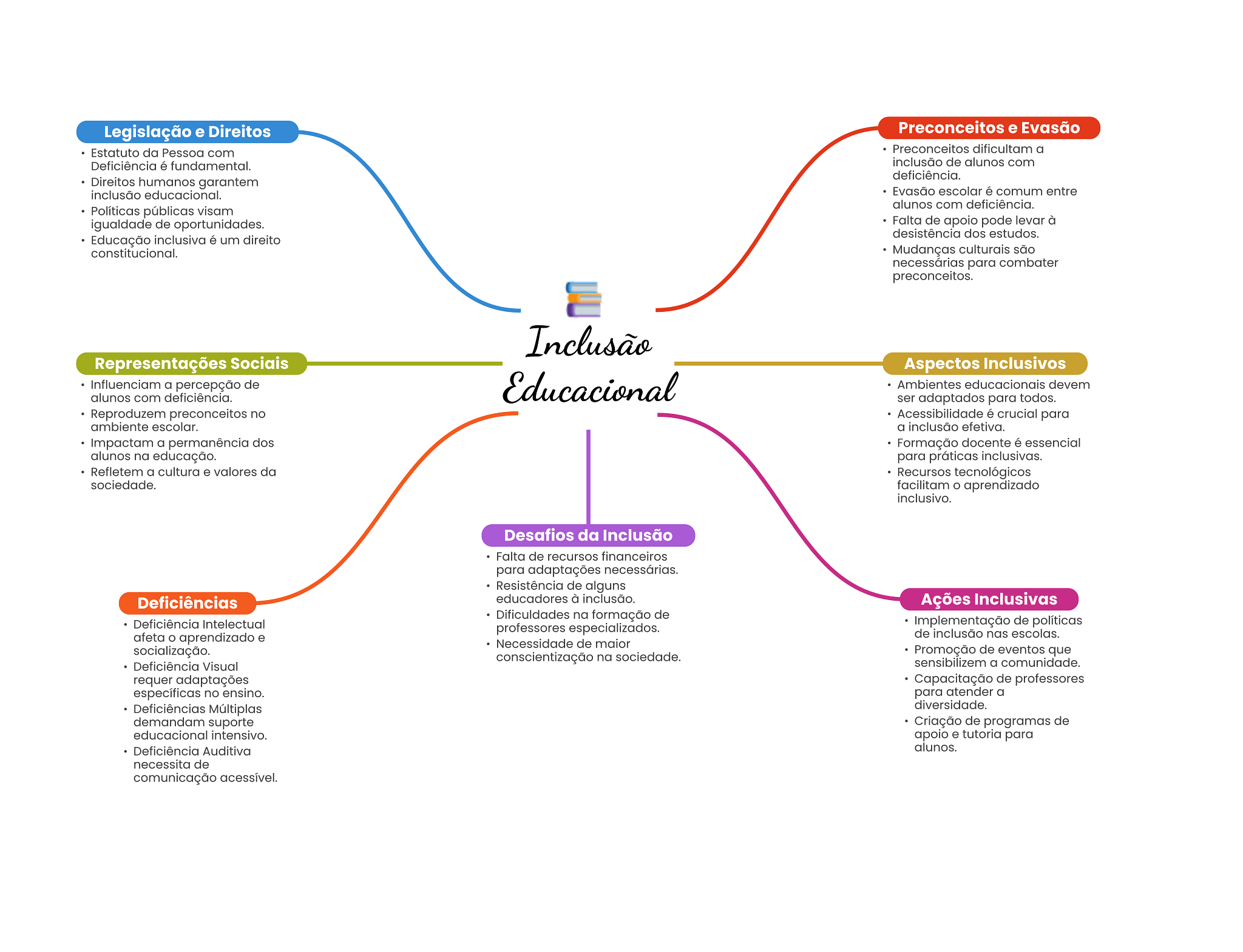 Legislação e Direitos Preconceitos e Evasão Estatuto da Pessoa com Preconceitos dificultam a Deficiência é fundamental. inclusão de alunos com deficiência. Direitos humanos garantem inclusão educacional. Evasão escolar é comum entre alunos com deficiência. Políticas públicas visam igualdade de oportunidades. Falta de apoio pode levar à desistência dos estudos. Educação inclusiva é um direito constitucional. Mudanças culturais são necessárias para combater preconceitos. Inclusão Representações Sociais Aspectos Inclusivos Influenciam a percepção de Educacional Ambientes educacionais devem alunos com deficiência. ser adaptados para todos. Reproduzem preconceitos no Acessibilidade é crucial para ambiente escolar. a inclusão efetiva. Impactam a permanência dos Formação docente é essencial alunos na educação. para práticas inclusivas. Refletem a cultura e valores da Recursos tecnológicos sociedade. facilitam O aprendizado inclusivo. Desafios da Inclusão Falta de recursos financeiros para adaptações necessárias. Resistência de alguns Deficiências educadores à inclusão. Ações Inclusivas Dificuldades na formação de Deficiência Intelectual Implementação de políticas professores especializados. afeta aprendizado e de inclusão nas escolas. Necessidade de maior socialização. Promoção de eventos que conscientização na sociedade. Deficiência Visual sensibilizem a comunidade. requer adaptações Capacitação de professores específicas no ensino. para atender a Deficiências Múltiplas diversidade. demandam suporte Criação de programas de educacional intensivo. apoio e tutoria para Deficiência Auditiva alunos. necessita de comunicação acessível.