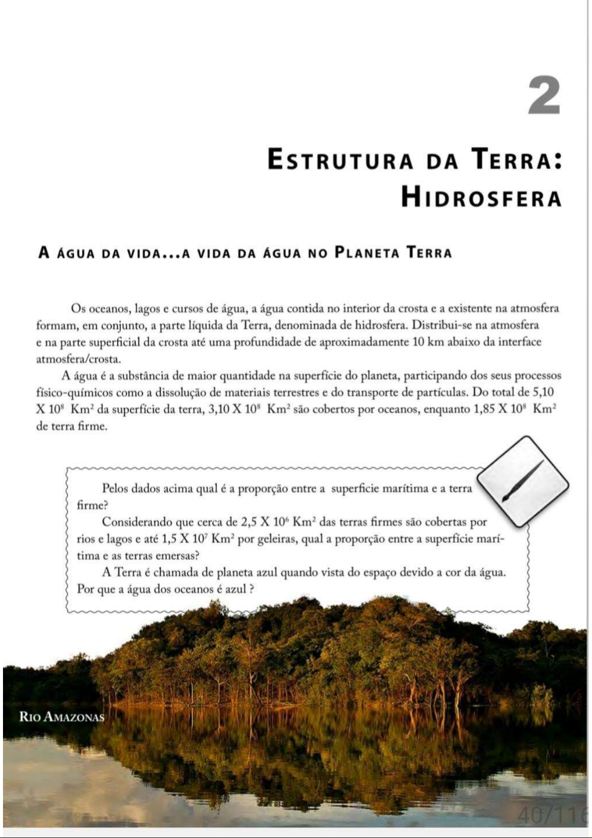 2 ESTRUTURA DA TERRA: HIDROSFERA A ÁGUA DA VIDA...A VIDA DA ÁGUA NO PLANETA TERRA Os oceanos, lagos e cursos de água, a água contida no interior da crosta e a existente na atmosfera formam, em conjunto, a parte líquida da Terra, denominada de hidrosfera. Distribui-se na atmosfera e na parte superficial da crosta até uma profundidade de aproximadamente 10 km abaixo da interface atmosfera/crosta. A água é a substância de maior quantidade na superfície do planeta, participando dos seus processos físico-químicos como a dissolução de materiais terrestres e do transporte de partículas. Do total de 5,10 X 10⁸ Km² da superfície da terra, 3,10 X Km² são cobertos por oceanos, enquanto 1,85 X 10⁸ Km² de terra firme. Pelos dados acima qual é a proporção entre a superficie marítima e a terra firme? Considerando que cerca de 2,5 X 10⁶ Km² das terras firmes são cobertas por rios e lagos e até 1,5 X 10⁷ Km² por geleiras, qual a proporção entre a superfície marí- tima e as terras emersas? A Terra é chamada de planeta azul quando vista do espaço devido a cor da água. Por que a água dos oceanos é azul ? RIO AMAZONAS 40/11A cor da água é um assunto controverso de estudos científicos e equívocos po- pulares. Normalmente diz-se que a água pura é inodora, insípida e incolor. As duas primeiras qualidades são verdadeiras mas a terceira é um grande equívoco popular. Embora quantidades relativamente pequenas de água sejam observadas pelos humanos como transparente, a água pura líquida tem uma cor levemente azul, que se torna um azul intenso quando a espessura da amostra observada aumenta. A cor azul é causada pela absorção seletiva e espalhamento do espectro de luz. Impurezas dissolvidas ou suspensas na água pode dar a água diferentes aparências coloridas. A água é que mantém a vida sobre a Terra, através da fotossíntese, produzindo biomassa pela reação química conhecida entre e H2O. Sabemos que a fotossín- tese é o processo através do qual as plantas clorofiladas, e alguns outros organismos, como microalgas, as cianófitas (algas verde-azuladas) e diversas bactérias, trans- formam a energia luminosa em energia química através da equação simplificada do processo: Qual é nome (usual ou oficial) do composto: CoMo FOI ORIGINADA A ÁGUA LÍQUIDA NO PLANETA? A origem da água na história da formação da Terra está relacionada com a forma- ção da atmosfera através da degaseificação. que é degaseificação? É o processo físico de liberação lenta de gases por um sólido ou líquido. Esse processo pode incluir a sublimação e a evaporação que são transição de fases de uma substância para a fase gasosa, assim como a desorção que infiltra por fendas ou volumes internos os produtos gasosos de lentas reações químicas. Esse fenomeno atuante até hoje, iniciou na fase de resfriamento geral da Terra, após a fase inicial de fusão parcial. Nesse resfriamento gradativo e formação de rochas ígneas, foram liberados gases, principalmente, vapor de água e dióxido de carbono entre vários outros, como subprodutos voláteis da cristalização do magma. Os geólogos defendem que praticamente todo volume de água que compõe hoje a hi- drosfera foi gerada na primeira fase de resfriamento da Terra. A geração de água sob a forma de vapor é observada atualmente em erupções vulcânicas, sendo chamada de água juvenil, respeitando esta mais provável hipótese da origem da água. CICLO HIDROLÓGICO constante intercâmbio entre os reservatórios de água tais como os oceanos, geleiras, rios e lagos, vapor d'agua, água subterrânea e a água contida nos organismos vivos compreende ciclo d'água ou ciclo hidrológico, dinamizado pela energia solar, 30 Ciências Naturais e Matemática UAB 41/116representando processo da dinâmica externa mais importante da Terra. Podemos iniciar com fenomeno da precipitação meteórica, que é a condensação de gotículas a partir do vapor de água presente na atmosfera, resultando nas chuvas. Quando vapor de água transforma-se diretamente em sólido, em cristais de gelo, e estes se ajuntam atingindo tamanho e peso suficientes, haverá a formação de granizo ou neve, responsáveis pelas geleiras nas calotas polares e nos cumes das montanhas. Através da evaporação, parte da precipitação retorna para a atmosfera. Esta fração evaporada adiciona-se ao vapor de água formado sobre solo e aquele liberado pelos processos dos organismos, principalmente as plantas, através da respiração. Todas estes processos de vaporização são denominados de evapotranspiração. A evaporação no caso é causada pela radiação solar e vento e a transpiração pela vegetação. A evapo- transpiração em área florestadas de clima quente e úmido é responsável por até 70% da precipitação. Em ambientes glaciais como se deve dar o retorno da água para a atmosfera? Circulação Atmosférica Energia Solar Vapor de água gases vulcânicos Neve Precipitação meteórica chuva Nivel agua Infiltração superficial em rios Evaporação dos oceanos Lago Vulcanismo Água subterrânea Interface Oceanos Água do mar Fluidos hidrotermais Água em rochas metamórficas Ciclo hidrológico lento: dinâmica interna Ciclo hidrológico rápido: dinâmica externa FONTE: WWW.SUDERHSA.PR.GOV.BR UAB Ciências Naturais e Matemática ESTUDANDO SOBRE A TERRA 31 42/116Nas florestas há uma significativa parcela da precipitação que pode ser retida sobre folhas e caules, sofrendo a evaporação posteriormente. Este processo é chamado de interceptação. Dois caminhos podem ser seguidos pelas gotas das chuvas Como a interceptação que caem sobre o solo: a infiltração e escoamento superfi- pode reduzir a ação ero- cial. A infiltração depende principalmente do tipo de solo. A siva das chuvas? água, direcionada pela força gravitacional, tende a preencher os vazios no subsolo, seguindo em profundidade até corpo de água su