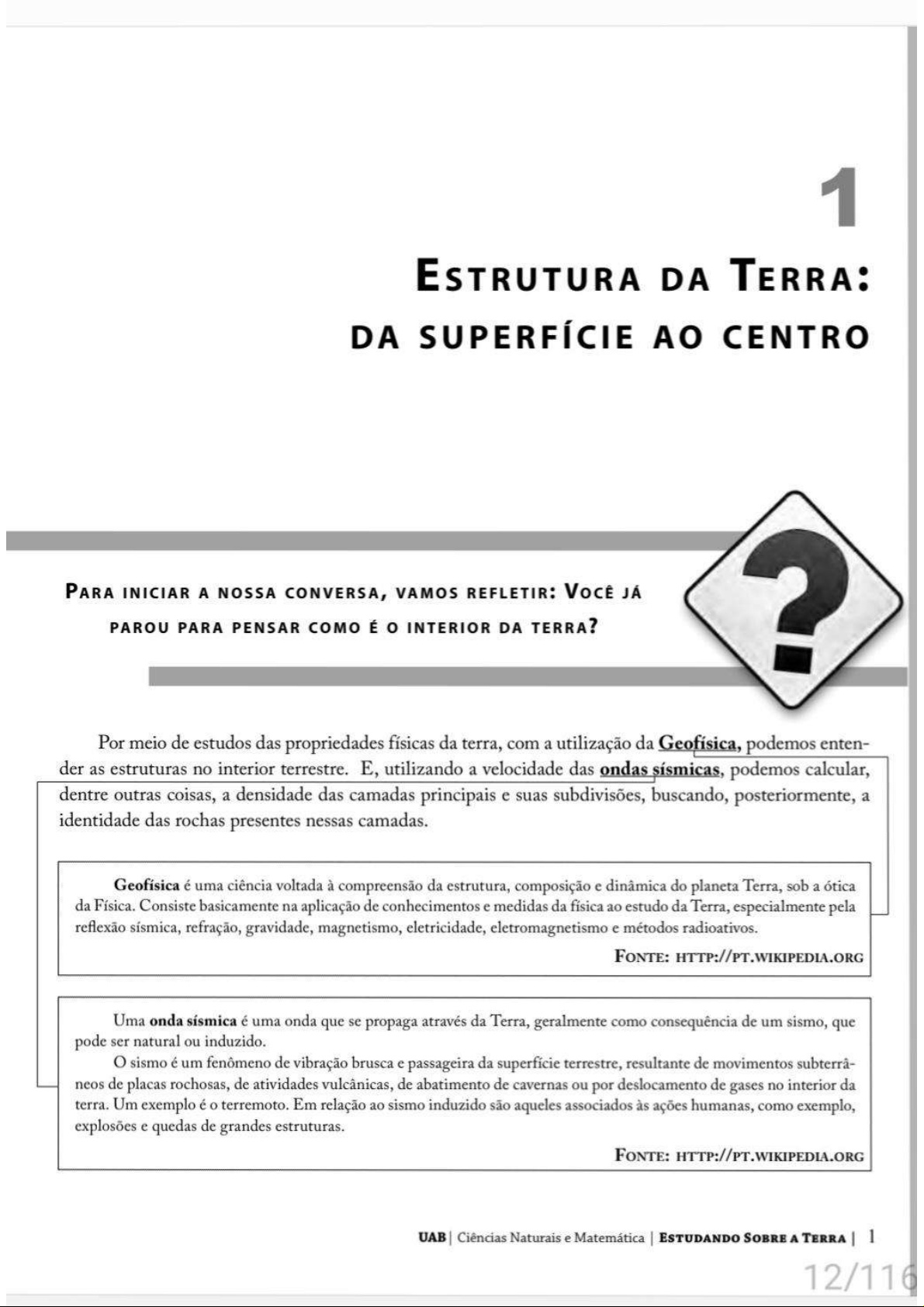 1 ESTRUTURA DA TERRA: DA SUPERFÍCIE CENTRO PARA INICIAR A NOSSA CONVERSA, VAMOS REFLETIR: VOCÊ JÁ PAROU PARA PENSAR COMO É INTERIOR DA TERRA? Por meio de estudos das propriedades físicas da terra, com a utilização da Geofísica, podemos enten- der as estruturas no interior terrestre. E, utilizando a velocidade das ondas sísmicas, podemos calcular, dentre outras coisas, a densidade das camadas principais e suas subdivisões, buscando, posteriormente, a identidade das rochas presentes nessas camadas. Geofísica é uma ciência voltada à compreensão da estrutura, composição e dinâmica do planeta Terra, sob a ótica da Física. Consiste basicamente na aplicação de conhecimentos e medidas da física ao estudo da Terra, especialmente pela reflexão sísmica, refração, gravidade, magnetismo, eletricidade, eletromagnetismo e métodos radioativos. FONTE: Uma onda sísmica é uma onda que se propaga através da Terra, geralmente como consequência de um sismo, que pode ser natural ou induzido. sismo é um fenômeno de vibração brusca e passageira da superfície terrestre, resultante de movimentos subterrâ- neos de placas rochosas, de atividades vulcânicas, de abatimento de cavernas ou por deslocamento de gases no interior da terra. Um exemplo é terremoto. Em relação ao sismo induzido são aqueles associados às ações humanas, como exemplo, explosões e quedas de grandes estruturas. FONTE: UAB Ciências Naturais e Matemática ESTUDANDO SOBRE A TERRA 1 12/116ATMOSFERA Crosta: HIDROSFERA (H,O) CROSTA 25-90Km, + BIOSFERA (H,O,C,N) OCEÂNICA: OCEÂNICA 5-10KM CONTINENTAL 30-80Km 5-11Km, basáltica ZONA DE BAIXA VELOCIDADE MANTO SUPERIOR MANTO SUPERIOR 400 400 MANTO TRANSICIONAL ZONA DE TRANSIÇÃO 650 1050 silicatos de magnésio (e ferro) Descotinuidade MANTO MANTO INFERIOR de Mohorivicic INFERIOR D" 2885 2900 Descotinuidade de Gutenberg NÚCLEO NÚCLEO EXTERNO EXTERNO ferro + sulfeto Profundidade em Km de ferro (líquido) Profundidade em Km 5100 NÚCLEO INTERNO 5145 NÚCLEO INTERNO liga (sólido) de 6400 FIGURA 1A A ESTRUTURA INTERNA DA TERRA 6370 [FONTE: TEXEIRA, W. ET DECIFRANDO A SÃO PAULO: OFICINAS DE TEXTOS, 2000] [FONTE: THE OPEN Os RECURSOS FÍSICOS TERRA FIGURA 1B A ESTRUTURA INTERNA DA TERRA BLOCO 1. CAMPINAS: SP, 1994] DA E A CROSTA TERRESTRE? o QUE SERIA? CoMo É FORMADA? encontrar A crosta desde terrestre rochas é sedimentares, a porção rígida rochas e externa que envolve a terra, onde seus última subprodutos. Segundo por sua vez, Essa assentada porção sobre divide-se em ígneas crosta e continental rochas metamórficas, e crosta oceânica, bem podemo como 2 informações geofísicas e manto também (ver das figura exposições 1A e 1B). rochosas, a crosta con- essa Ciências Naturais e Matemática UABb OBSERVAÇÕES ESTRUTURA DA CROSTA CONTINENTAL SUGERIDA PELAS DE SEÇÕES CRUSTAIS EXPOSTAS materiais Km zona sedimentos 0 ± vulcânicos xistos SUPERIOR/ EPIZONA granitos gnaisses anfibolitos 10 migmatitos INTERMEDIÁRIA/ MESOZONA intrusões máficas NÍVEL CRUSTAL rochas máficas/ ultramáficas gnaisse 20 INFERIOR/ CATAZONA 30Densidade, g/cm³ Quartzo 2,65 Feldspato potássico 2,57 Plagioclásio 2,64 Olivina magnesiana 3,3 Clinopiroxênio 3,3 Ortopiroxênio 3,4 Granada 3,6 Rocha Cₚ (km/s) Granito 6 Gabro 7manto transicional localiza-se entre 400 km e 650 km de profundidade e ca- racteriza-se por apresentar maiores densidades que manto superior (ver figura 1A). Esse aumento de densidade estaria diretamente relacionado a pressões maiores, onde minerais de mesma composição química mudariam de estruturas menos densas, para estruturas mais densas, com menor espaço livre entre os íons constituintes. é uma espécie química eletricamente carregada, geralmente um átomo ou molécula que perdeu ou ganhou elétrons]. Importante observar que, quanto mais densa a rocha, maior a velocidade de propagação das ondas sísmicas. manto inferior, compreende profundidades entre 650 km e 2900 km. Limita-se com núcleo externo, através da descontinuidade de Gutenberg. Essa descontinuidade deve-se ao fato das ondas transversais (tipo S) atravessarem o manto e não atravessarem o núcleo, mostrando se tratar de um meio rígido para outro meio líquido. Esse inter- valo é composto predominantemente por silicatos ferromagnesianos com de estruturas e em menor proporção por silicatos cálcio-aluminosos, óxidos magnésio, a Zona densas alumínio. Na base do manto inferior, entre 2600 km a 2900 de km, uma situa-se diminuição ferro e 1A), que é a zona considerada anômala por se tratar A origem dessa da D (ver velocidade figura das ondas sísmicas com o aumento da profundidade. zona ainda é especulativa. TERRA com-