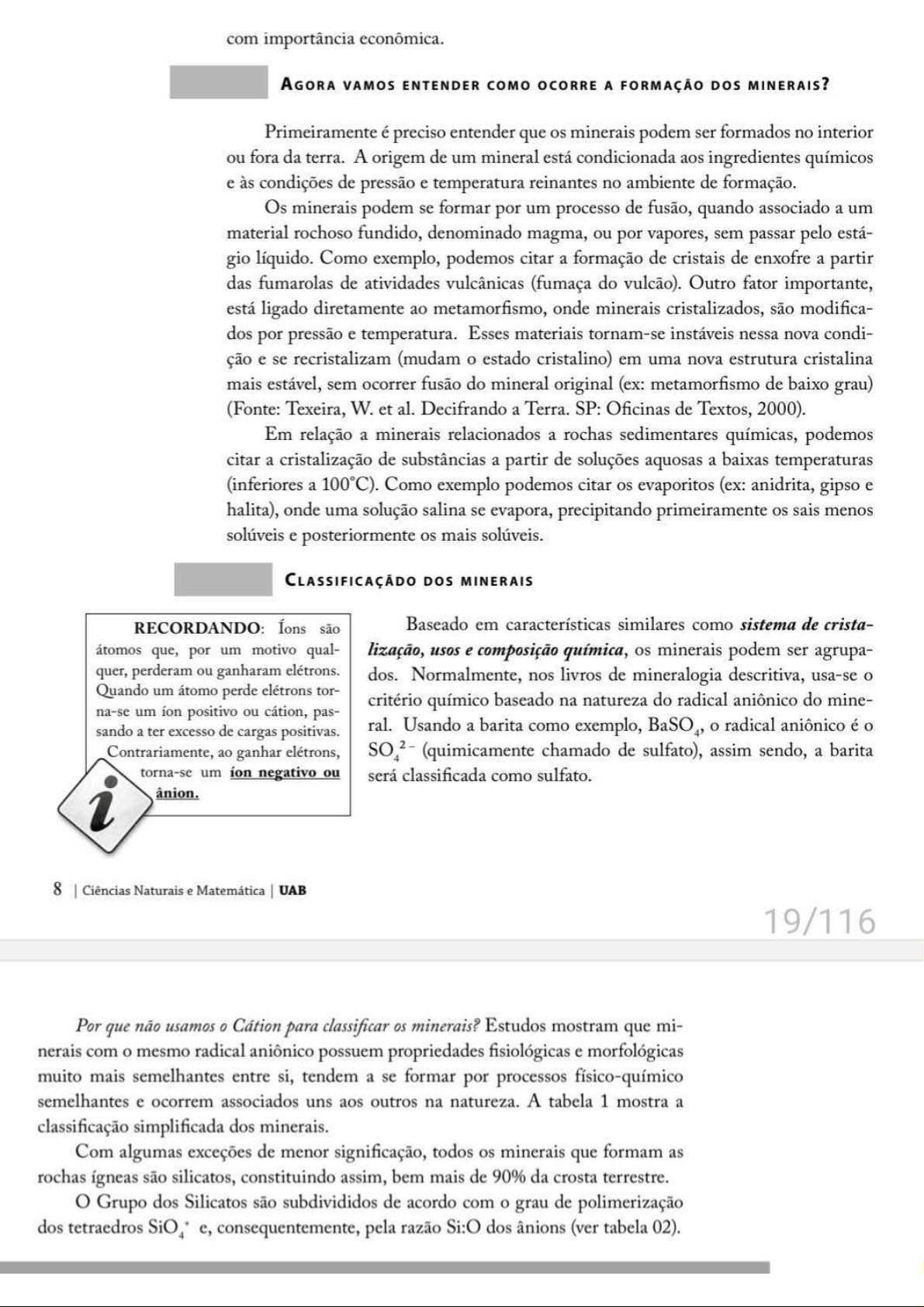 com importância econômica. AGORA VAMOS ENTENDER COMO OCORRE A FORMAÇÃO DOS MINERAIS? Primeiramente é preciso entender que os minerais podem ser formados no interior ou fora da terra. A origem de um mineral está condicionada aos ingredientes químicos e às condições de pressão e temperatura reinantes no ambiente de formação. Os minerais podem se formar por um processo de fusão, quando associado a um material rochoso fundido, denominado magma, ou por vapores, sem passar pelo está- gio líquido. Como exemplo, podemos citar a formação de cristais de enxofre a partir das fumarolas de atividades vulcânicas (fumaça do vulcão). Outro fator importante, está ligado diretamente ao metamorfismo, onde minerais cristalizados, são modifica- dos por pressão e temperatura. Esses materiais tornam-se instáveis nessa nova condi- ção e se recristalizam (mudam o estado cristalino) em uma nova estrutura cristalina mais estável, sem ocorrer fusão do mineral original (ex: metamorfismo de baixo grau) (Fonte: Texeira, W. et al. Decifrando a Terra. SP: Oficinas de Textos, 2000). Em relação a minerais relacionados a rochas sedimentares químicas, podemos citar a cristalização de substâncias a partir de soluções aquosas a baixas temperaturas (inferiores a 100°C). Como exemplo podemos citar os evaporitos (ex: anidrita, gipso e halita), onde uma solução salina se evapora, precipitando primeiramente os sais menos solúveis e posteriormente os mais solúveis. CLASSIFICAÇÃO DOS MINERAIS RECORDANDO: Íons são Baseado em características similares como sistema de crista- átomos que, por um motivo qual- lização, usos e composição química, os minerais podem ser agrupa- quer, perderam ou ganharam elétrons. dos. Normalmente, nos livros de mineralogia descritiva, usa-se o Quando um átomo perde elétrons tor- critério químico baseado na natureza do radical aniônico do mine- na-se um íon positivo ou cátion, pas- sando a ter excesso de cargas positivas. ral. Usando a barita como exemplo, o radical aniônico é o Contrariamente, ao ganhar elétrons, (quimicamente chamado de sulfato), assim sendo, a barita torna-se um negativo ou será classificada como sulfato. ânion. 8 Ciências Naturais e Matemática UAB 19/116 Por que não usamos Cátion para classificar os minerais? Estudos mostram que mi- nerais com mesmo radical aniônico possuem propriedades fisiológicas e morfológicas muito mais semelhantes entre si, tendem a se formar por processos físico-químico semelhantes e ocorrem associados uns aos outros na natureza. A tabela 1 mostra a classificação simplificada dos minerais. Com algumas exceções de menor significação, todos os minerais que formam as rochas ígneas são silicatos, constituindo assim, bem mais de 90% da crosta terrestre. o Grupo dos Silicatos são subdivididos de acordo com grau de polimerização dos tetraedros e, consequentemente, pela razão Si:O dos ânions (ver tabela 02).PRÁTICA PEDAGÓGICA: Propondo atividades de ensino com os Minerais Após ler os textos recomendados e realizar as atividades, organize uma aula ou um projeto, com os seus alunos do ensino fundamental, em que se proponha o estudo dos minerais mais conhecidos e sua importância sócio-econômica. LEITURA RECOMENDADA PARA SABER MAIS (PARADIDÁTICO) Consulte: DANA-HURLBUT. Canto, Eduardo Leite do. Mine- Manual de Mineralogia. Rio de Ja- rais, Minérios, Metais. De onde vêm? neiro: LTC, 1983. Para onde vão? São Paulo: Editora Moderna, 1996. Tabela 01: classificação simplificada dos minerais CLASSE MINERAL EXEMPLO MINERAL FORMULA QUÍMICA DO MINERAL Elementos nativos Ouro e Enxofre AueS Sufetos Galena e Pirita PbS e Sulfossais Tetraedrita e Enargita e Óxidos Hematita e Cassiterita e SnO₂ Halóides Halita e Fluorita NaCl e Carbonatos Calcita e Dolomita Nitratos Salitre e Salitra do Chile e Boratos Bórax e Kernita 10H,O e Sulfatos e Cromatos Barita e Gipsita BaSO₄ e Fosfatos, Arseniatos e Vanadatos Apatita e Lazulita Tungstatos e Molibidatos Scheelita e Wolframita e (Fe.Mn)WO UAB Ciências Naturais e Matemática ESTUDANDO SOBRE A TERRA 9 20/116TABELA 02: GRUPO DE SILICATOS Classe Mineral Arranjo dos Fórmula Química Exemplo Mineral Tetraedros do Minel Nesossilicatos Isolados Olivina Sorossilicatos Duplo Hemimorfita Ciclossilicatos Anéis Berilo Cadeias Piroxênio Enstatita e Inossilicatos (Simples e Duplas) Anfibólio Tremolita Filossilicatos Folhas Talco Tectossilicatos Estruturas Tridimensionais Quartzo Segundo manual de mineralogia (Dana-Hurlbut, 1983), os prefixos das classes dos silicatos se derivam do grego: neso = ilha; soro = grupo; ciclo = anel; ino = cadeia ou fio; phyllo = folha; tecto = estrutura tridimensional (observe a tabela 02). NOMENCLATURA DOS MINERAIS Desde 1959 a tarefa de normatizar a criação de novas espécies minerais e sua nomenclatura vinha sendo realizada pela CNMMN, que significa Comis- são para Novos Minerais e Nomes de Minerais (em língua inglesa: Commission on New Minerals and Mineral Names). Entretanto, em Julho de 2006, essa Co- missão se fundiu com a Comissão para a Classificação dos Minerais, (em in- glês: Commission on Classification of Minerals), dando origem à Comissão para a Classificação e Nomenclatura de Novos Minerais (Commission on New Mine- rals, Nomenclature and Classification (CNMNC), passando a ser a responsável pela realização das tarefas. (Fonte: Dicionário Pro. Nomenclatura dos Minerais. Disponível em dos Minerais Acesso em Novembro de 2009.) No Brasil, usamos a terminação "ita" para os novos minerais e "ito" para as ro- chas. Por vezes, essa regra não é respeitada, para caso de rochas conhecidas a um longo tempo, cujo nome está consagrado. Quando um mineral é descoberto, as seguintes recomendações devem ser segui- das: 10 Ciências Naturais e Matemática UAB 21/116nome deve indicar a localização geográfica de sua descoberta. Exemplo: moscovita, em derivação a vidro de moscóvia, antiga Rússia; Qu