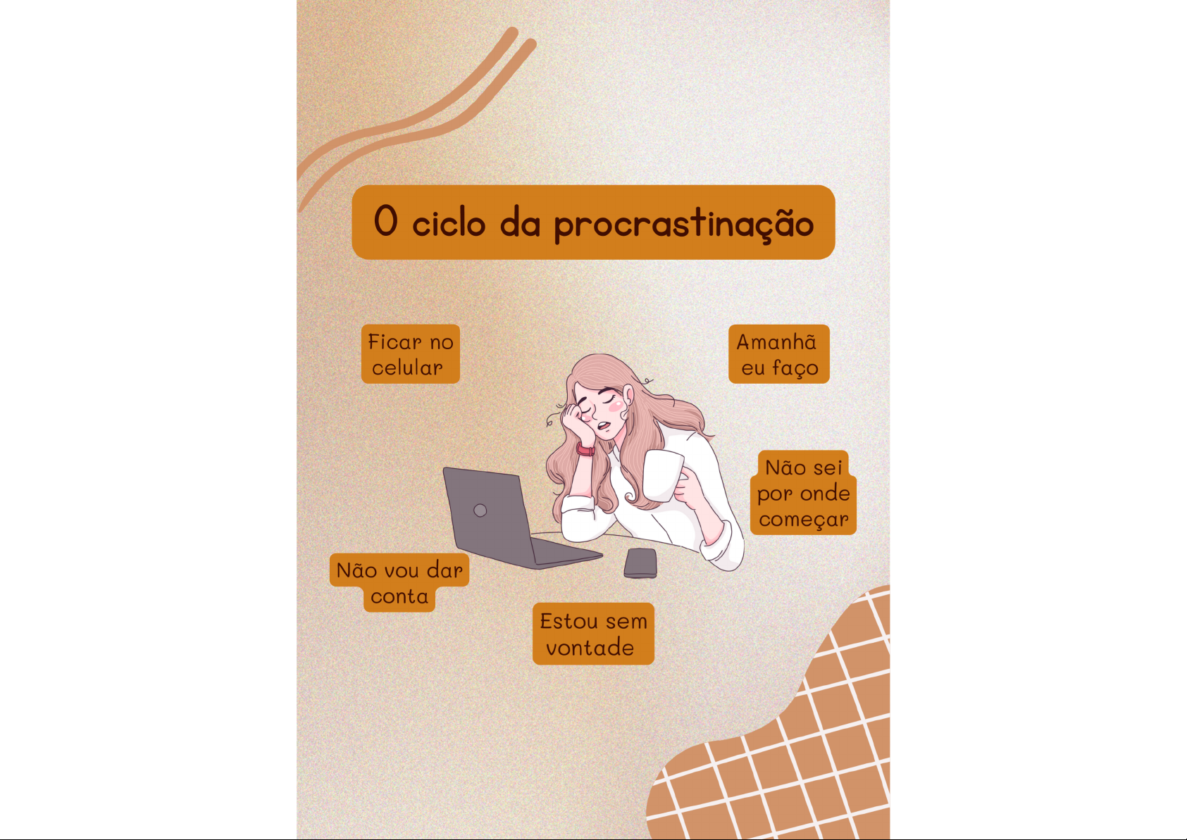 ciclo da procrastinação Ficar no Amanhã celular eu faço Não sei por onde começar Não vou dar conta Estou sem vontadeque é procrastinação? Basicamente procrastinar é adiar, deixar para fazer depois, ou seja, é um atraso voluntário de uma tarefa que se pretendia realizar. É importante lembrar que: PROCRASTINAR É UMA ESCOLHA. Nós temos controle dos nossos comportamentos, então adiar fazer algo é uma escolha. Mas, por que isso acontece?! 1) Lei de Parkinson: (Lei do esforço mínimo) Funciona assim: A Lei de Parkison diz que tendemos a preencher todo tempo dispo'nivel para a realização de uma tarefa.Por exemplo: Se você tem 4 dias para entregar um trabalho, você vai usar OS 4 dias para fazer ele. Porém, se você tiver apenas 4 horas você irá realizar nessas 4 horas. 2) Preguiça: Todo mundo sente preguiça, isso é natural. Não é todo dia que você acorda disposto e motivado. ser humano tem a tendência de evitar desconforto, por isso, muitas vezes tendemos a procratinar aquilo que é desagradável. 3) Suas crenças: Crença é a visão que você tem de si mesmo, dos outros e do mundo. Algumas crenças limitantes podem impedir você de começar algo. Por exemplo: Crenças de incapacidade: "Não vou conseguir." "Eu não sou capaz de fazer isso."4) Falta de organização e planejamento: É muito importante estabelecer um prazo de entrega e quais são OS passos necessários para conseguir realizar. 5) Falta de clareza dos seus objetivos: Por que é importante realizar essa tarefa? Quais são seus objetivos? Quais OS benefícios que você terá ao realizar? Sem objetivos claros e bem definidos, a tarefa não se torna tão importante.